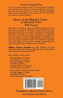 This version of Goodwin's text is the one enlarged in 1899 from its original 1860 form. The aim of this paperback edition is to make the work available to new generations of Greek scholars who should find its comprehensiveness, clarity and its profusion of specific examples from the major Greek authors a valuable source of reference.