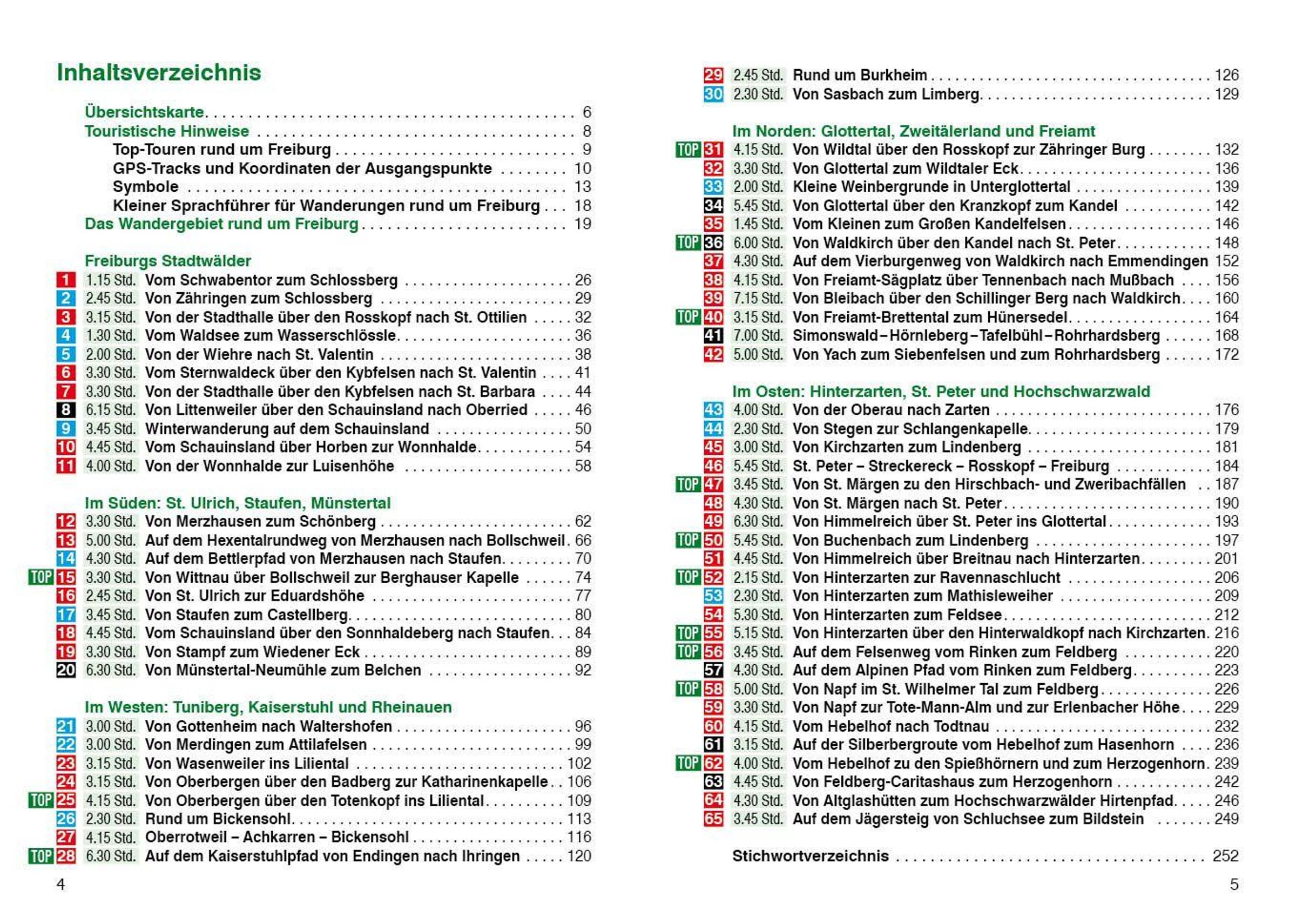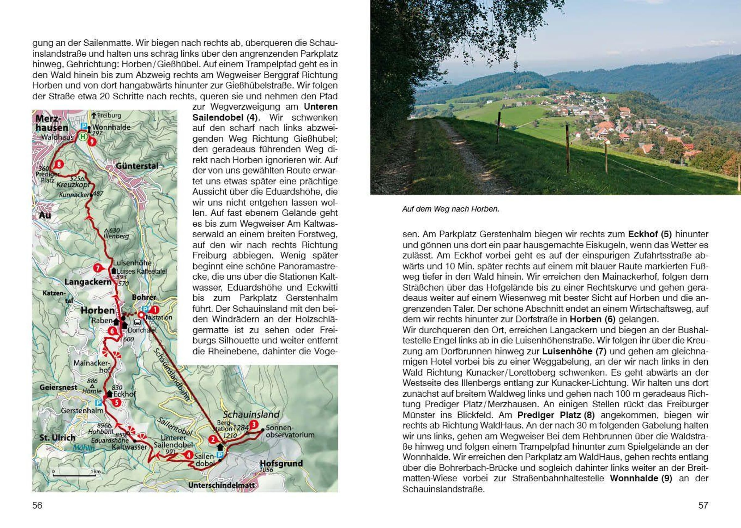 Der Hochschwarzwald nimmt einen Schwerpunkt bei der Tourenauswahl ein, Aufstiege zum Feldberg und zum Herzogenhorn zählen zu den Highlights, ebenso die Routen durch wilde, ungeordnete Bannwaldgebiete und Wildbach-Schluchten. Zu den Lieblings-Wandergebieten der Freiburger zählt der Kaiserstuhl. Ausflüge in die mit Obstbäumen und Weinreben gefüllten Täler im Markgräfler Land führen bis zur Nachbarstadt Staufen.