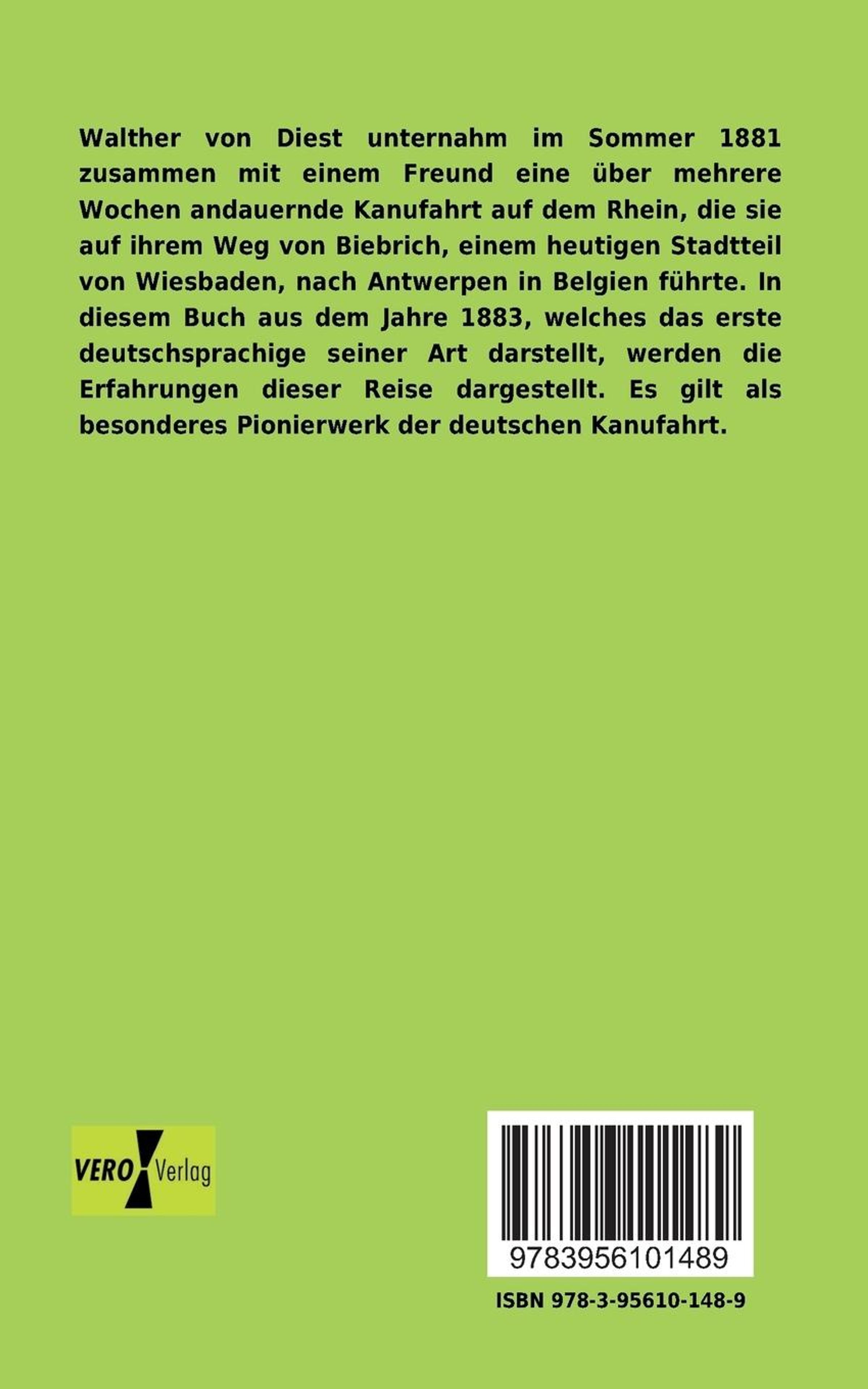 Walther von Diest unternahm im Sommer 1881 zusammen mit einem Freund eine über mehrere Wochen andauernde Kanufahrt auf dem Rhein, die sie auf ihrem Weg von Biebrich, einem heutigen Stadtteil von Wiesbaden, nach Antwerpen in Belgien führte. In diesem Buch aus dem Jahre 1883, welches das erste deutschsprachige seiner Art darstellt, werden die Erfahrungen dieser Reise dargestellt. Es gilt als besonderes Pionierwerk der deutschen Kanufahrt.