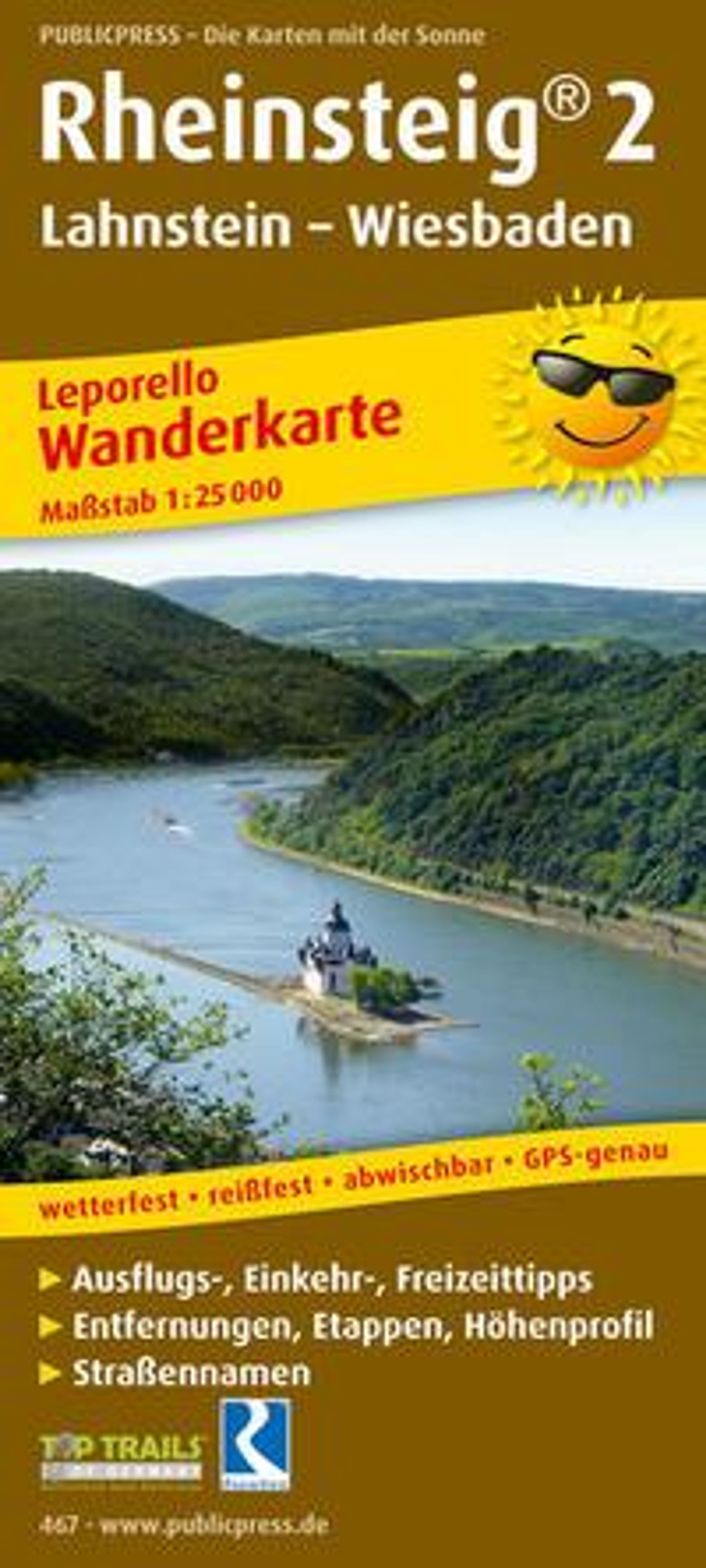 Die Wanderkarte beschreibt den zweiten Teil des Premiumwanderweges von Lahnstein bei Koblenz bis Wiesbaden im Leporello-Format. Die 172, 5 km führen naturnah am rechtsrheinischen Ufer entlang; auch auf schmalen Pfaden in angrenzende Wälder und Weinberge durch die Regionen Mittelrhein und Rheingau. Welche Sehenswürdigkeiten außer der Loreley noch auf diesem Weg locken, erfährt man in den bebilderten Infoblöcken, die zwischen den Kartenabschnitte eingefügt sind.