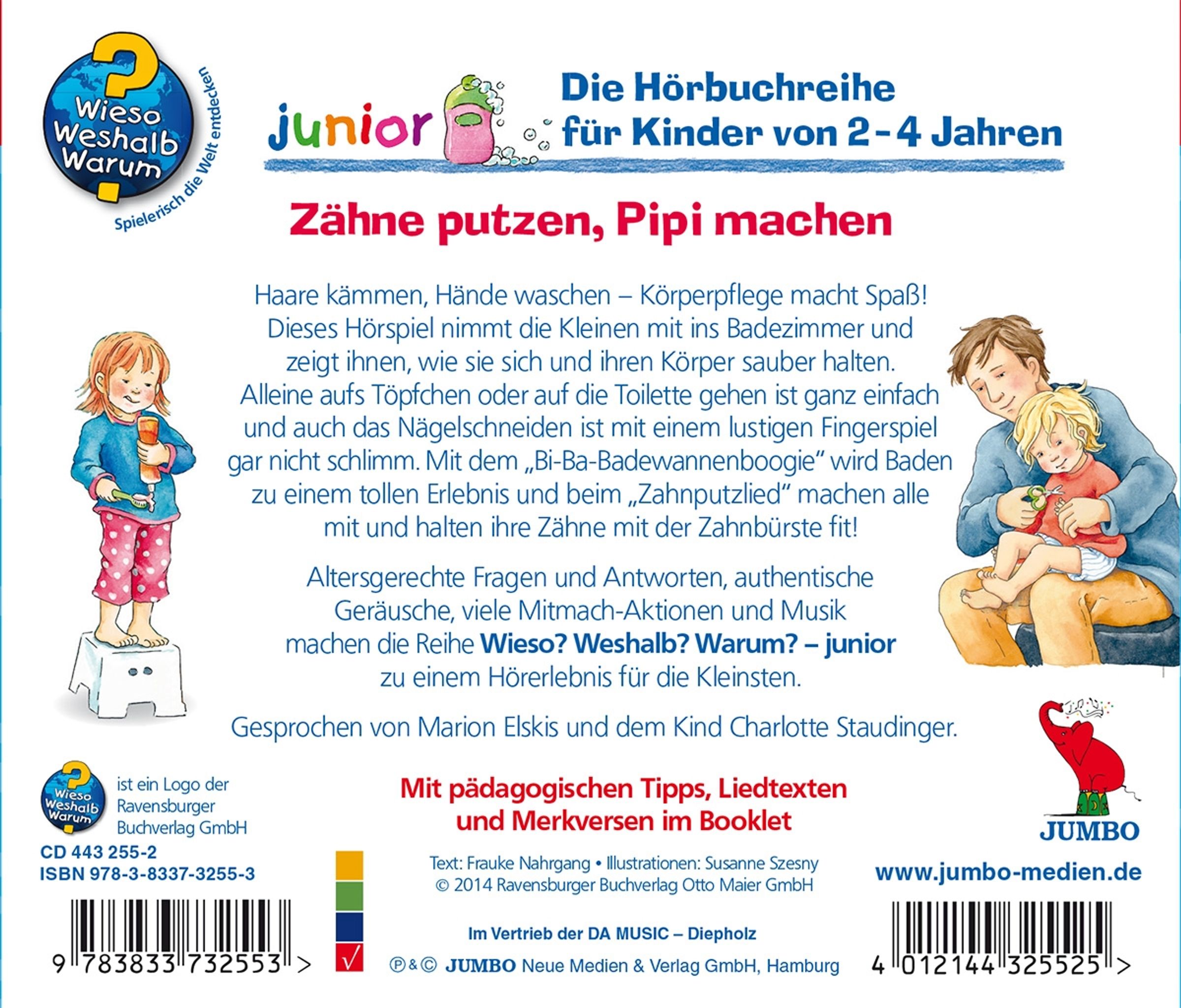 Körperpflege macht Spaß! Wie die Kleinen alleine aufs Töpfchen oder auf die Toilette gehen, wie sie sich richtig die Hände waschen, was beim Haareschneiden passiert und dass Zähneputzen kinderleicht ist, erklärt dieses Hörbuch. Gleichzeitig werden klare und verständliche Antworten darauf gegeben, warum Körperpflege und Hygiene so wichtig sind. Und mit passenden Liedern und Reimen geht alles noch leichter. Altersgerechte Fragen und Antworten, authentische Geräusche, viele Mitmach-Aktionen und Musik machen die Reihe "Wieso? Weshalb? Warum? junior" zu einem Hörerlebnis für die Kleinsten. Das gleichnamige Buch von Frauke Nahrgang und Susanne Szesny ist im Ravensburger Buchverlag erschienen.