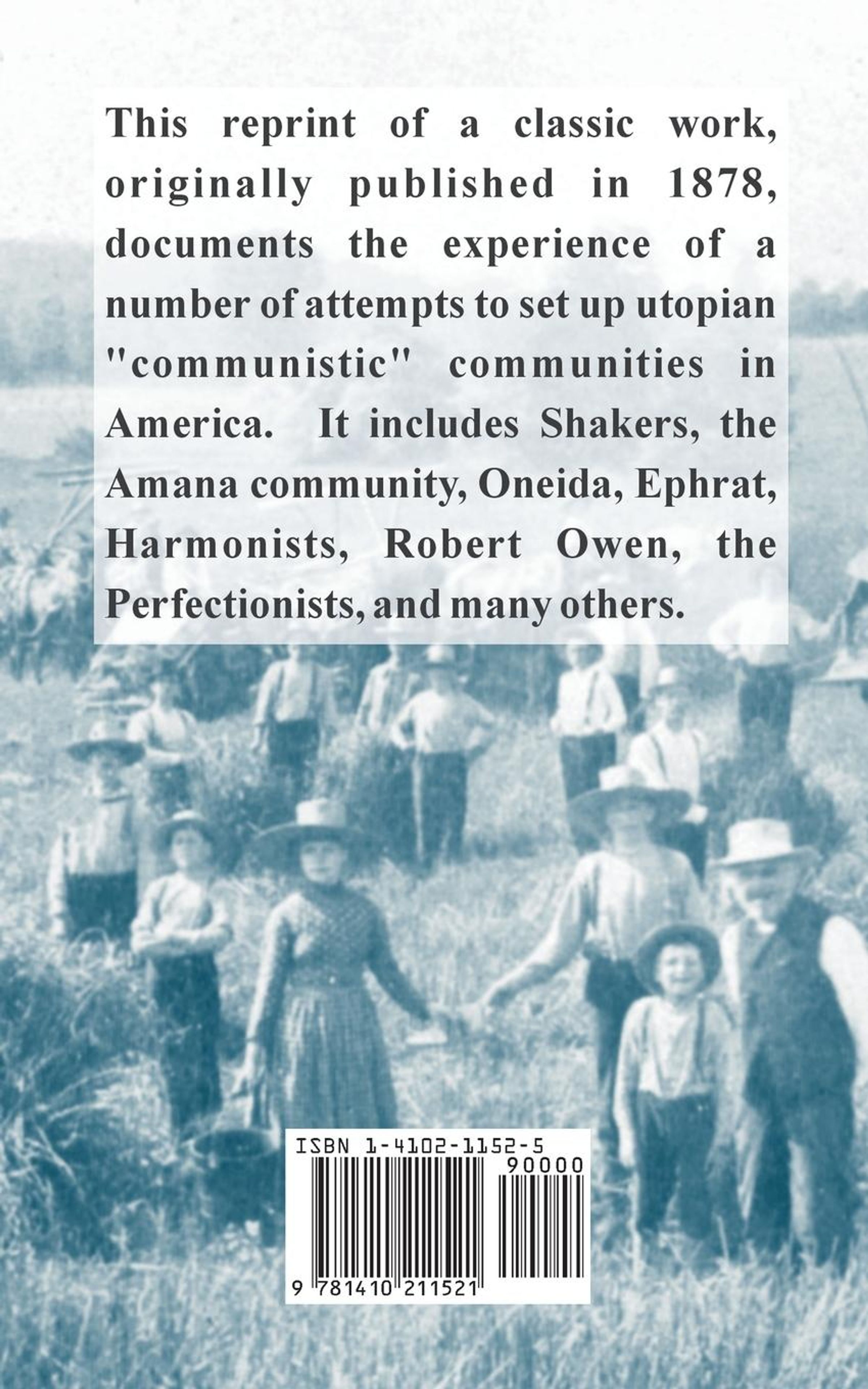 This reprint of a classic work, originally published in 1878, documents the experience of a number of attempts to set up utopian "communistic" communities in America. It includes Shakers, the Amana community, Oneida, Ephrat, Harmonists, Robert Owen, the Perfectionists, and many others.