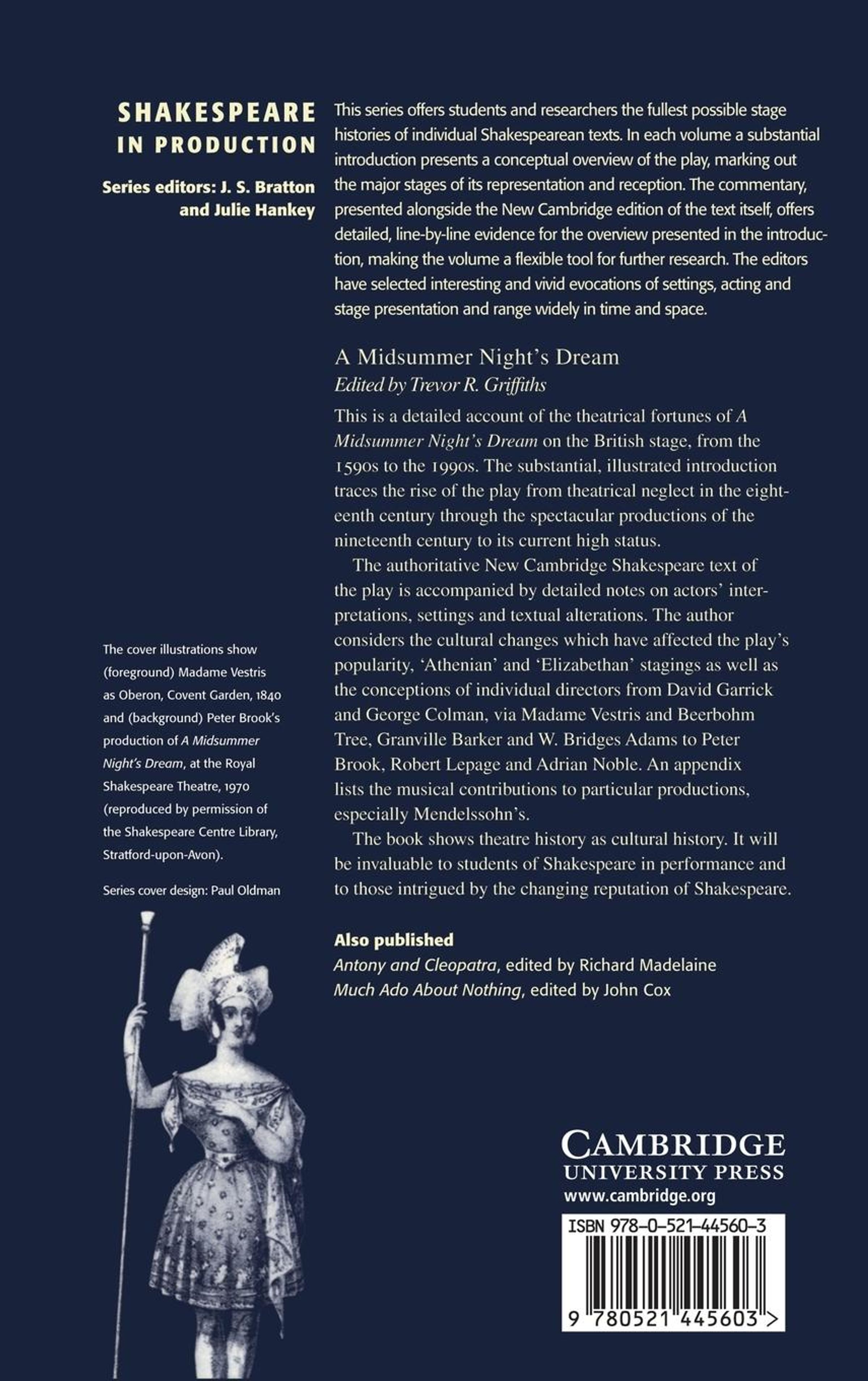 This is a detailed account of the theatrical fortunes of A Midsummer Night's Dream on the British stage, from the 1590s to the 1990s. The substantial, illustrated introduction traces the rise of the play from theatrical neglect in the eighteenth century through the spectacular productions of the nineteenth century to its current high status. The authoritative New Cambridge Shakespeare text of the play is accompanied by notes on actors' interpretations, settings and textual alterations. The author considers the cultural changes which have affected the play's popularity as well as the conceptions of individual directors from David Garrick and George Colman, via Madame Vestris and Beerbohm Tree, Granville Barker and W. Bridges Adams to Peter Brook, Robert Lepage and Adrian Noble. The book shows theatre history as cultural history. It will be invaluable to students of Shakespeare in performance at graduate level, working in departments of English or drama / theatre and to those intrigued by the changing reputation of Shakespeare.