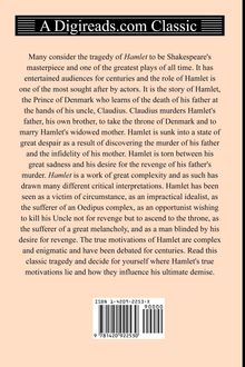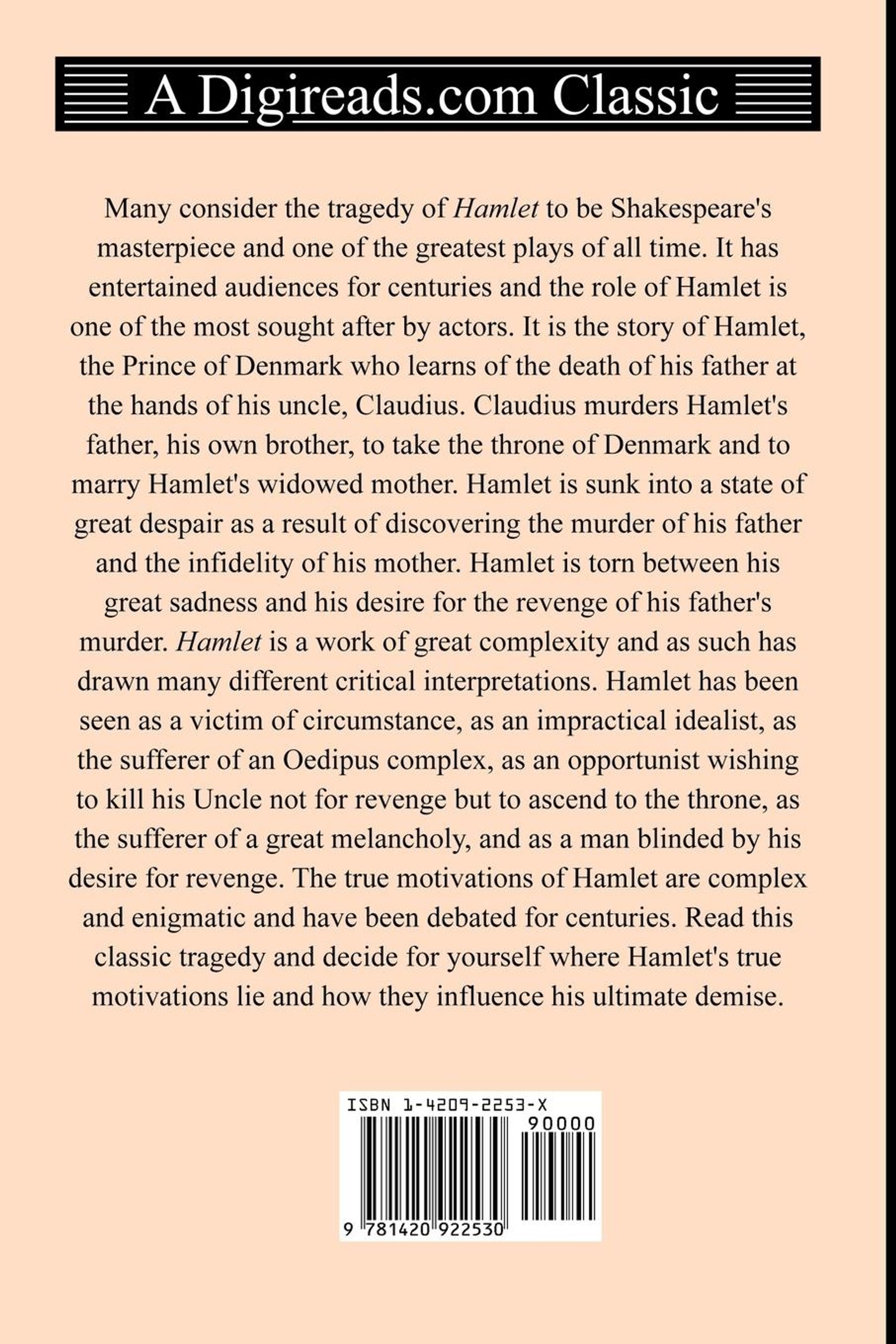 Many consider the tragedy of "Hamlet" to be Shakespeare's masterpiece and one of the greatest plays of all time. It has entertained audiences for centuries and the role of Hamlet is one of the most sought after by actors. It is the story of Hamlet, the Prince of Denmark who learns of the death of his father at the hands of his uncle, Claudius. Claudius murders Hamlet's father, his own brother, to take the throne of Denmark and to marry Hamlet's widowed mother. Hamlet is sunk into a state of great despair as a result of discovering the murder of his father and the infidelity of his mother. Hamlet is torn between his great sadness and his desire for the revenge of his father's murder. "Hamlet" is a work of great complexity and as such has drawn many different critical interpretations. Hamlet has been seen as a victim of circumstance, as an impractical idealist, as the sufferer of an Oedipus complex, as an opportunist wishing to kill his Uncle not for revenge but to ascend to the throne, as the sufferer of a great melancholy, and as a man blinded by his desire for revenge. The true motivations of Hamlet are complex and enigmatic and have been debated for centuries. Read this classic tragedy and decide for yourself where Hamlet's true motivations lie and how they influence his ultimate demise.