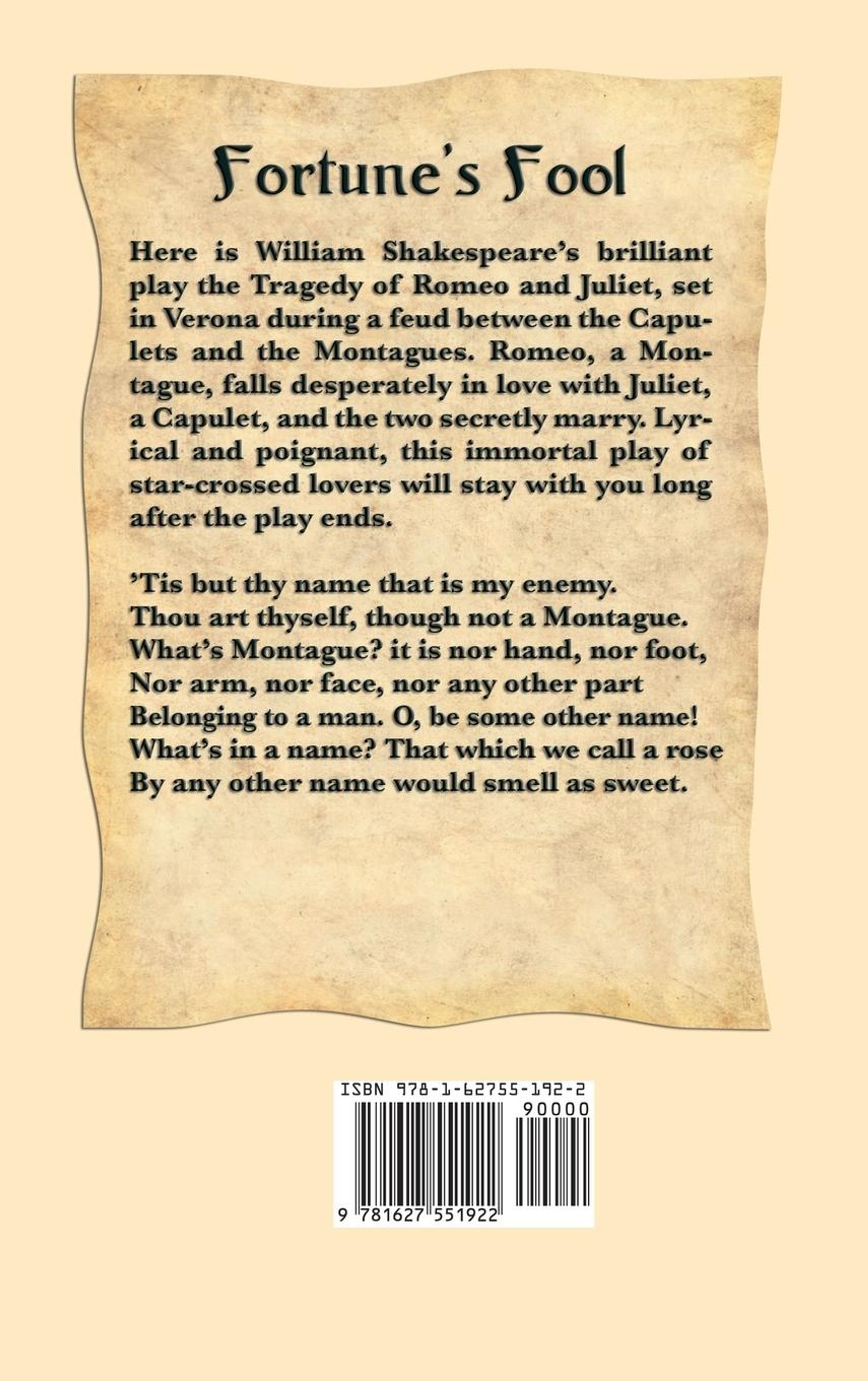 Fortune's Fool Here is William Shakespeare's brilliant play the Tragedy of Romeo and Juliet, set in Verona during a feud between the Capulets and the Montagues. Romeo, a Montague, falls desperately in love with Juliet, a Capulet, and the two secretly marry. Lyrical and poignant, this immortal play of star-crossed lovers will stay with you long after the play ends.