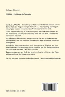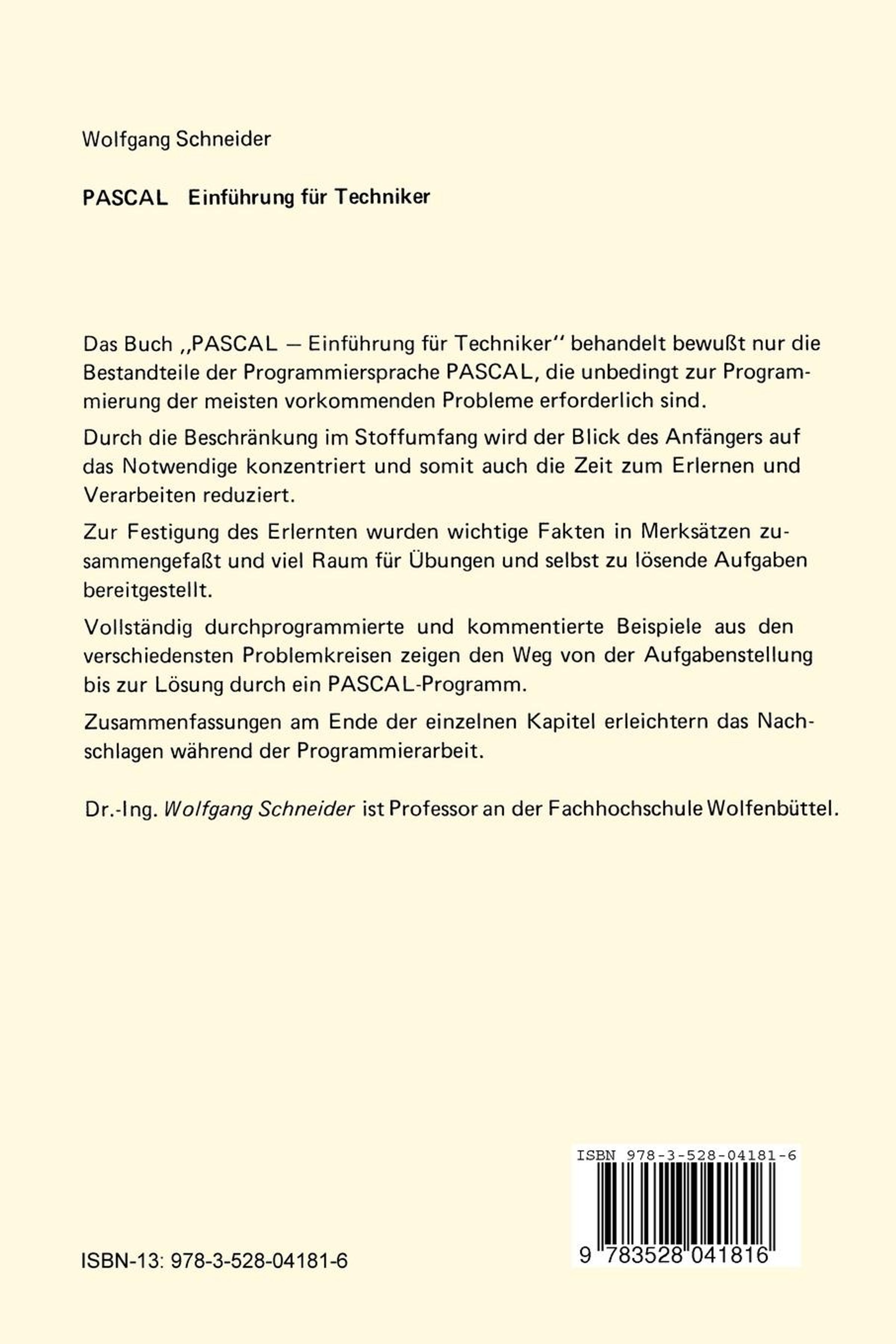 1 Grundlagen der Datenverarbeitung.- 1.1 Der Begriff der Datenverarbeitung.- 1.2 Die Arbeitsweise einer Datenverarbeitungsanlage (DVA).- 2 Programmiersprachen.- 2.1 Allgemeines.- 2.2 Maschinensprachen.- 2.3 Assemblersprachen.- 2.4 Problemorientierte Programmiersprachen.- 2.5 Die strukturierte Programmiersprache PASCAL.- 3 Problemaufbereitung.- 4 Darstellung von Programmabläufen.- 4.1 Programmablaufpläne.- 4.2 Struktogramme.- 4.3 Übungsaufgaben.- 5 Schreiben von PASCAL-Primärprogrammen.- 5.1 Allgemeine Regeln zum Schreiben von PASCAL-Primärprogrammen.- 5.1.1 Programmstruktur.- 5.1.2 Schreibregeln.- 5.2 Zusammenfassung.- 6 PASCAL-Sprachelemente.- 6.1 PASCAL-Zeichenvorrat.- 6.2 Konstanten.- 6.3 Variablen.- 6.3.1 Variablennamen.- 6.3.2 Indizierte Variablen.- 6.3.3 Felder.- 6.4 Arithmetische Operationszeichen.- 6.5 Standardfunktionen.- 6.6 Zusammenfassung.- 6.7 Übungsaufgaben.- 7 Der PASCAL-Vereinbarungsteil.- 7.1 Der Programmkopf.- 7.2 Der Vereinbarungsblock.- 7.2.1 Anweisungsnummernvereinbarungsteil.- 7.2.2 Konstantenvereinbarungsteil.- 7.2.3 Variablenvereinbarungsteil.- 7.2.4 Feldvereinbarung.- 7.3 Zusammenfassung.- 7.4 Übungsaufgaben.- 8 Die arithmetische Zuordnungsanweisung.- 8.1 Der arithmetische Ausdruck.- 8.2 Die Rangordnung arithmetischer Operatoren.- 8.3 Klammerausdrücke.- 8.4 Arithmetische Ausdrücke mit Standardfunktionen.- 8.5 Vorzeichen.- 8.6 Die allgemeine Form der arithmetischen Zuordnungsanweisung (Ergibtanweisung).- 8.7 Die Typzuordnung bei arithmetischen Zuordnungsanweisungen.- 8.8 Zusammenfassung.- 8.9 Übungsaufgaben.- 9 Ein- und Ausgabeanweisung.- 9.1 Eingabeanweisungen.- 9.2 Ausgabeanweisungen.- 9.2.1 Die WRITE-Anweisung.- 9.2.2 Die WRITELN-Anweisung.- 9.2.3 Das Ausgabeformat.- 9.2.4 Ausgabe von kommentierenden Texten.- 9.2.5 Der Zeilenvorschub.- 9.2.6 Steuerung des Schnelldruckers.- 9.3 Zusammenfassung.- 9.4 Übungsaufgaben.- 10 Steueranweisungen.- 10.1 Beginn- und Beendungsanweisungen.- 10.2 Sprunganweisung.- 10.3 Programmverzweigungsanweisungen.- 10.3.1 Einseitige Programmverzweigungsanweisung.- 10.3.2 Zweiseitige Programmverzweigungsanweisung.- 10.3.3 Mehrfachverzweigungsanweisung.- 10.4 Schleifenanweisungen.- 10.4.1 Die FOR-Schleifenanweisung.- 10.4.2 Die REPEAT-Schleifenanweisung.- 10.4.3 Die WHILE-Schleifenanweisung.- 10.5 Zusammenfassung.- 10.6 Übungsaufgaben.- 11 Kommentare im Programm.- 12 Fehlerbehandlung.- 12.1 Syntaxfehler.- 12.2 Ablauffehler.- 12.3 Logische Fehler.- 13 Vollständig programmierte Beispiele.- 13.1 Phasenwinkelberechnung.- 13.2 Zinseszins- und Rentenrechnung.- 13.3 Berechnung von quadratischen Gleichungen.- 13.4 Wechselkursberechnung.- 13.5 Raketenzuverlässigkeit.- 13.6 Berechnung der Zuchtzeit von Bazillen.- 13.7 Bremswegberechnung.- 13.8 Bremswegkurve.- 13.9 Statistik.- 13.10 Computergrafik.- 14 Lösungen der Übungsaufgaben.- Sachwortverzeichnis.