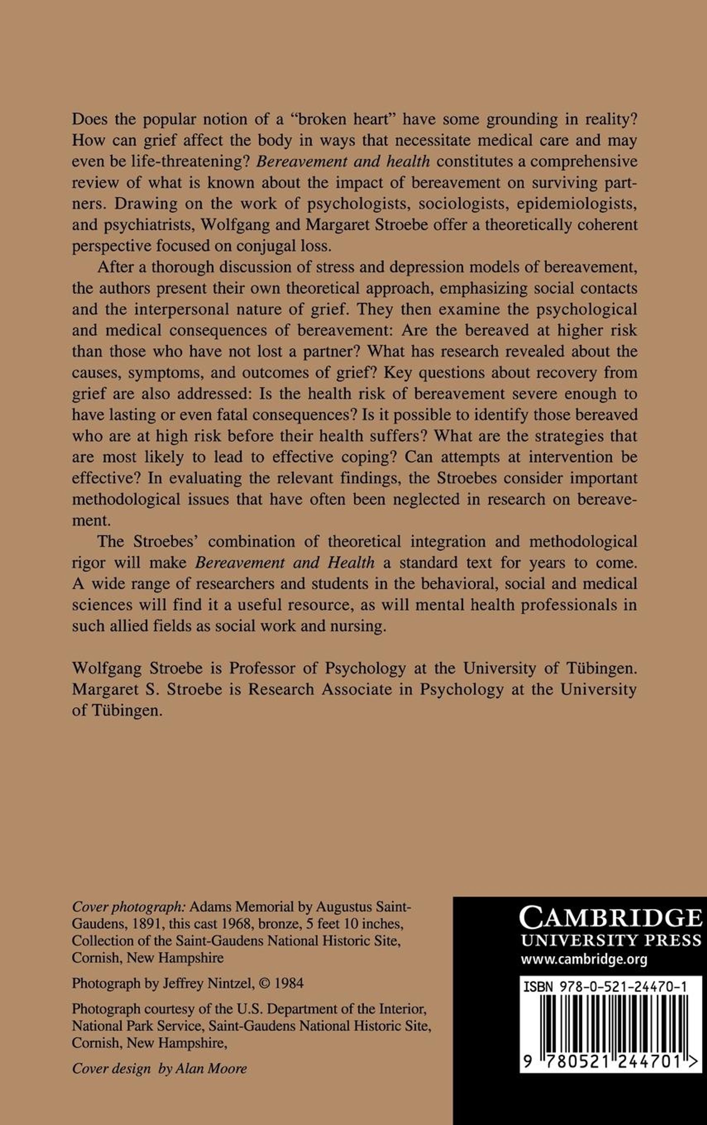 Does the popular notion of a 'broken heart' have some grounding in reality? How can grief affect the body in ways that necessitate medical care and may even be life-threatening? Bereavement and Health constitutes a comprehensive review of what is known about the impact of bereavement on surviving partners. Drawing on the work of psychologists, sociologists, epidemiologists, and psychiatrists, Wolfgang and Margaret Stroebe offer a theoretically coherent perspective focused on conjugal loss. After a thorough discussion of stress and depression models of bereavement, the authors present their own theoretical approach, emphasizing social contacts and the interpersonal nature of grief. They then examine the psychological and medical consequences of bereavement: Are the bereaved at higher risk than those who have not lost a partner? What has research revealed about the causes, symptoms, and outcomes of grief? Key questions about recovery from grief are also addressed: Is the health risk of bereavement severe enough to have lasting or even fatal consequences? Is it possible to identify those bereaved who are at high risk before their health suffers? What are the strategies that are most likely to lead to effective coping? Can attempts at intervention be effective? The Stroebes' combination of theoretical integration and methodological rigor will make Bereavement and Health a standard text for years to come.