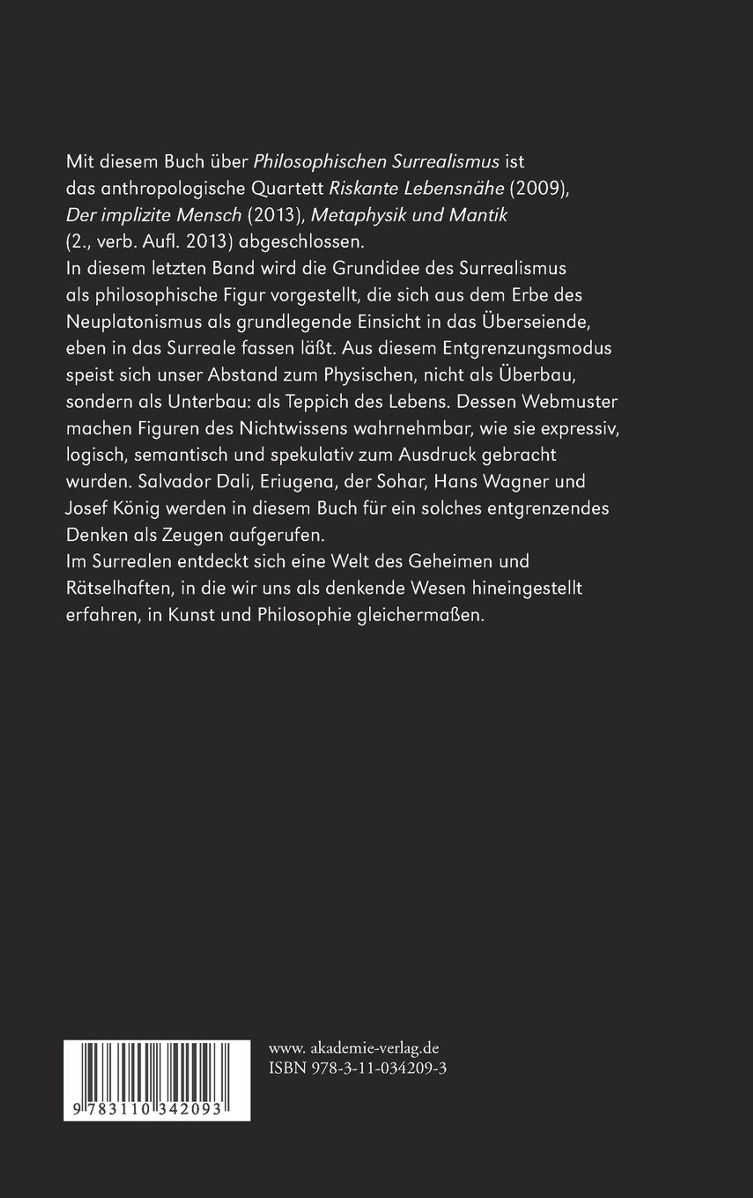 Mit diesem Buch über Philosophischen Surrealismus ist das anthropologische Quartett Riskante Lebensnähe (2009; engl. Risky Proximity to Life , 2010), Der implizite Mensch (2013), Metaphysik und Mantik(2., verb. Auflage 2013) abgeschlossen. In diesem letzten Band wird die Grundidee des Surrealismus als philosophische Figur vorgestellt, die sich aus dem Erbe des Neuplatonismus als grundlegende Einsicht in das Überseiende, eben in das Surreale fassen läßt. Aus diesem Entgrenzungsmodus speist sich unser Abstand zum Physischen, nicht als Überbau, sondern als Unterbau: als Teppich des Lebens. Dessen Webmuster machen Figuren des Nichtwissens wahrnehmbar, wie sie expressiv, logisch, semantisch und spekulativ zum Ausdruck gebracht wurden. Salvador Dali, Eriugena, der Sohar, Hans Wagner und Josef König werden in diesem Buch für ein solches entgrenzendes Denken als Zeugen aufgerufen. Im Surrealen entdeckt sich eine Welt des Geheimen und Rätselhaften, in die wir uns als denkende Wesen hineingestellt erfahren, in Kunst und Philosophie gleichermaßen.