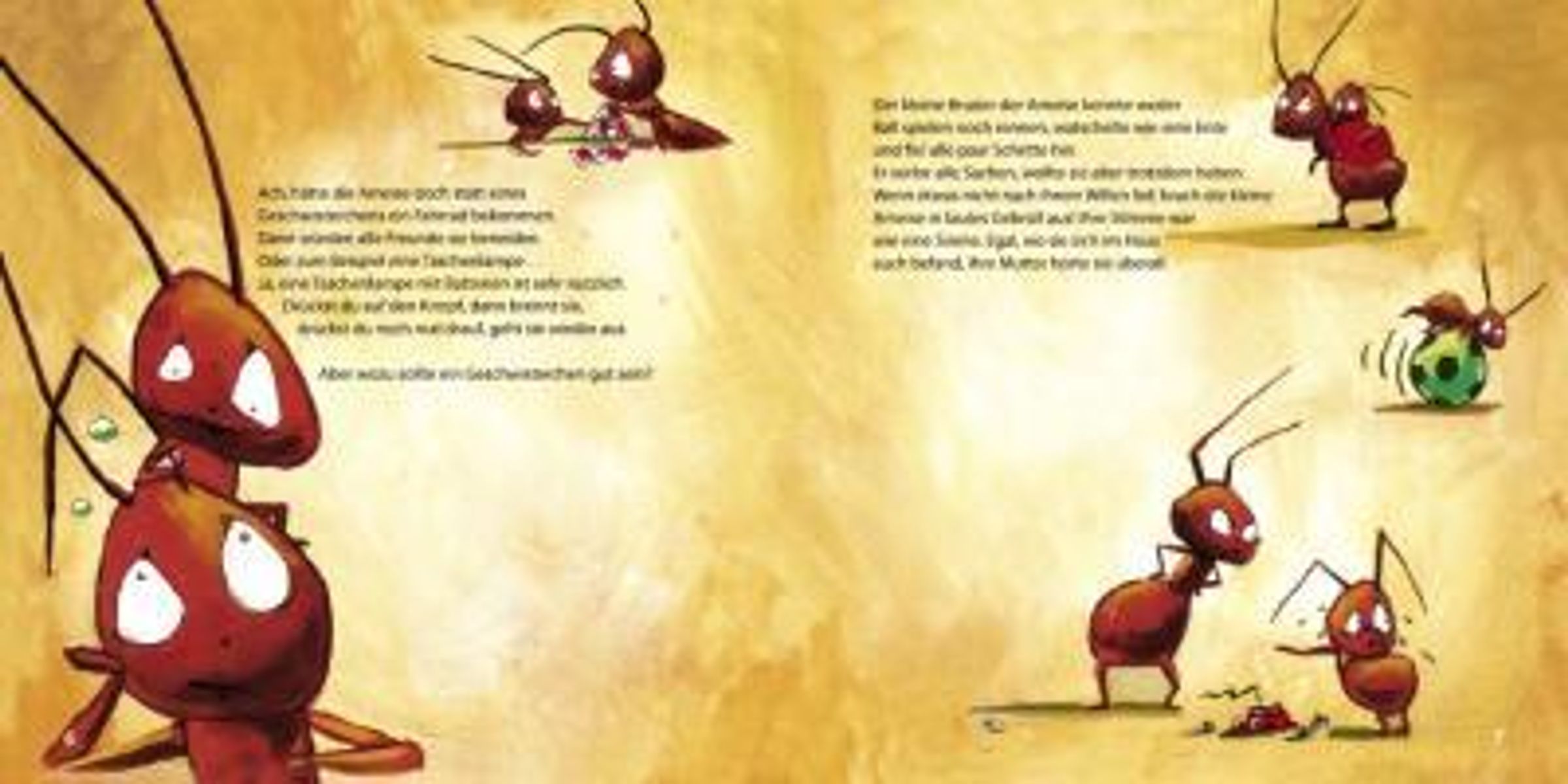 Bis vor kurzem war das Leben der kleinen Ameise noch in bester Ordnung. Aber jetzt ist da auf einmal dieses kleine Geschwisterchen. Und kleine Geschwister -das weiß doch jeder- können ganz schön nervig sein. Sie können weder Fußball spielen noch rennen, fangen wegen jeder Kleinigkeit an zu heulen und wollen immer alles haben, obwohl sie es ja doch nur verlieren oder kaputt machen.