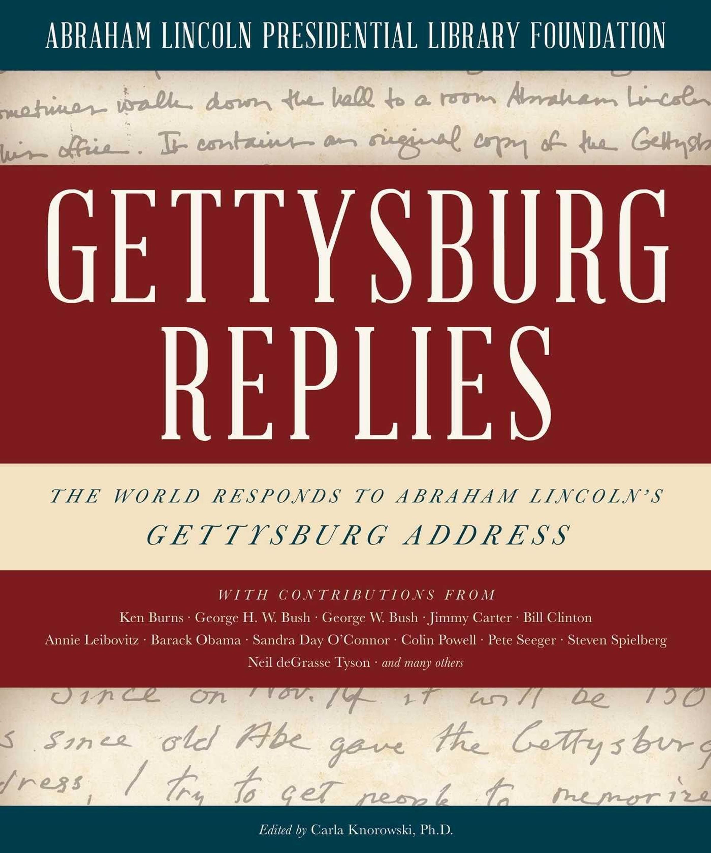 For Gettysburg Replies, the Abraham Lincoln Presidential Library and Museum challenged presidents, judges, historians, filmmakers, poets, actors, and others to craft 272 words of their own to celebrate Lincoln, the Gettysburg Address, or a related topic that stirs their passions. President Jimmy Carter reveals how the Gettysburg Address helped bring Egypt and Israel closer at the Camp David Peace Accords. Supreme Court Justice Sandra Day O'Connor reflects on Lincoln's dedication to the importance of civic education. General Colin Powell explains how Martin Luther King Jr. took up Lincoln's mantle and carried it forward. Filmmaker Steven Spielberg touches on the benefits and perils of hero worship. Poet Laureate Billy Collins explores the dichotomy between the private man who wrote poetry ("My Childhood Home I See Again") and the president who stood before all. Attorney Alan Dershowitz echoes Lincoln's words to rally us to the freedom from weapons of mass destruction.