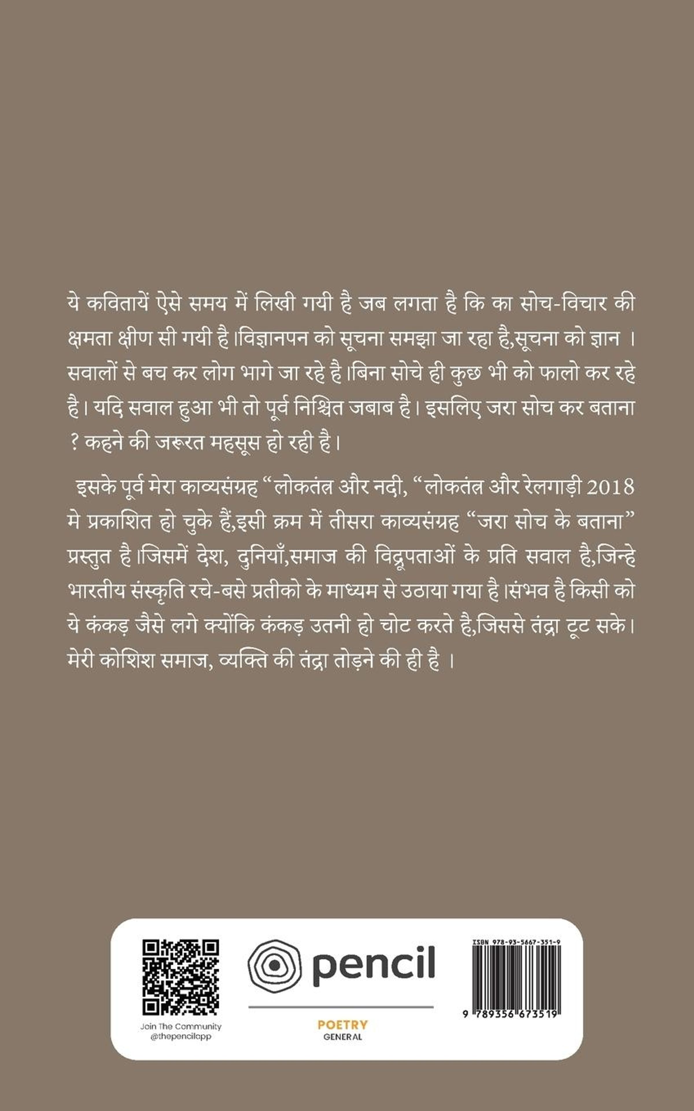 ये कवितायें ऐसे समय में लिखी गयी है जब लगता है कि का सोच-विचार की क्षमता क्षीण सी गयी है।विज्ञानपन को सूचना समझा जा रहा है,सूचना को ज्ञान । सवालों से बच कर लोग भागे जा रहे है।बिना सोचे ही कुछ भी को फालो कर रहे है। यदि सवाल हुआ भी तो पूर्व निश्चित जबाब है। इसलिए जरा सोच कर बताना ? कहने की जरूरत महसूस हो रही है। इसके पूर्व मेरा काव्यसंग्रह "लोकतंत्र और नदी, "लोकतंत्र और रेलगाड़ी 2018 मे प्रकाशित हो चुके हैं,इसी क्रम में तीसरा काव्यसंग्रह "जरा सोच के बताना" प्रस्तुत है।जिसमें देश, दुनियाँ,समाज की विद्रूपताओं के प्रति सवाल है,जिन्हे भारतीय संस्कृति रचे-बसे प्रतीको के माध्यम से उठाया गया है।संभव है किसी को ये कंकड़ जैसे लगे क्योंकि कंकड़ उतनी हो चोट करते है,जिससे तंद्रा टूट सके। मेरी कोशिश समाज, व्यक्ति की तंद्रा तोड़ने की ही है ।
