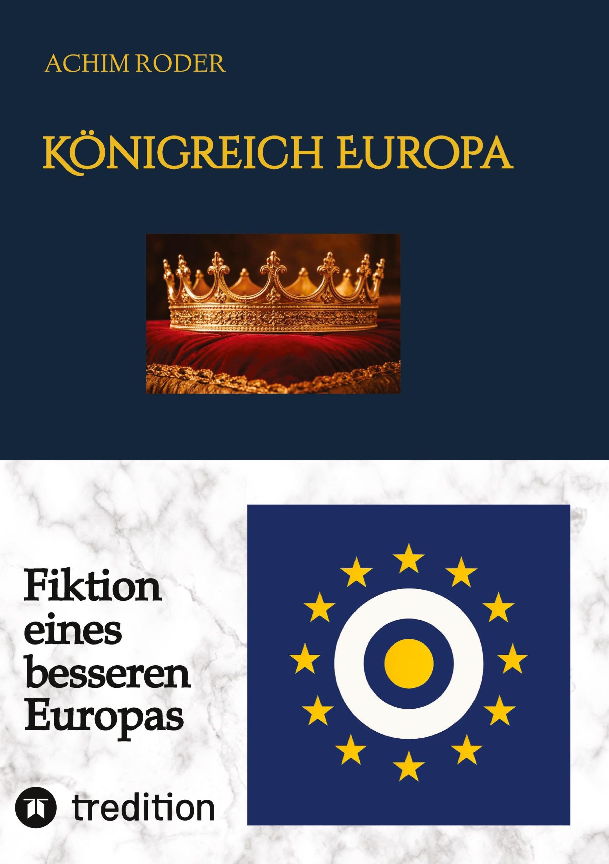 „KÖNIGREICH EUROPA“, „Fiktion eines besseren Europas“. Eine goldene Krone auf rotem Samtkissen und ein Logo mit Sternen., Buch
