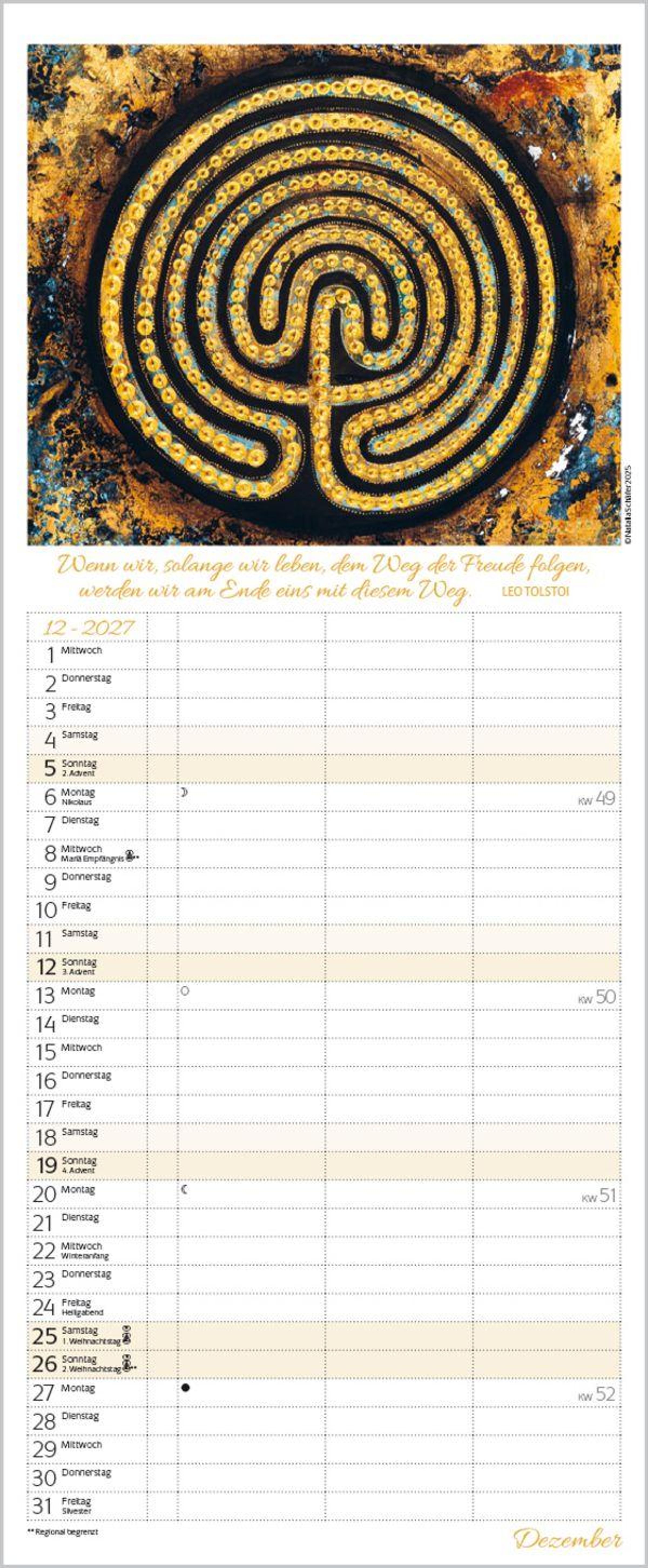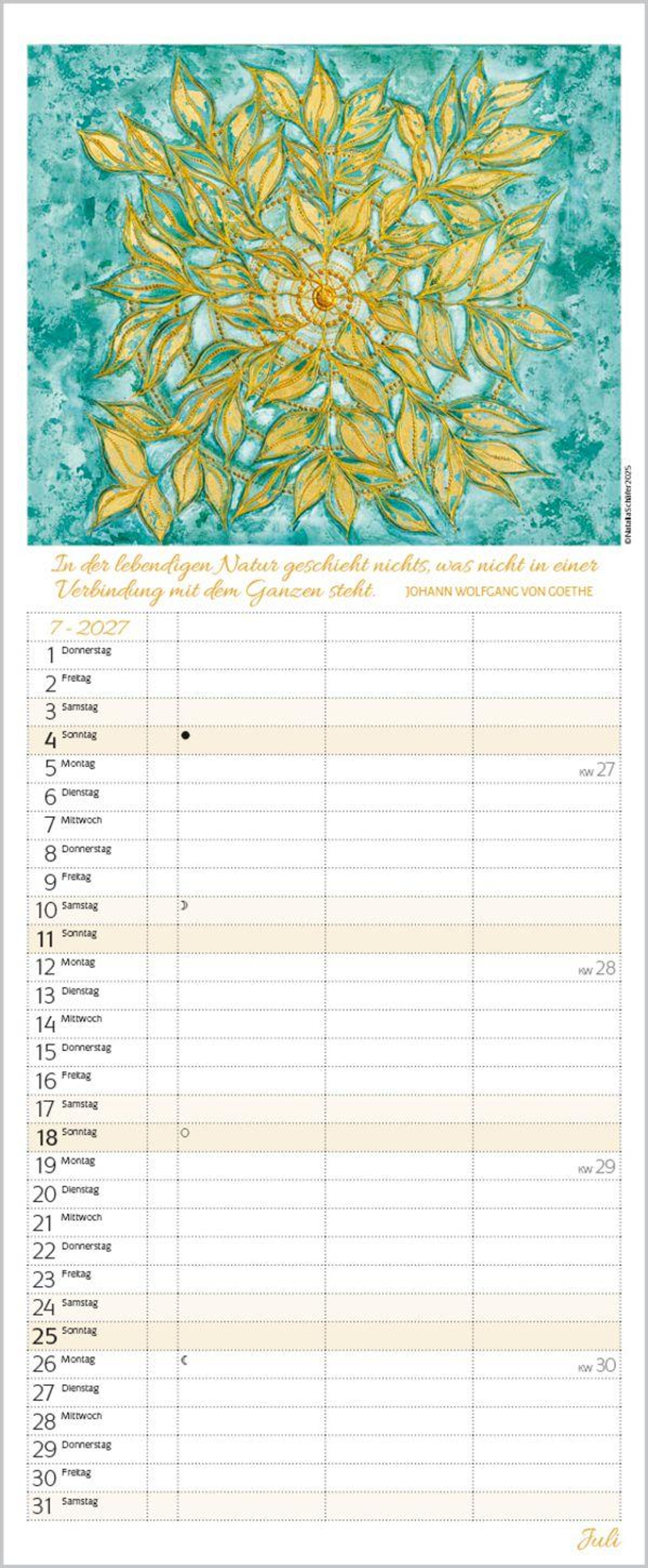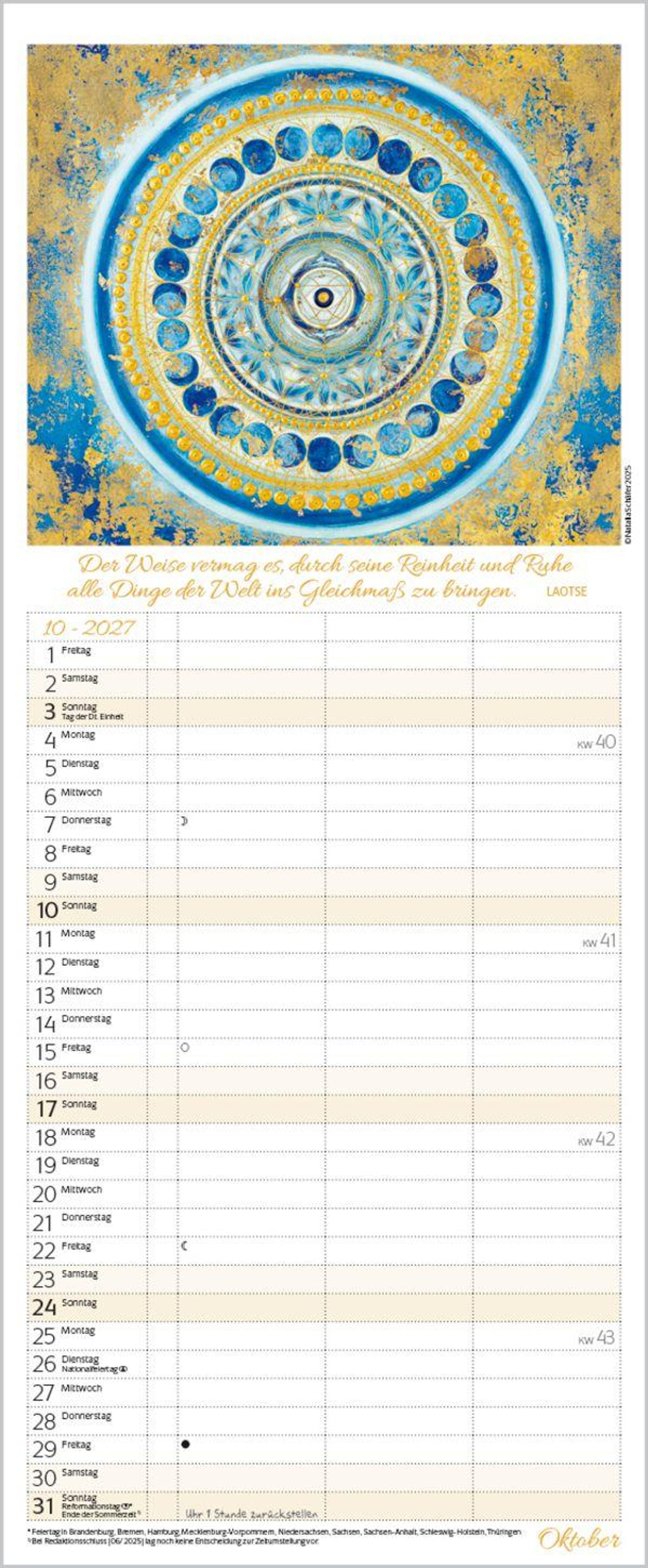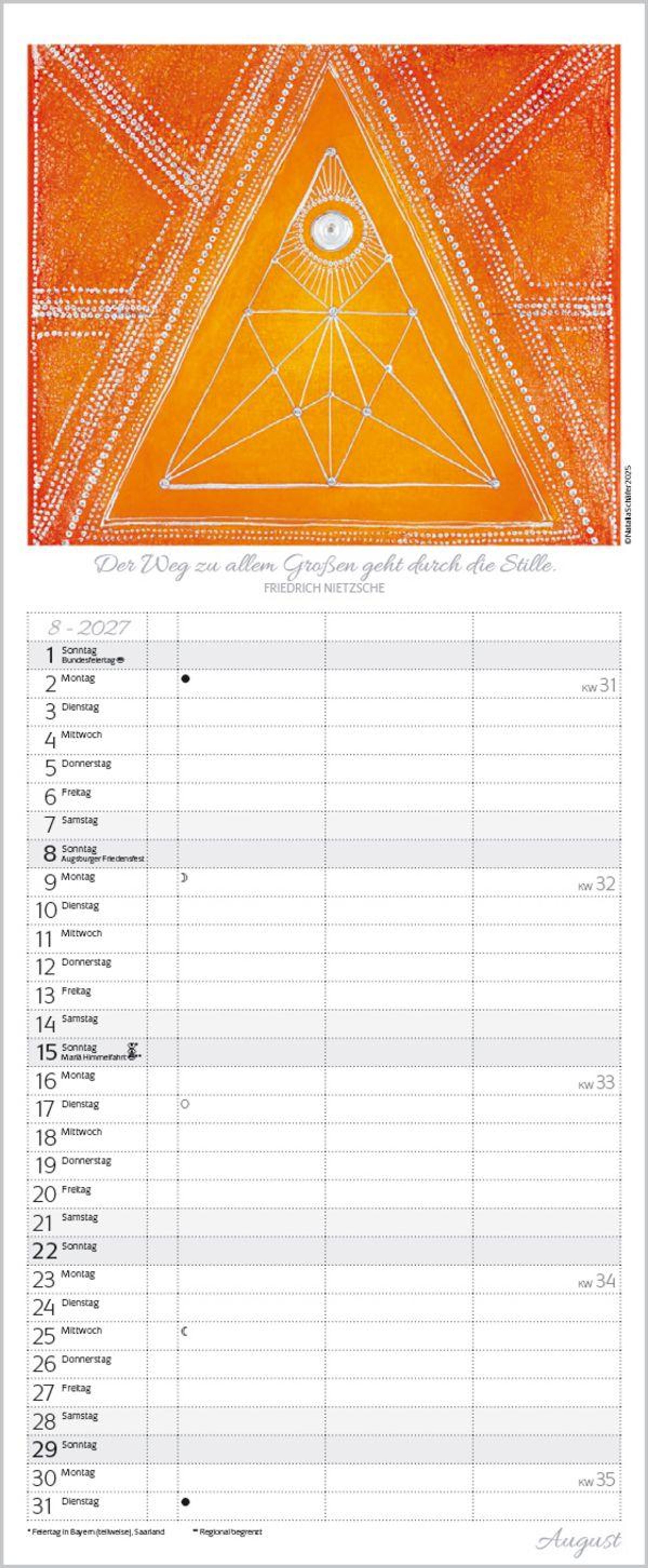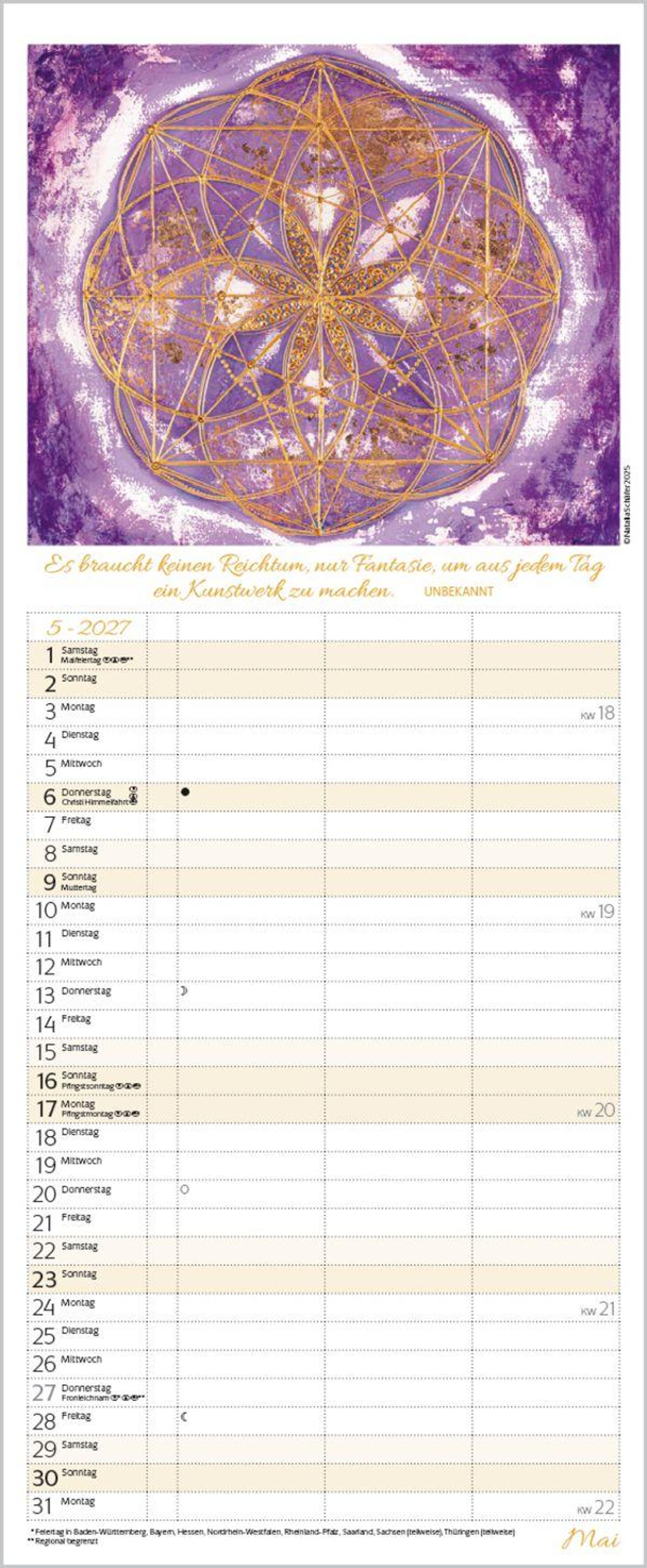 Weitere Informationen wie Mondphasen , Ferientermine und Feiertage (auch regionale) sowie deutlich lesbare Kalenderwochen runden den Kalender ab und sorgen für einen vollständigen Überblick Ihres Jahres.