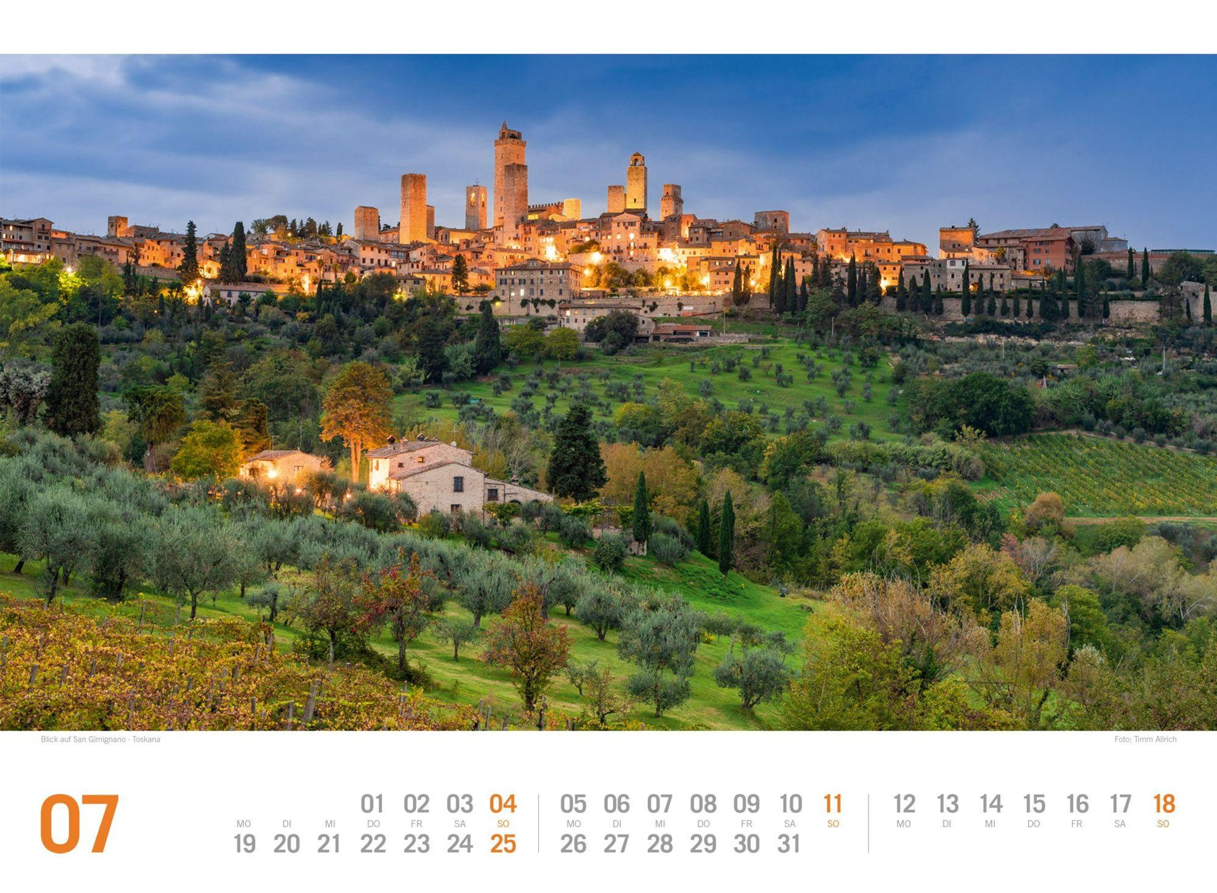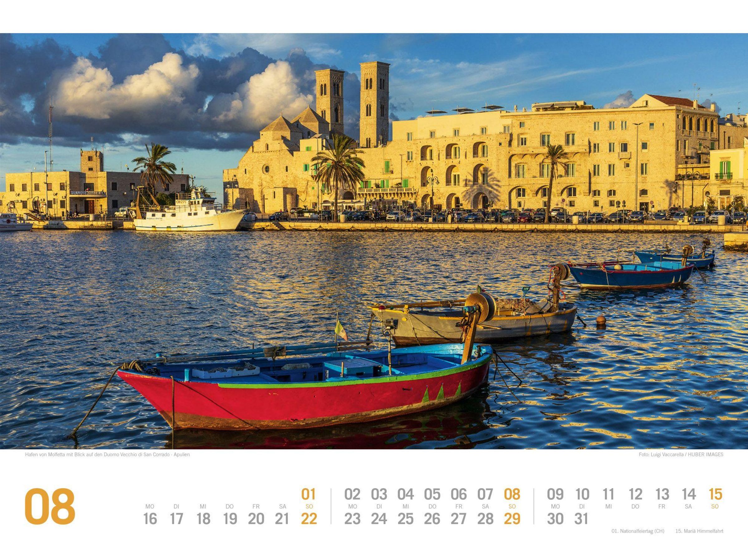 Das Land, in dem die Zitronen blühen, ist der Inbegriff südlichen Charmes und ein konstanter Anziehungspunkt für Kulturliebende. Mit einer spannenden Historie, idyllischen Dörfern und herrlichen Landschaften ist Italien an Vielseitigkeit kaum zu übertreffen. Wer die mediterrane Lebensart mit ihrer grandiosen Küche und romantischen Architektur liebt, für den klingen Toskana, Cinque Terre, Venedig oder Sizilien immer wie Musik in den Ohren. Wir erinnern Sie ein ganzes Jahr daran, dass Italien nur wenige Autostunden entfernt ist und auf Sie wartet.