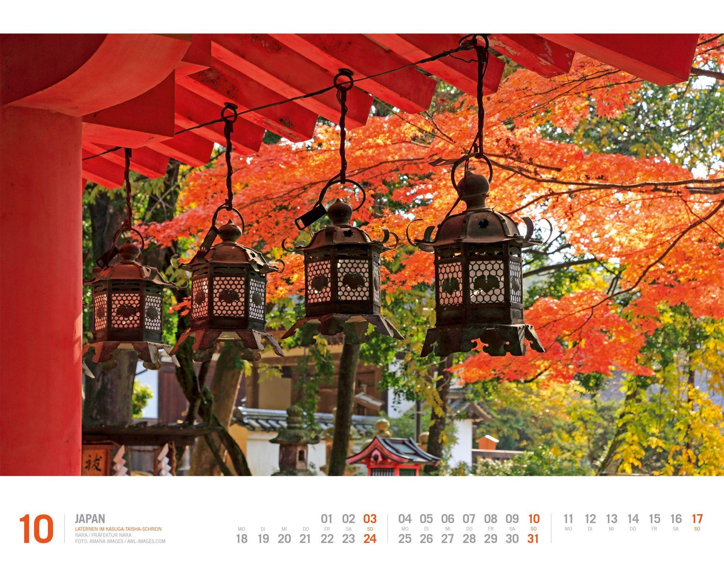 Zwischen Zen und dem Zauber der aufgehenden Sonne: Japan fasziniert mit einer spirituellen Kultur, alten Traditionen, stimmungsvollen Landschaften und einer außergewöhnlichen Architektur. Heilige Orte, Tempel und Schreine zeugen von der Wichtigkeit von Shintoismus und Buddhismus im Alltag und transportieren die Ruhe und besondere Energie der fernöstlichen Lebensart. Ein Kalender, der nicht nur an fremde Orte, sondern auch zu innerer Einkehr führt.