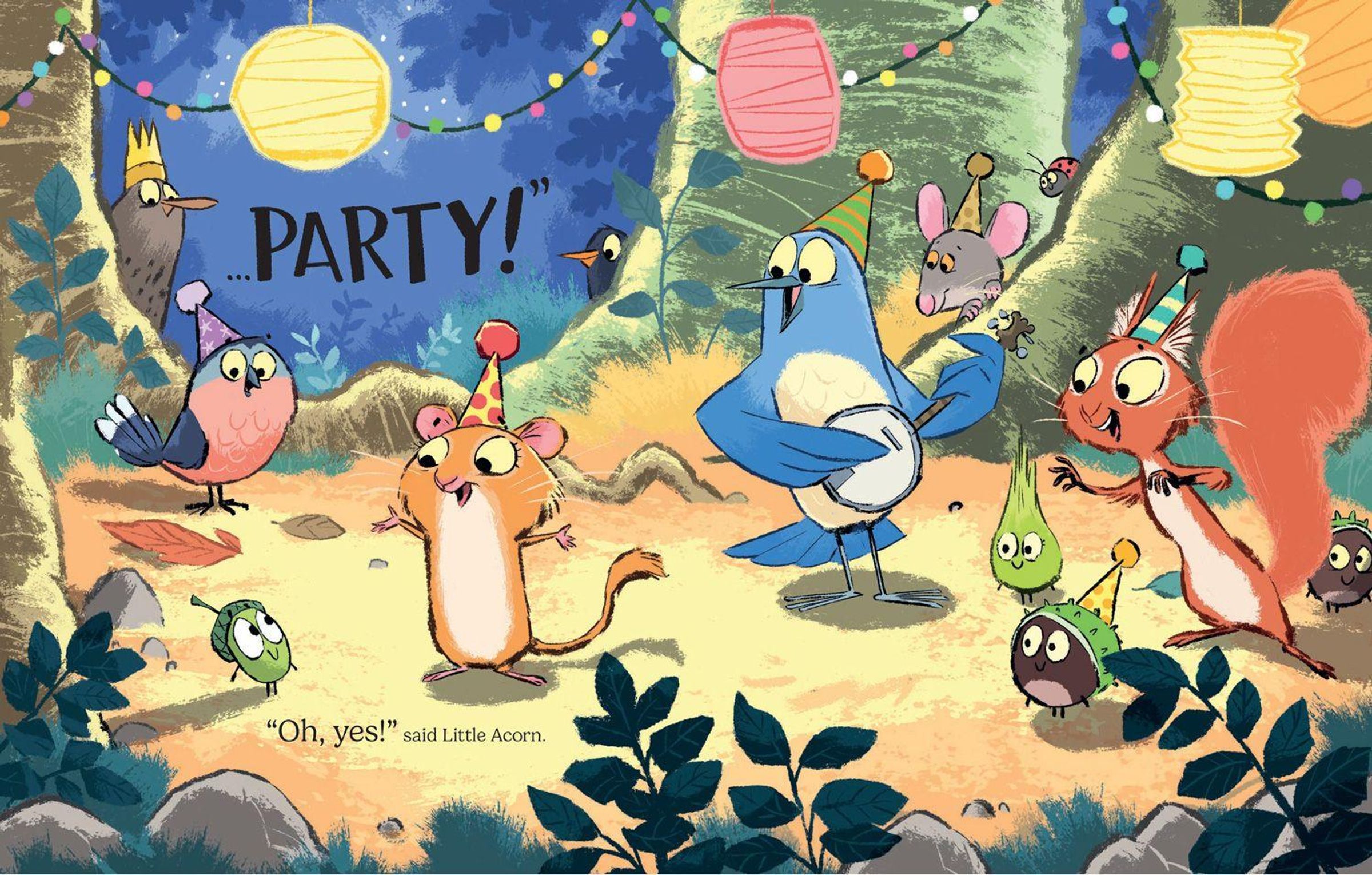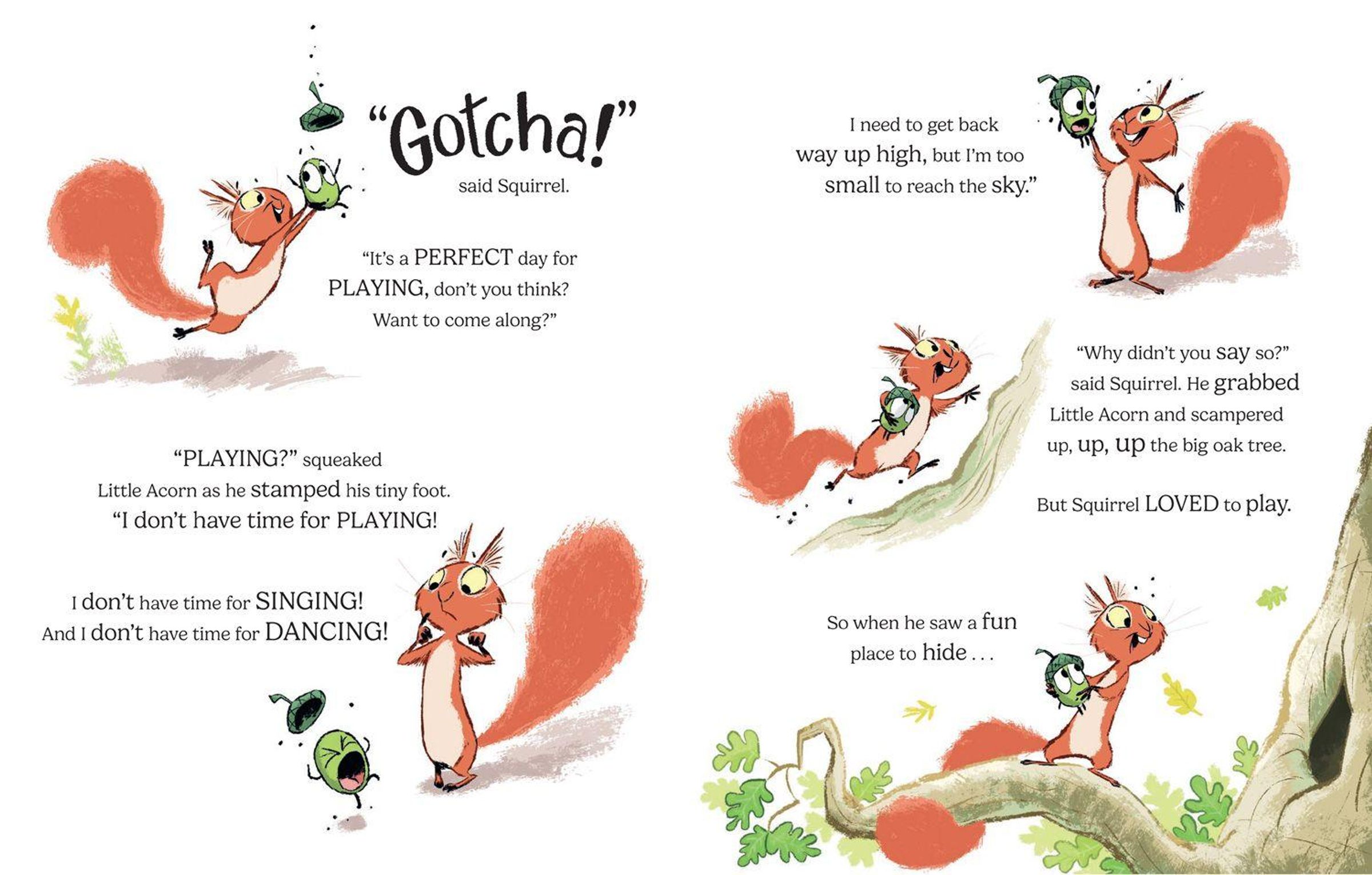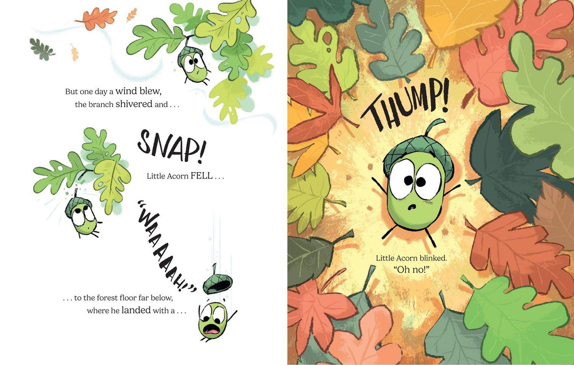 Way up high in the treetops, sleeps a happy little acorn. Until one day, he falls to the forest floor with a THUMP!