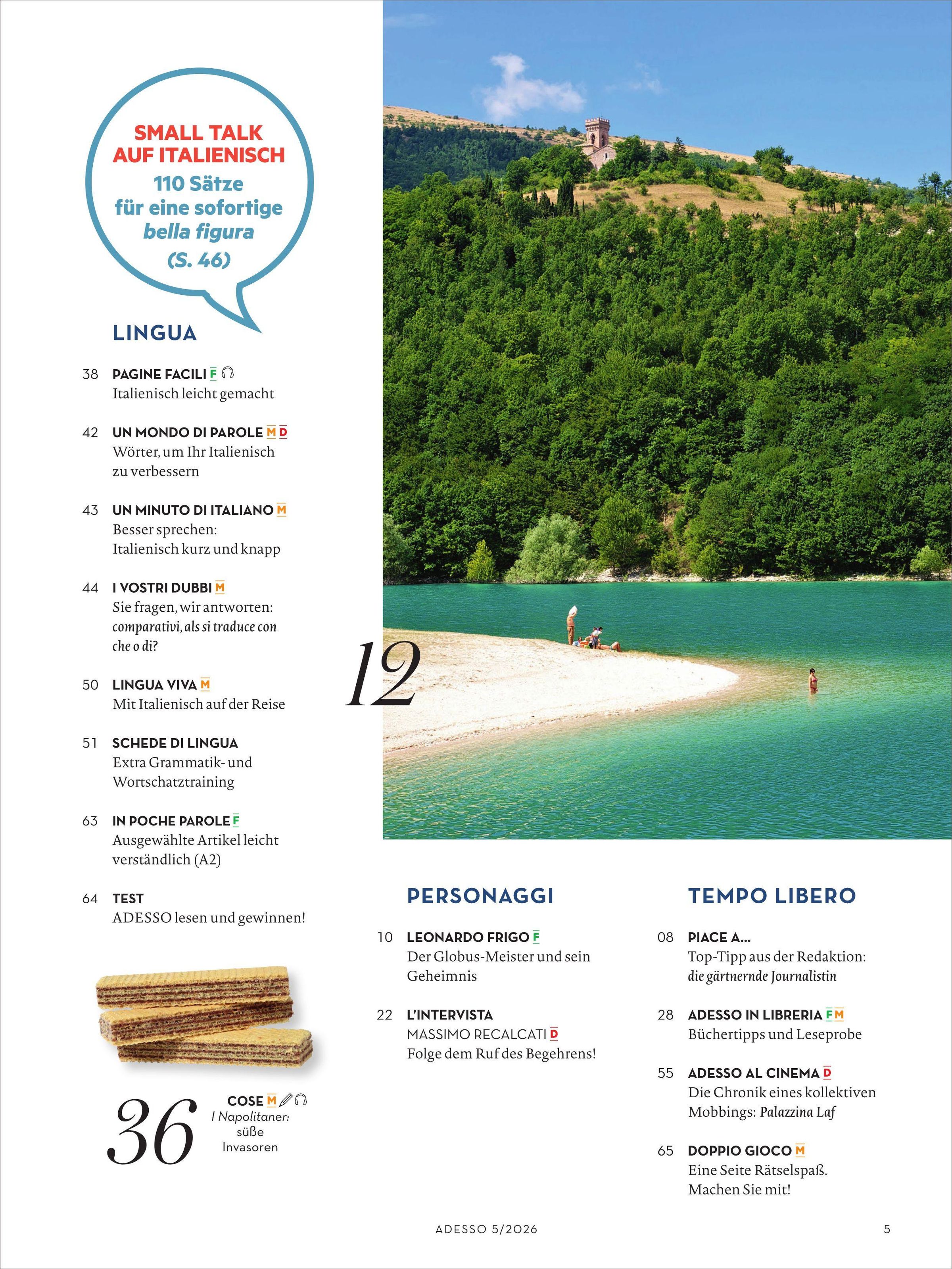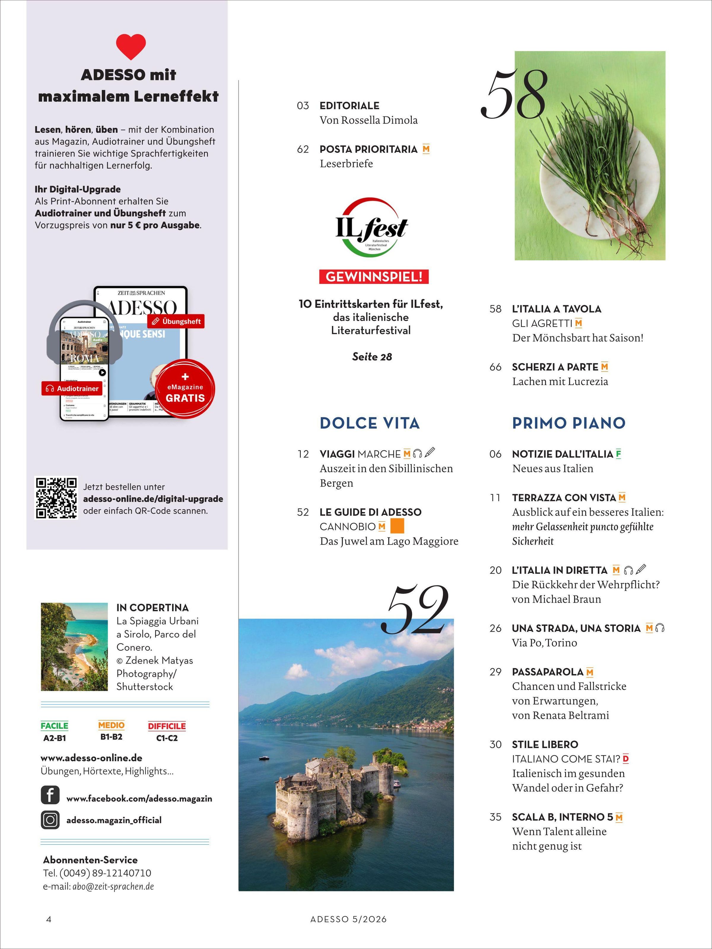 * Titelthema: Marche - Exotische Strände und wilde Berge: Frühlingszauber in den Marken! * Le Guide di Adesso: Cannobio. Das Juwel am Lago Maggiore * L'Italia a Tavola: Gli agretti. Der Mönchsbart hat Saison! * Stile Libero: Italiano, come stai? Italienisch im gesunden Wandel oder in Gefahr?