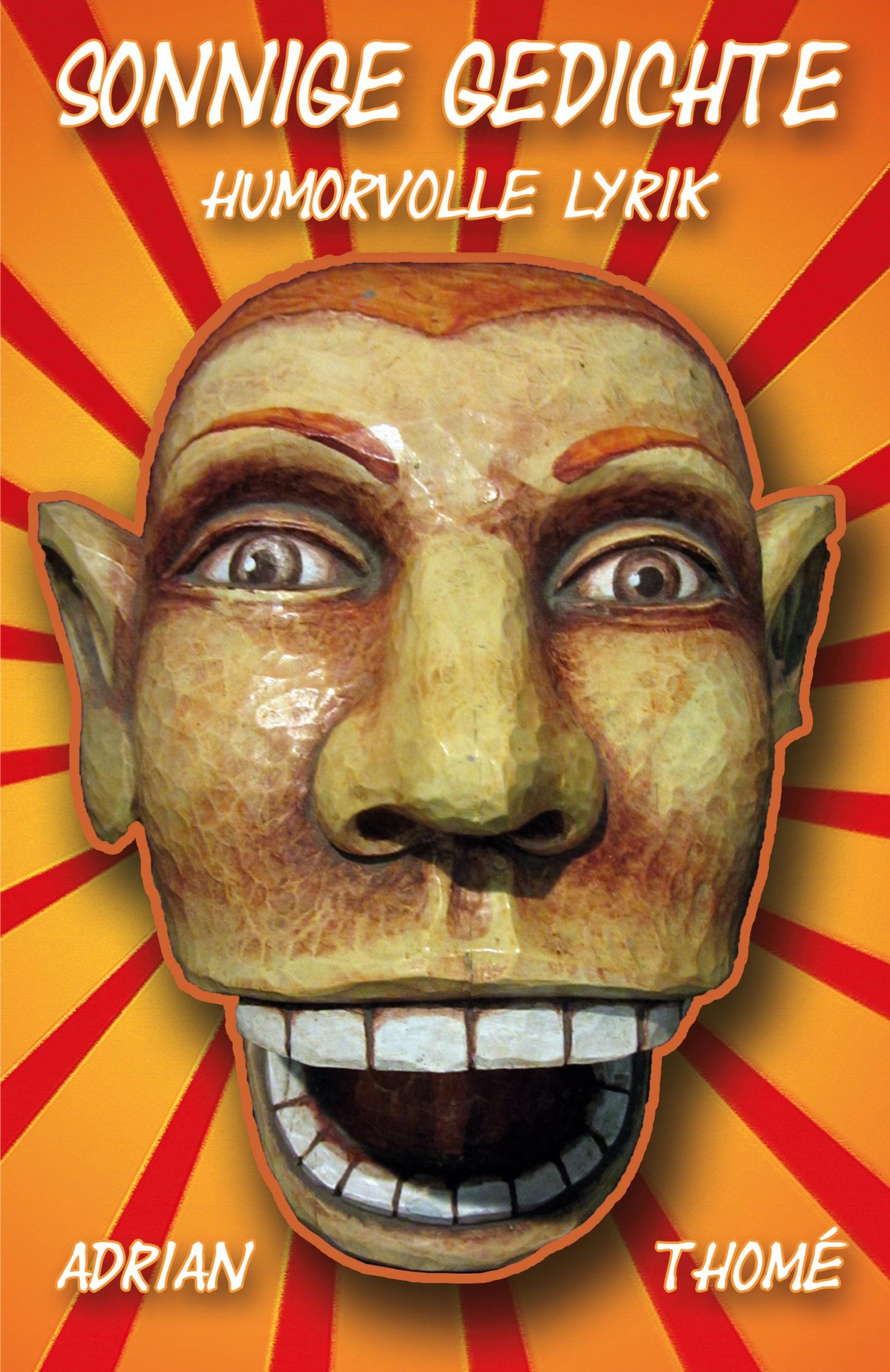 Text: „SONNIGE GEDICHTE, HUMORVOLLE LYRIK, ADRIAN THOMÉ“. Eine fröhliche, maskenhafte Illustration mit strahlenden Streifen., Buch