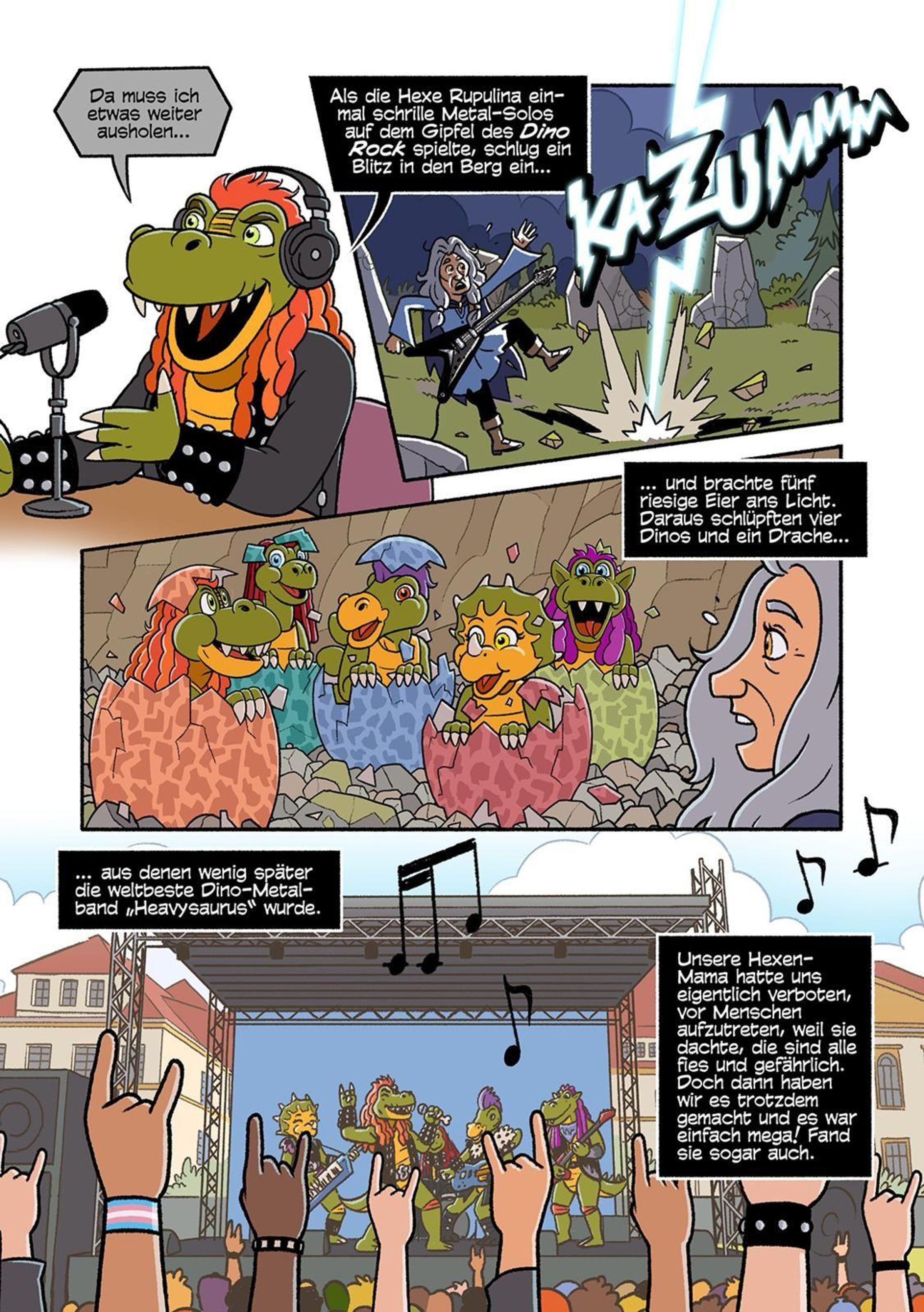 Spannende Comic-Geschichte mit der beliebten Dino-Metal-Band HEAVYSAURUS und ihren Freunden, Rosalie und Felix.