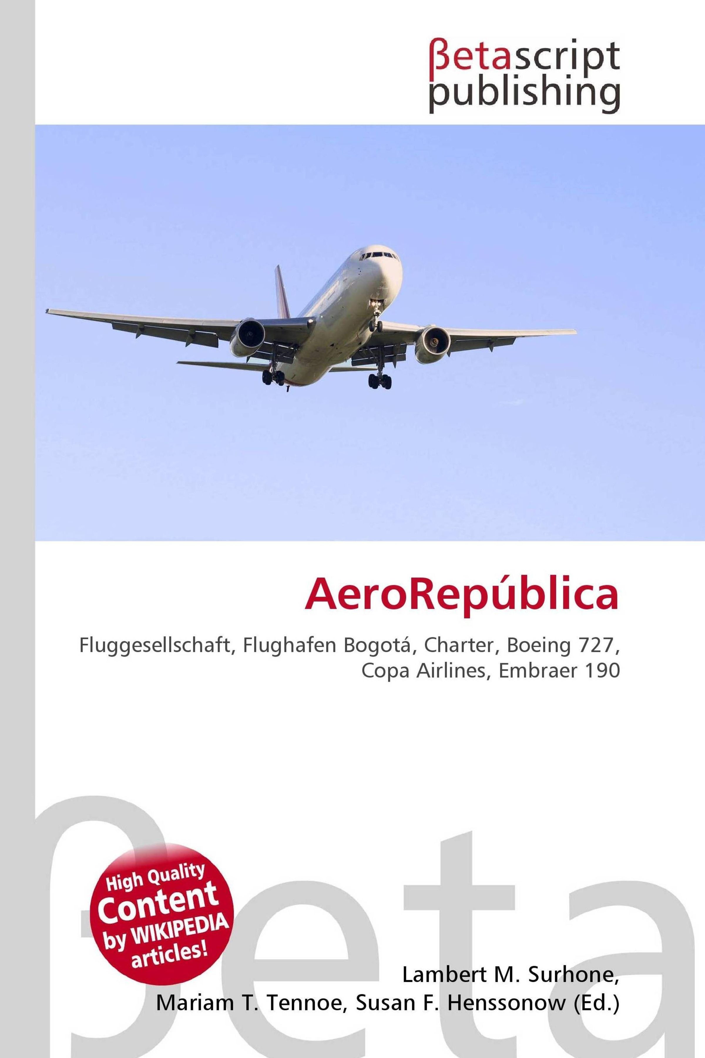 Please note that the content of this book primarily consists of articles available from Wikipedia or other free sources online. AeroRepública ist eine kolumbianische Fluggesellschaft, die ihren Hauptsitz auf dem Flughafen El Dorado International in Bogotá hat. Momentan ist es die zweitgrößte Fluggesellschaft ihres Landes. Geflogen werden nationale Ziele innerhalb Kolumbiens und international nach Zentralamerika, Südamerika und Europa. Als Charter werden mehrere Ziele in den lateinamerikanischen Ländern angeflogen. Die Fluggesellschaft wurde am 23. November 1992 von Amos Ginder und Dr. Alfonso Avila gegründet. Der Betrieb wurde am 19. Juni 1993 mit drei Boeing B727-100 aufgenommen. Als erste Ziele von Bogotá aus wurden Cartagena, Santa Marta und die Insel San Andrés angeflogen. Bis zu diesem Jahr gab es in Kolumbien 25 Jahre lang keine neue Fluggesellschaft. 1997 wurde bekanntgegeben, dass man Flüge in die USA plant, jedoch sind diese Flüge bis heute noch nicht realisiert.