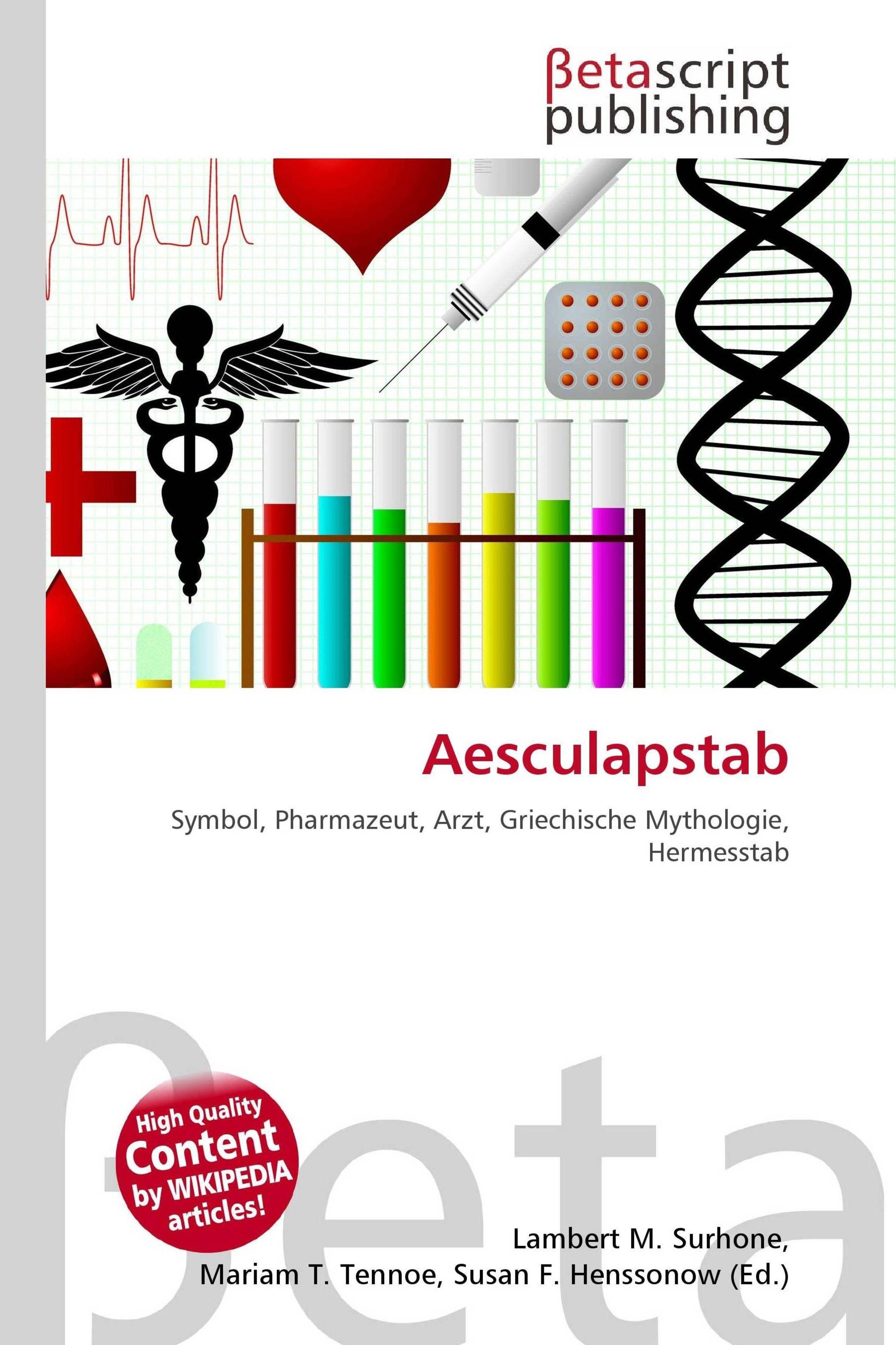 Please note that the content of this book primarily consists of articles available from Wikipedia or other free sources online. Der Äskulapstab oder Asklepiosstab ist ein von einer Schlange umwundener Stab. Er ist heute das Symbol des ärztlichen und pharmazeutischen Standes. Ein ähnliches Symbol der Griechischen Mythologie ist der Hermesstab. Das Unicodesymbol des Äskulapstabes ist u+2695 STAFF OF AESCULAPIUS. Der Äskulapstab erhält seinen Namen von Äskulap oder Asklepios, dem Gott der Heilkunde in der griechischen Mythologie. Als Sohn von Apollon und der thessalischen Fürstentochter Koronis wurde er vom heilkundigen Kentauren Cheiron erzogen und ebenso in der Heilkunde ausgebildet. Weil er als Arzt einen Toten wieder zum Leben auferweckte, erzürnte er Hades, den Herrscher des Totenreiches. Auf dessen Drängen wurde er von Zeus mit einem Blitz erschlagen, weil er sich erdreistet hatte, dem Willen der Götter entgegenzuwirken.