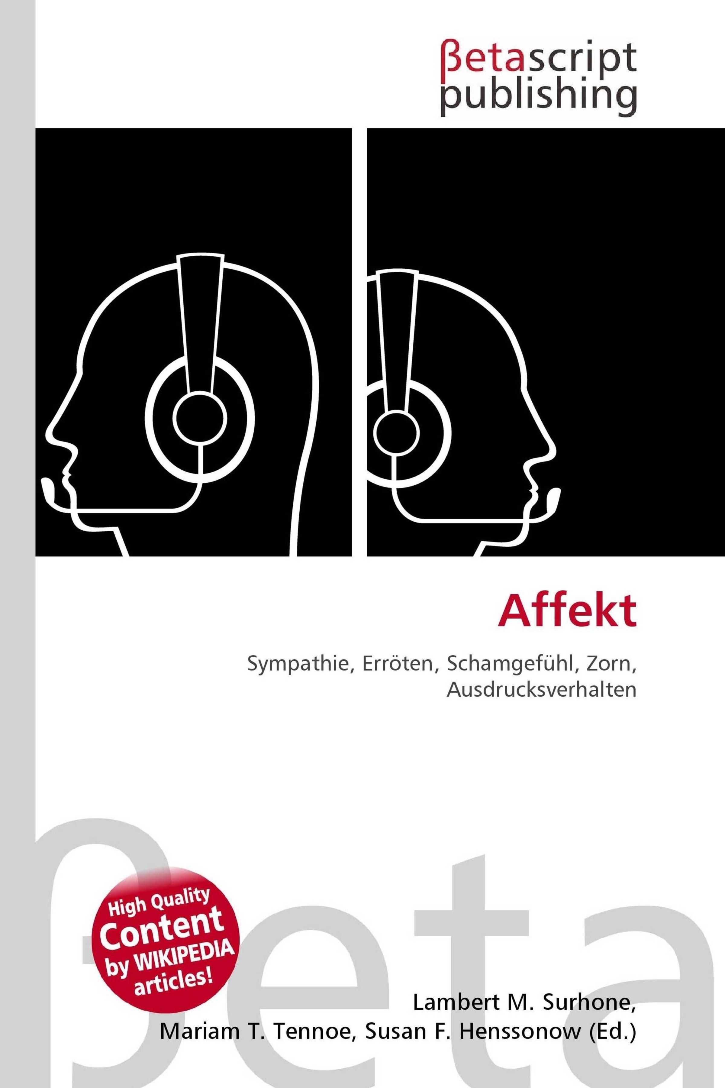 Please note that the content of this book primarily consists of articles available from Wikipedia or other free sources online. Mit Affekt ist eine Gemütserregung (englisch: occuring emotion etwas, was einem passiert) gemeint, die eine Ausdrucksdimension, eine körperliche Dimension und eine motivationale Dimension hat. Ein Lächeln beispielsweise kann ein Ausdruck für den Affekt Sympathie, Erröten, im körperlichen Bereich, bezeichnend für den Affekt Scham und die Bereitschaft, mit der Faust auf den Tisch zu hauen, eine charakteristische Motivation aus dem Affekt Zorn heraus sein.