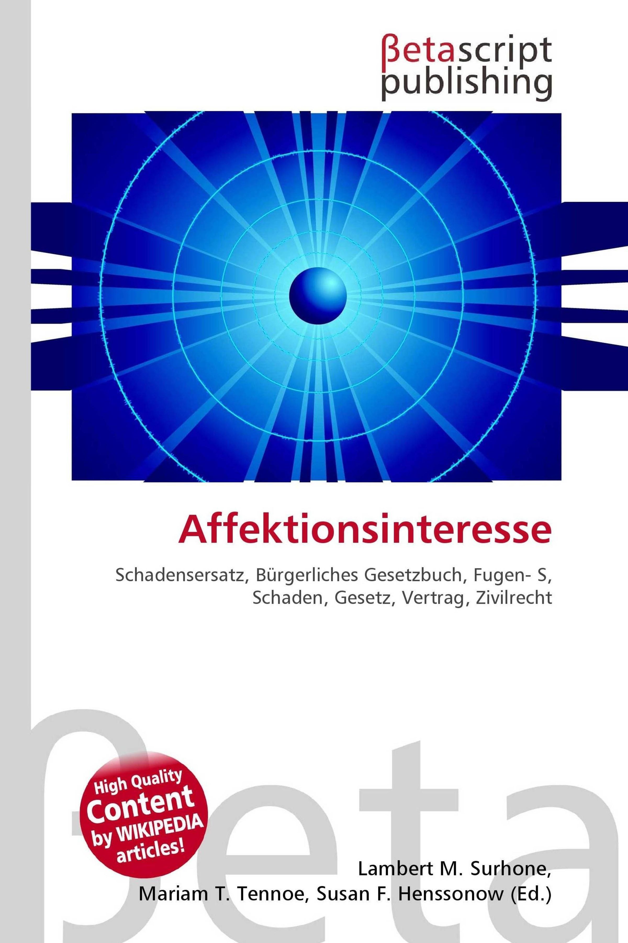 Please note that the content of this book primarily consists of articles available from Wikipedia or other free sources online. Als Affektionsinteresse (=Liebhaberinteresse, auch: Affektionswert, Affektionspreis) wird im Schadensersatzrecht das wirtschaftlich nicht messbare Interesse bezeichnet, das vom Schädiger grundsätzlich nicht ersetzt werden muss. Dies beinhaltet zum Beispiel den rein persönlichen Erinnerungswert oder Gefühlswert an einer ansonsten wertlosen Sache. Diesen rein ideellen Schaden hat der Schädiger dem Geschädigten nicht zu ersetzen.