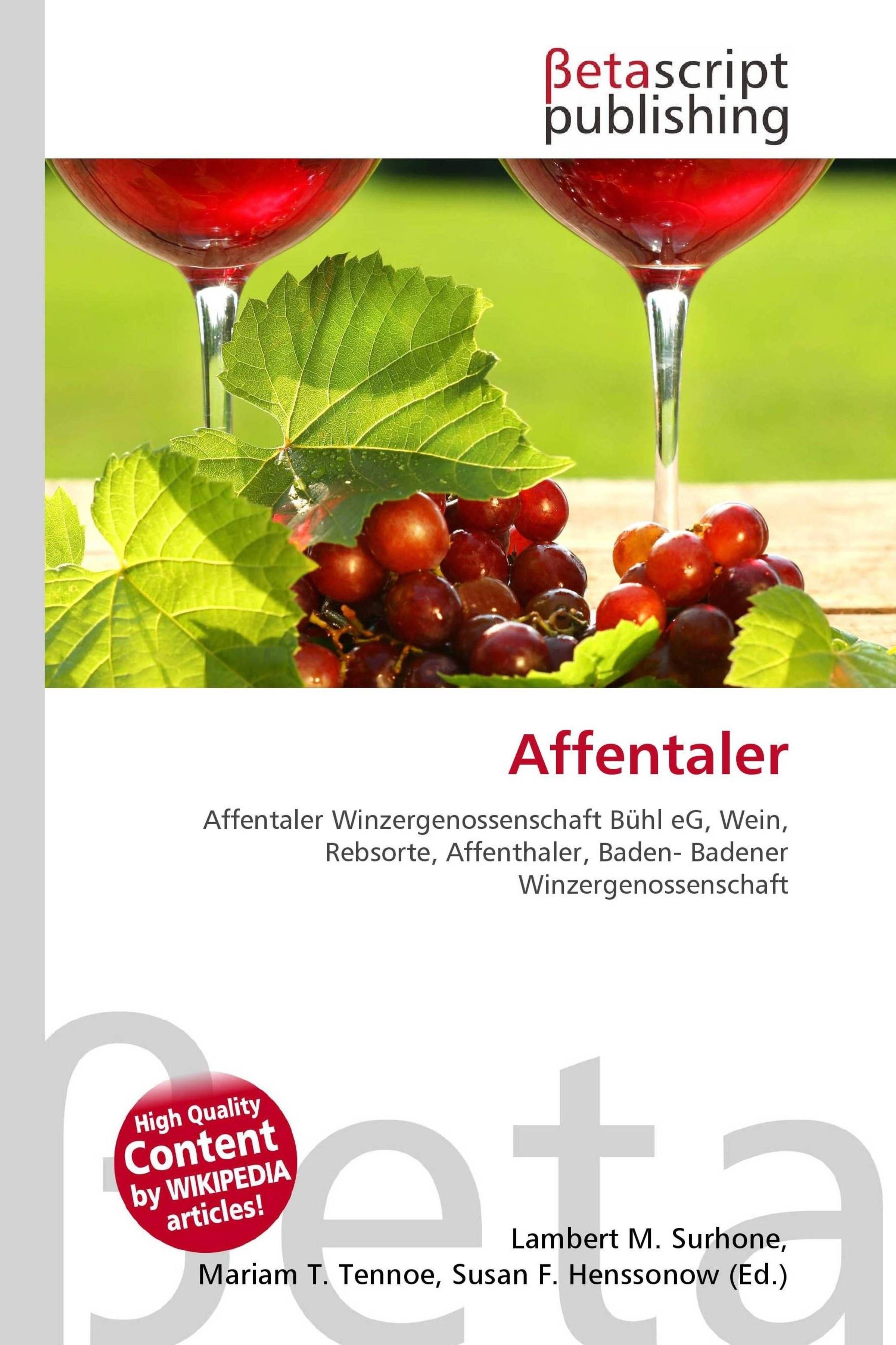 Please note that the content of this book primarily consists of articles available from Wikipedia or other free sources online. Der Affentaler ist die wichtigste und bekannteste Weinmarke der Affentaler Winzergenossenschaft Bühl eG. Der Wein kommt in der so genannten "Affenflasche" zum Verkauf, die durch ihr besonderes Design mit gold- bzw. kupferfarben auflackiertem Affenrelief auffällt. Er wurde früher auch als "Blauer Affentaler" bezeichnet und hat nichts mit der Rebsorte Affenthaler zu tun. Ebenso werden Weine der Baden-Badener Winzergenossenschaft als Affentaler bezeichnet und in Affenflaschen zum Verkauf angeboten.