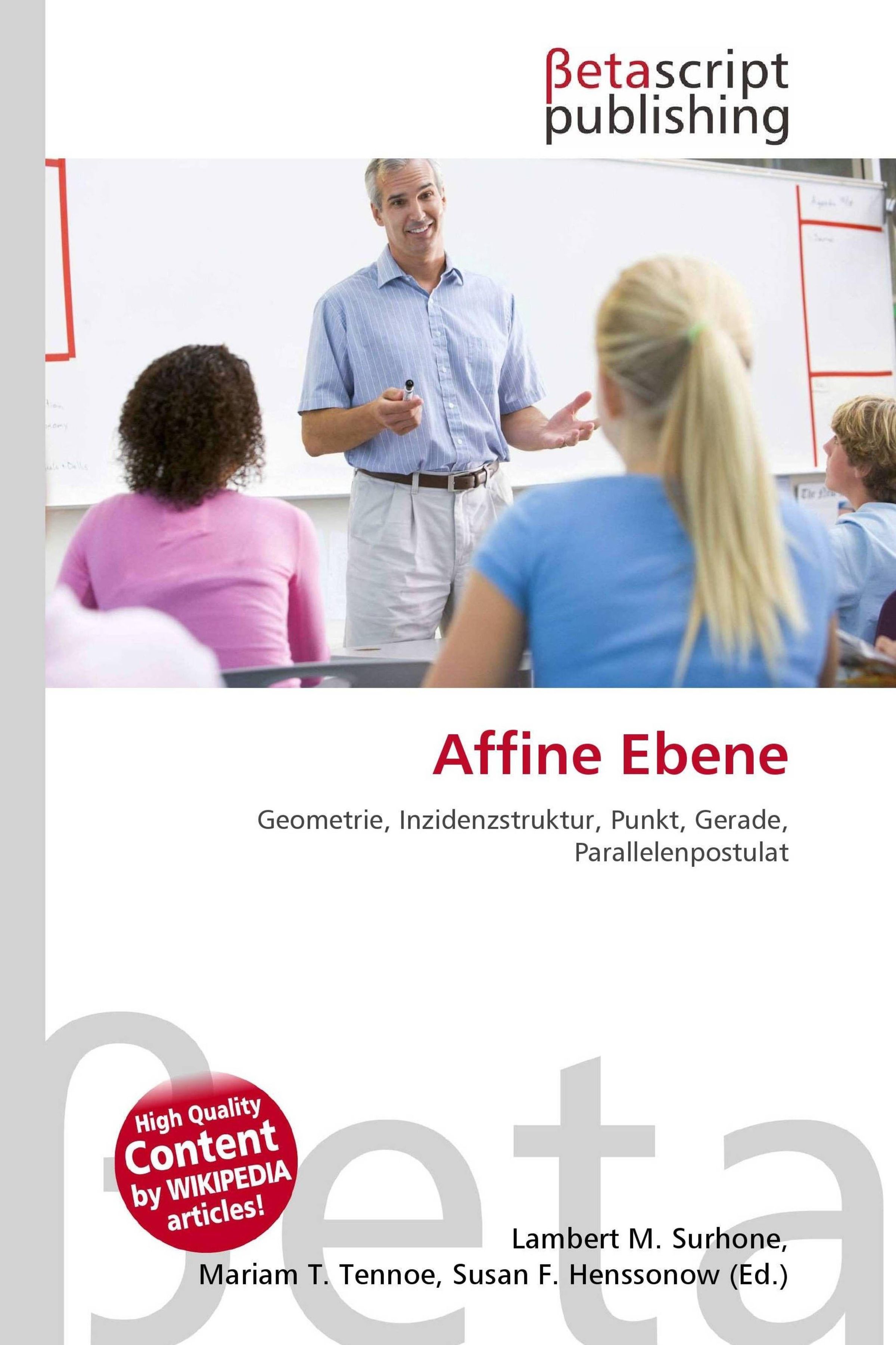 "Affine Ebene: Geometrie, Inzidenzstruktur" steht groß. Ein Lehrer erklärt etwas vor einer kleinen Gruppe, Tafel im Hintergrund., Buch