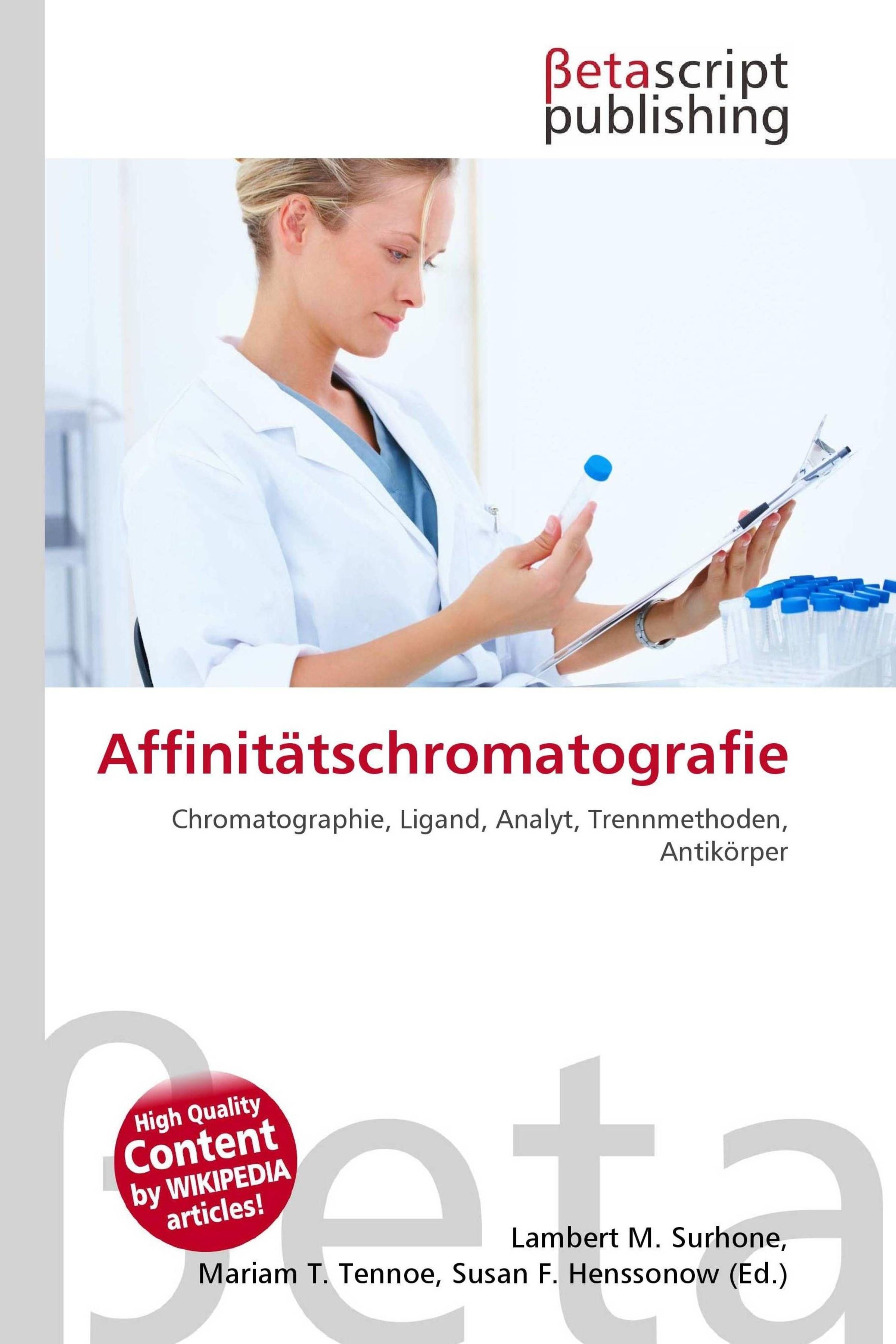 Titel: "Affinitätschromatografie". Oben, Logo "Betascript Publishing". Frau in weißem Kittel mit Reagenzglas und Klemmbrett., Buch