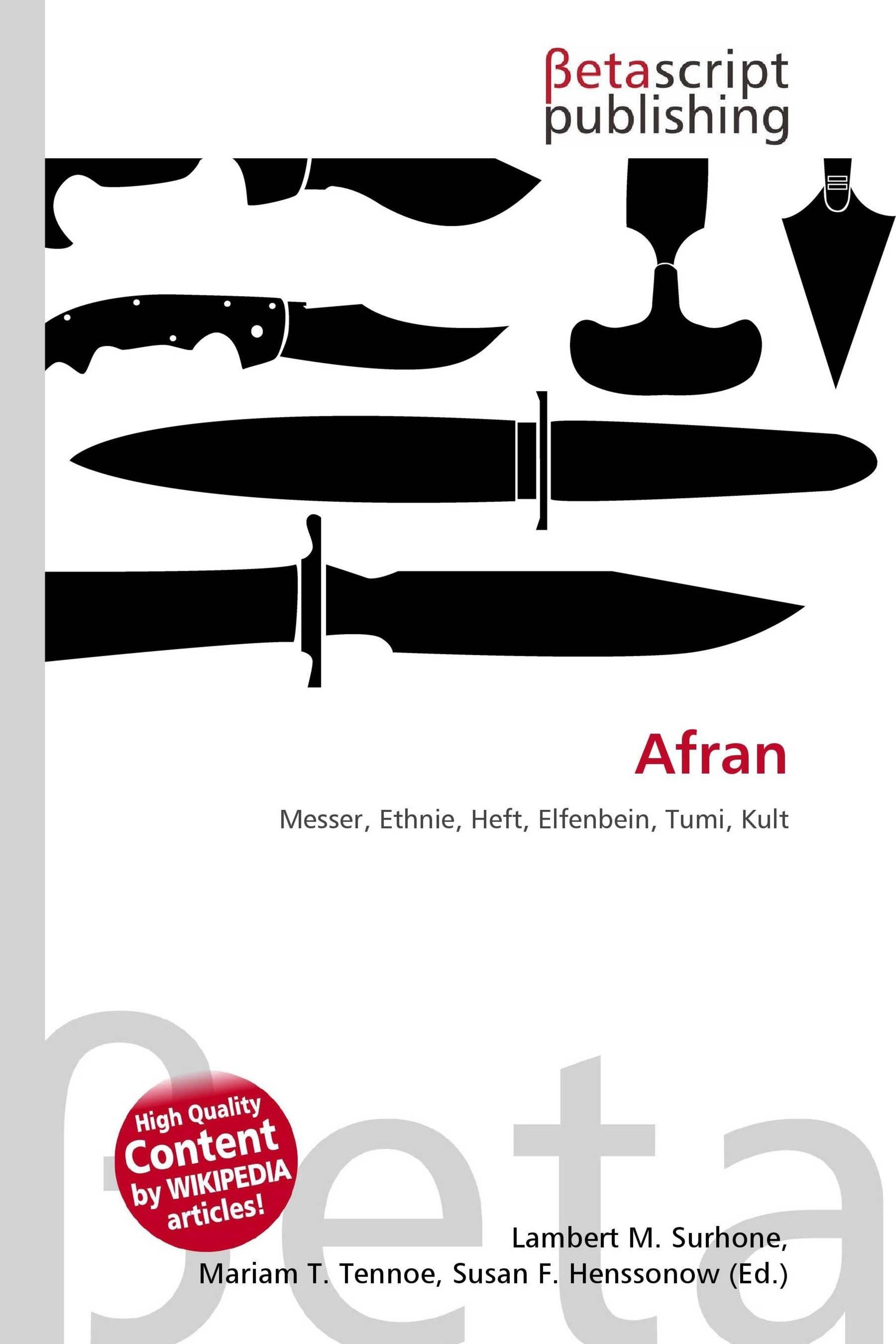 Text: "Afran", "Messer, Ethnie, Heft, Elfenbein, Tumi, Kult." Schwarze Silhouetten verschiedener Messer oben. Logo: "Betascript publishing"., Buch