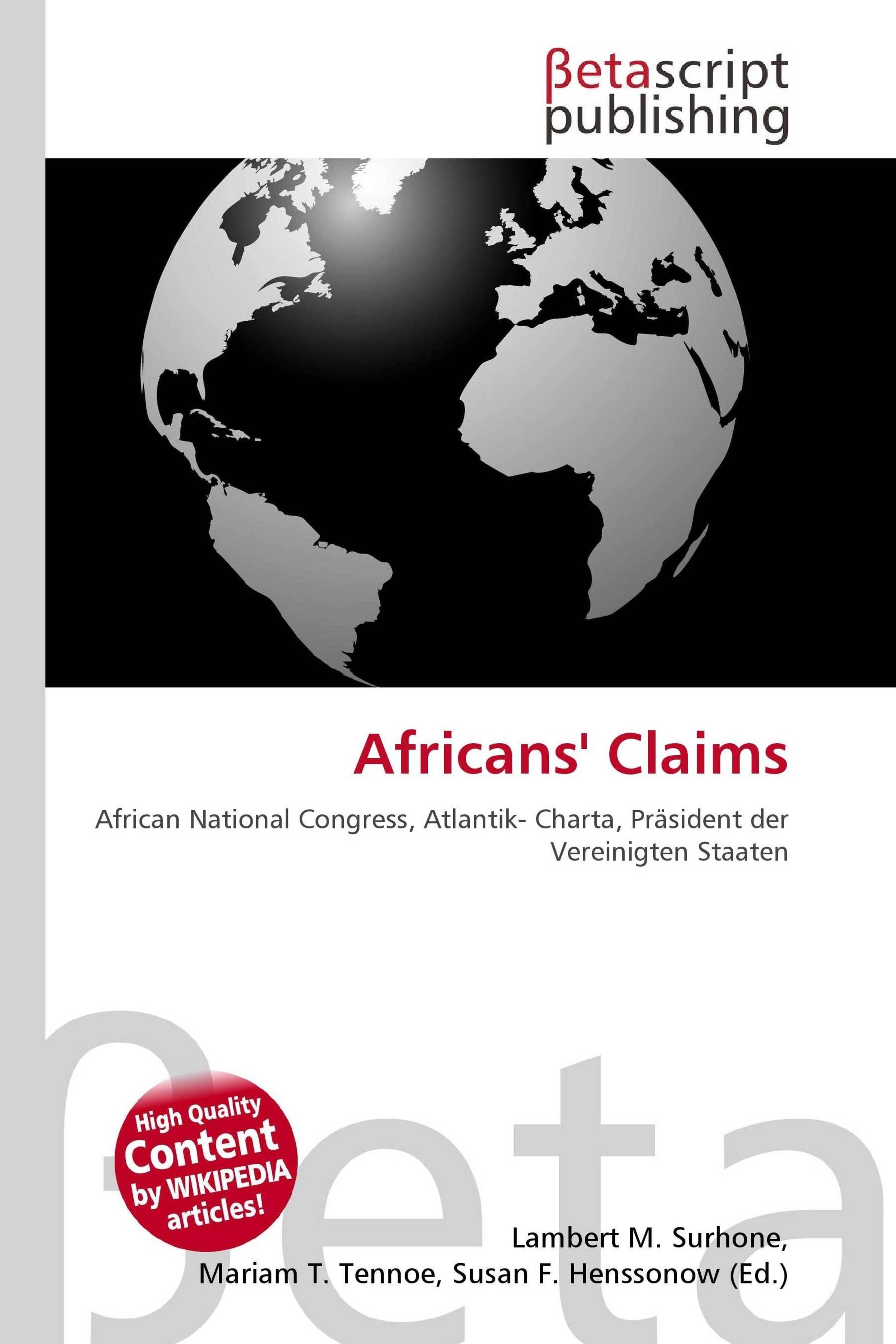 Please note that the content of this book primarily consists of articles available from Wikipedia or other free sources online. Africans' Claims in South Africa (deutsch: Forderungen der Afrikaner in Südafrika) ist der Titel eines Dokuments, das von einem Komitee aus 28 Mitgliedern und Sympathisanten des African National Congress (ANC) ausgearbeitet worden war und am 16. Dezember 1943 von der ANC-Jahresversammlung einstimmig angenommen wurde. Es entstand als Reaktion auf die zwei Jahre zuvor verabschiedete Atlantik-Charta, in welcher der damalige Präsident der Vereinigten Staaten Franklin D. Roosevelt und der britische Premierminister Winston Churchill die Ziele der Alliierten während des Zweiten Weltkriegs darlegten und ihre Vorstellungen von der Weltordnung nach dessen Ende formulierten. Die zentralen Punkte der Africans' Claims waren die Forderungen nach dem allgemeinen Wahlrecht und nach einem Ende der Rassentrennung in Südafrika.