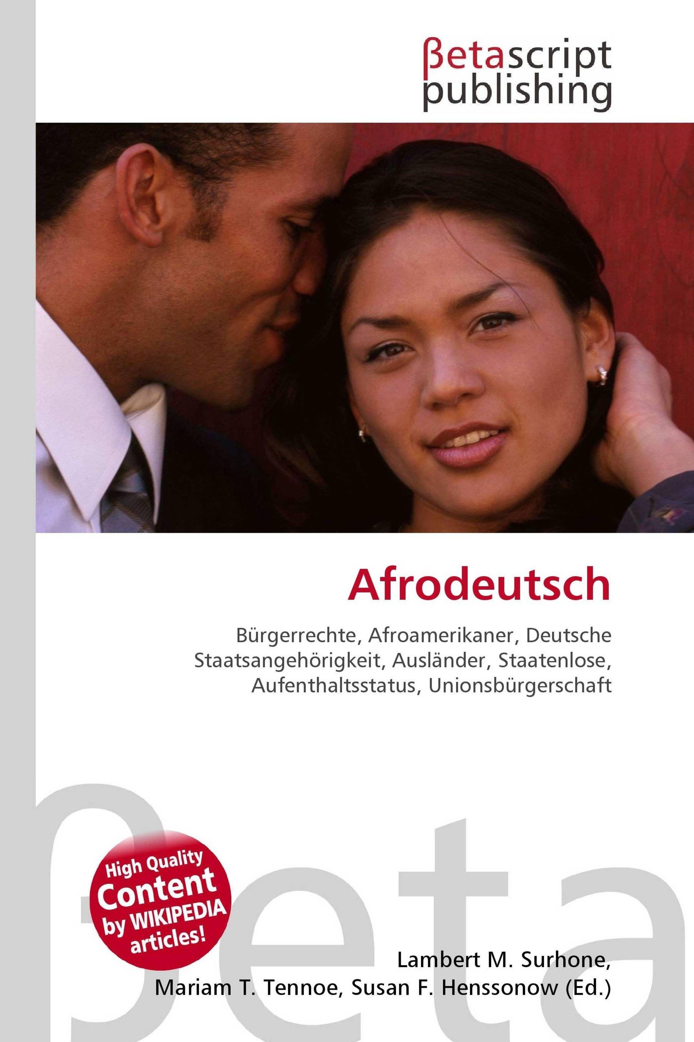 Please note that the content of this book primarily consists of articles available from Wikipedia or other free sources online. Die Begriffe Afrodeutsche und schwarze Deutsche sind Eigenbezeichnungen, die in den Anfängen der sich in den 1980er Jahren formierenden Schwarzen Bewegung geprägt wurden. Sie entstanden durch eine verstärkte Politisierung der schwarzen Bevölkerung in Deutschland und im Bestreben, sich von externen Definierungen abzugrenzen und sich selbst einen Namen zu geben. Sie lösten Bezeichnungen der Mehrheitsgesellschaft weitgehend ab. In den Duden wurde der Begriff erst mit der 24. Ausgabe vom Juli 2006 aufgenommen, zuvor war er nur im Duden-Synonymwörterbuch vertreten.