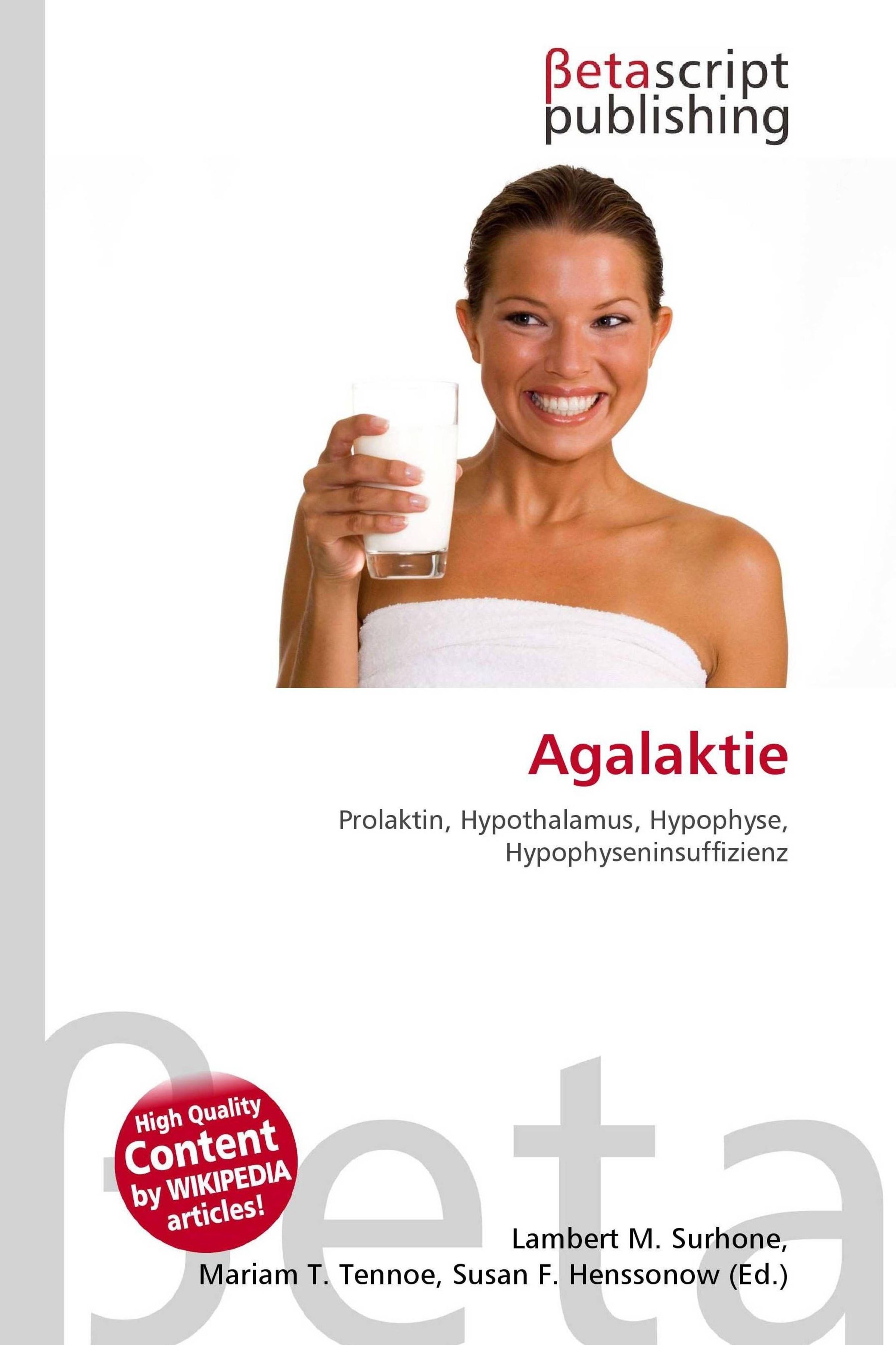 Logo: Betascript Publishing. Titel: Agalaktie. Frau hält ein Glas Milch und lächelt., Buch