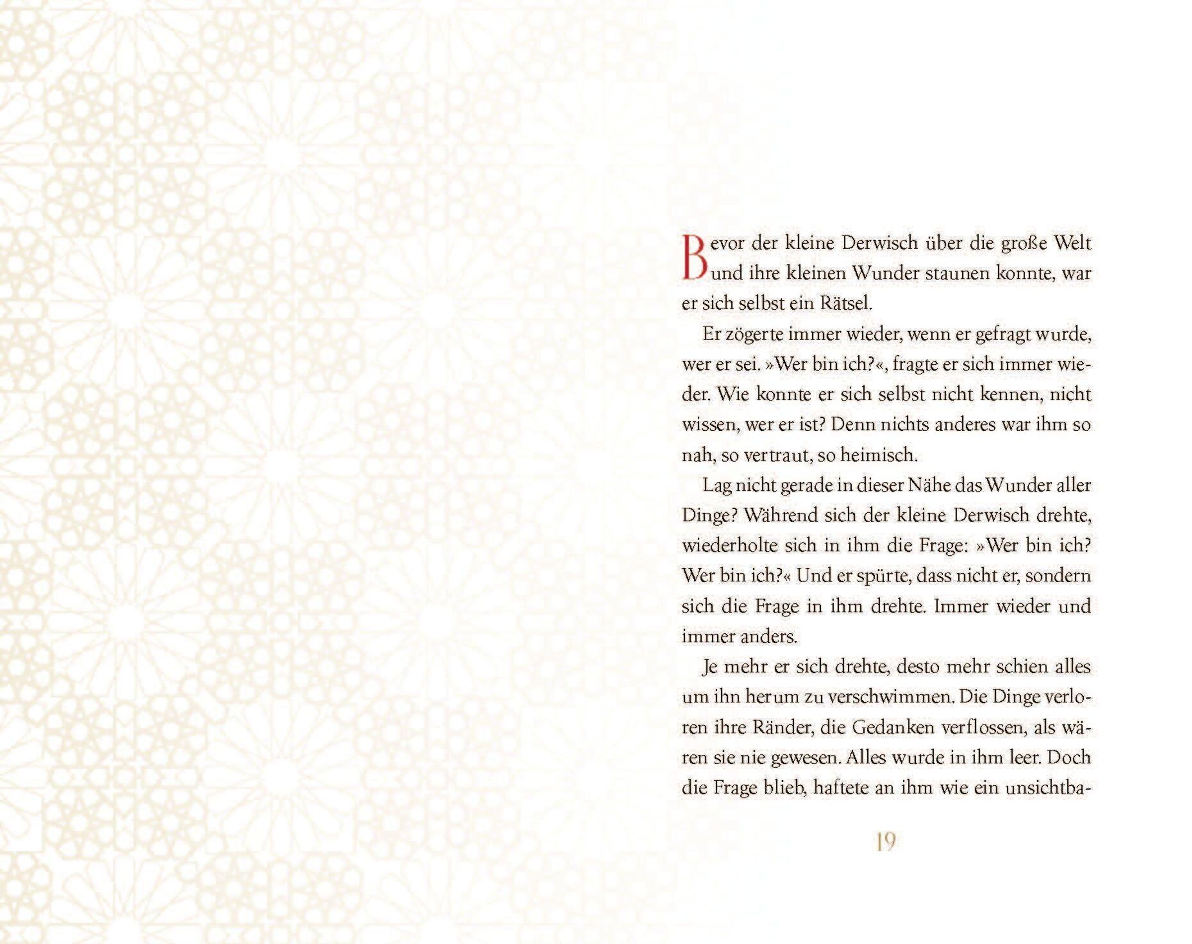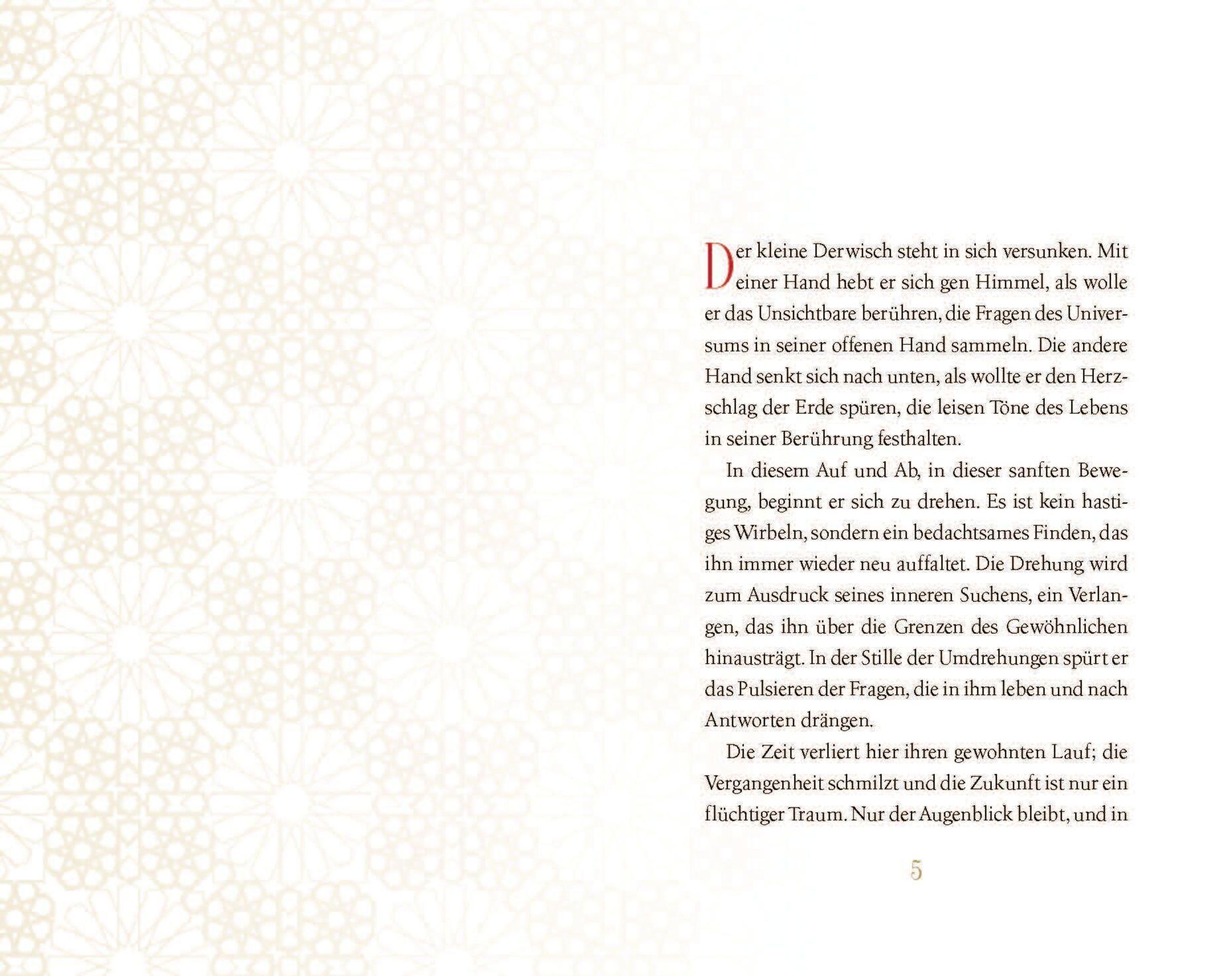Wer bin ich? Was macht mich glücklich? Was bedeutet die Liebe? Während sich der kleine Derwisch unablässig dreht, werden all diese schwierigen Fragen aufgewirbelt. Sie beschäftigen nicht nur ihn, sondern uns alle, manchmal ein Leben lang. Sie nagen an uns, wecken eine Sehnsucht, ein ungestümes Verlangen nach Beantwortung. Inmitten seiner Drehung - einer Bewegung zwischen Himmel und Erde - versucht sich der kleine Derwisch am stillen Dialog mit dem Leben selbst und begibt sich auf die Suche nach Antworten, die tragen.