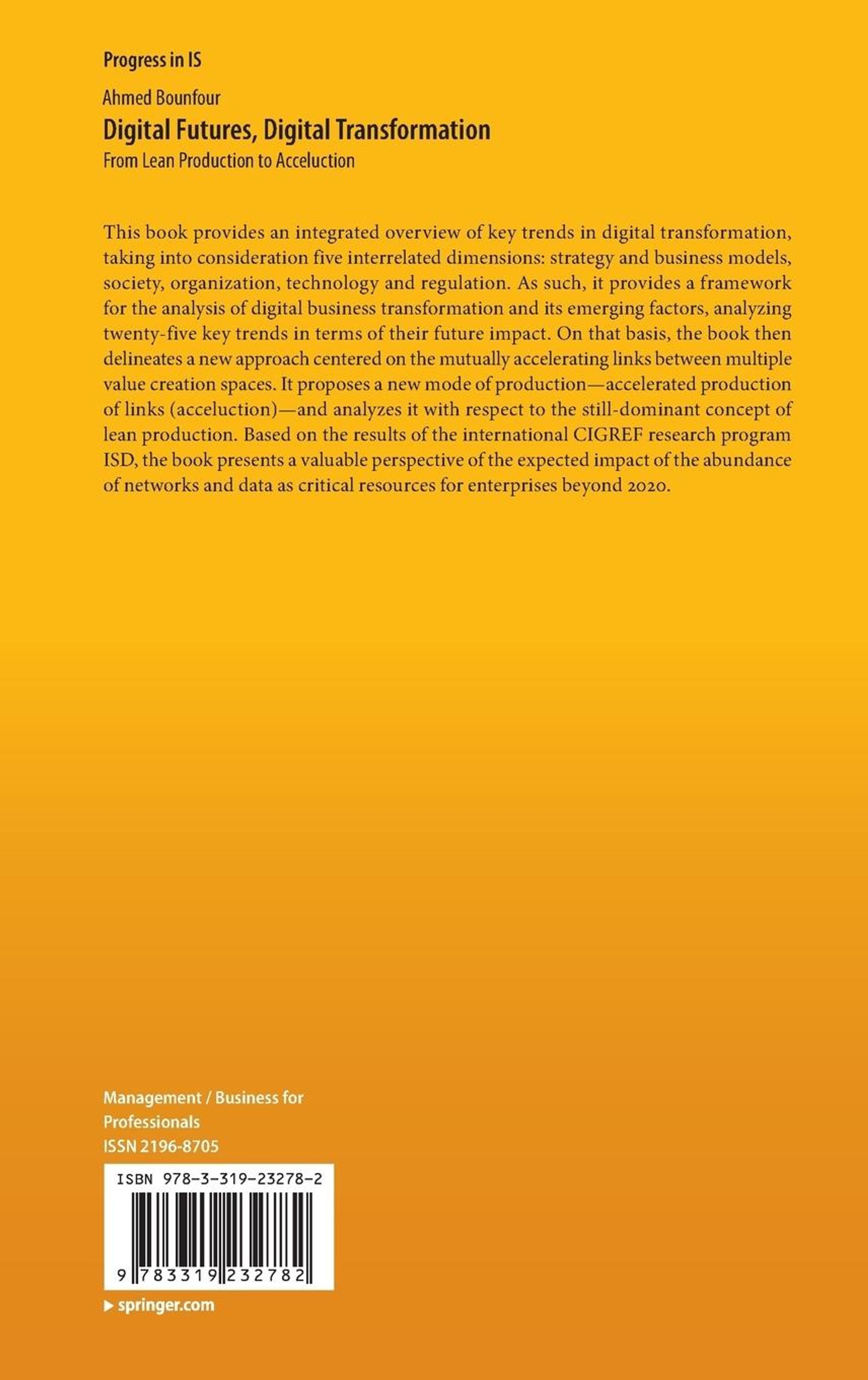 This book provides an integrated overview of key trends in digital transformation, taking into consideration five interrelated dimensions: strategy and business models, society, organization, technology and regulation. As such, it provides a framework for the analysis of digital business transformation and its emerging factors, analyzing twenty-five key trends in terms of their future impact. On that basis, the book then delineates a new approach centered on the mutually accelerating links between multiple value creation spaces. It proposes a new mode of production accelerated production of links (acceluction) and analyzes it with respect to the still-dominant concept of lean production. Based on the results of the international CIGREF research program ISD, the book presents a valuable perspective of the expected impact of the abundance of networks and data as critical resources for enterprises beyond 2020.