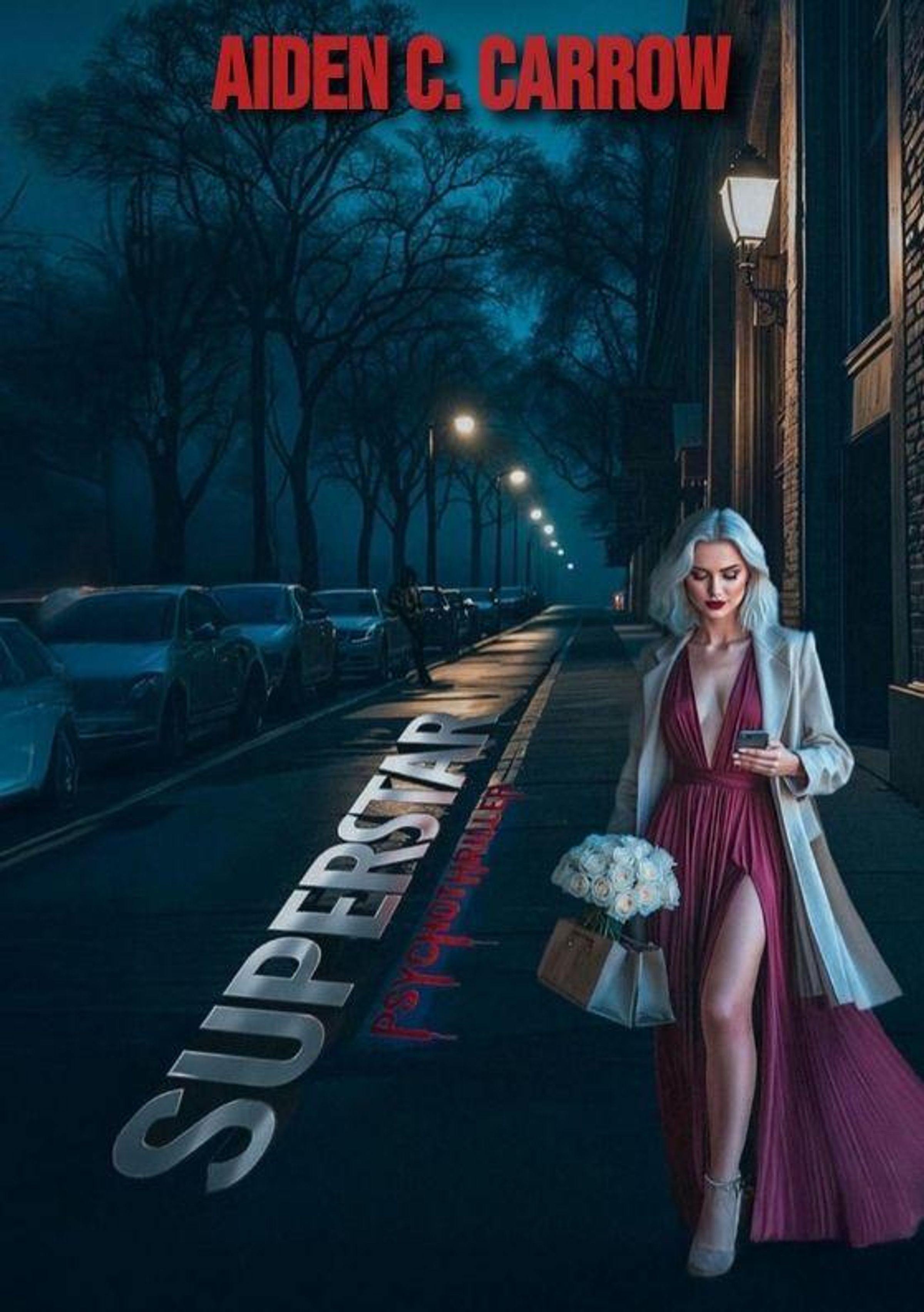 "Aiden C. Carrow, Superstar. Eine elegante Frau in einem roten Kleid geht nachts auf einer beleuchteten Straße.", Buch