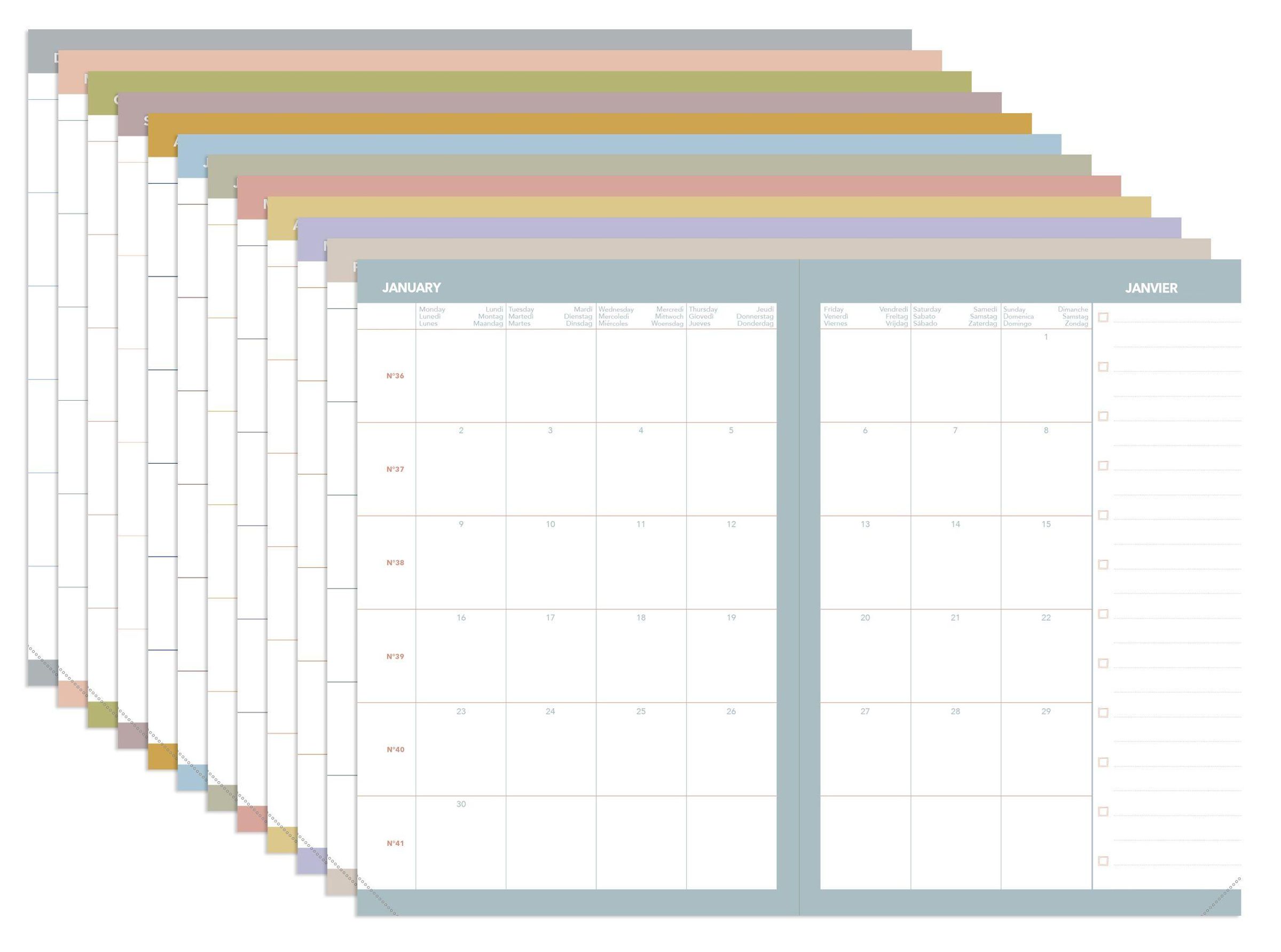 Farbiger Wochenkalender mit einer Woche auf 2 Seiten für eine gute Übersicht über die gesamte Woche. Enthält eine monatliche Doppelseite am Anfang jedes Monats, um einen Überblick über bevorstehende Ereignisse zu erhalten Weißes Clairefontaine-Papier, für ein einzigartiges Schreiberlebnis. Abtrennbare perforierte Ecken für eine schnelle und einfache Or ientierung. Abnehmbarer Einband und nachfüllbarer Innenteil für eine lange Nutzung. Aufbewahrungstaschen für kleine Dokumente.