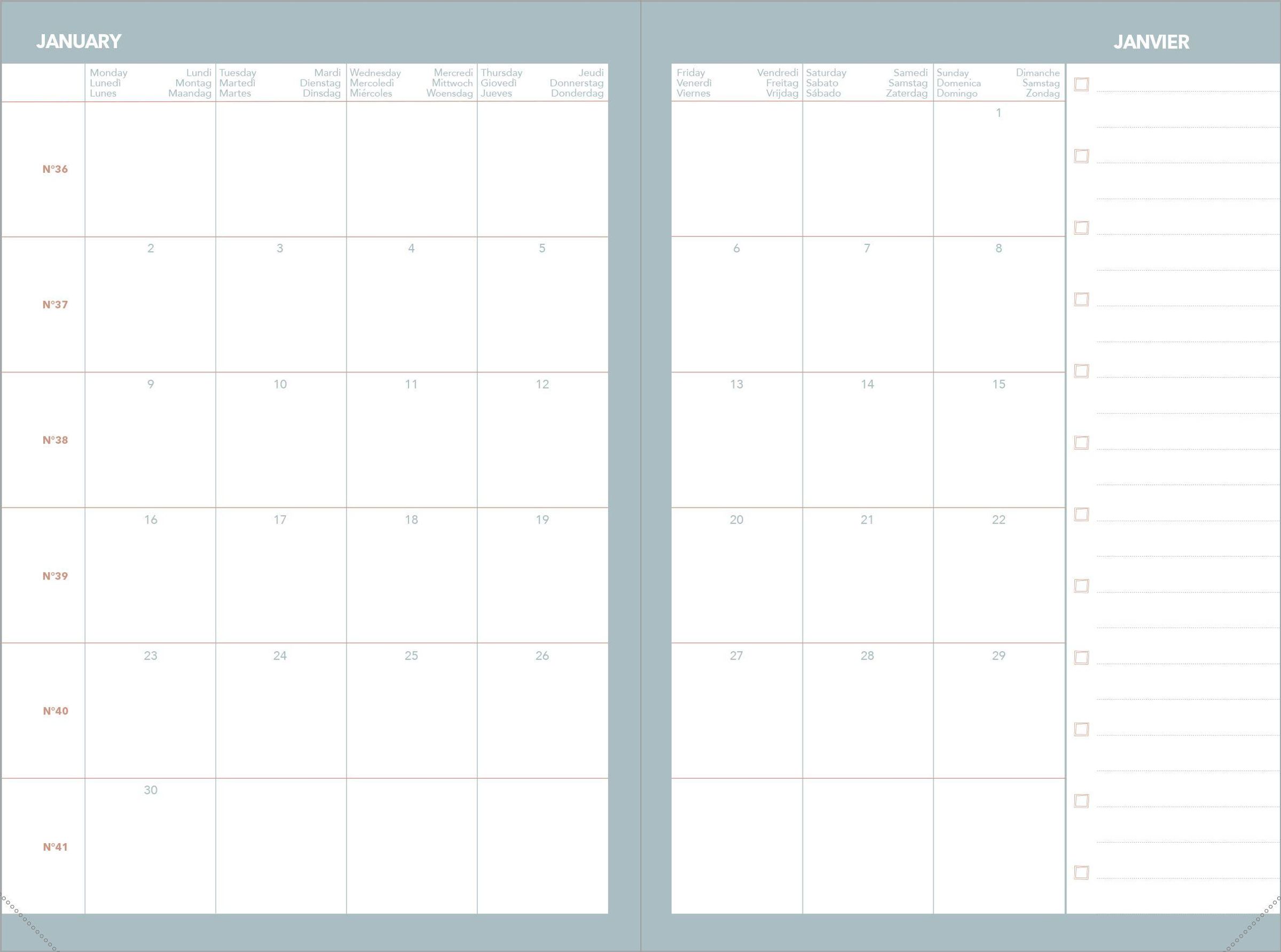 Farbiger Wochenkalender mit einer Woche auf 2 Seiten für eine gute Übersicht über die gesamte Woche. Enthält eine monatliche Doppelseite am Anfang jedes Monats, um einen Überblick über bevorstehende Ereignisse zu erhalten Weißes Clairefontaine-Papier, für ein einzigartiges Schreiberlebnis. Abtrennbare perforierte Ecken für eine schnelle und einfache Or ientierung. Abnehmbarer Einband und nachfüllbarer Innenteil für eine lange Nutzung. Aufbewahrungstaschen für kleine Dokumente und ein herausnehmbares Register für Ihre Kontakte.