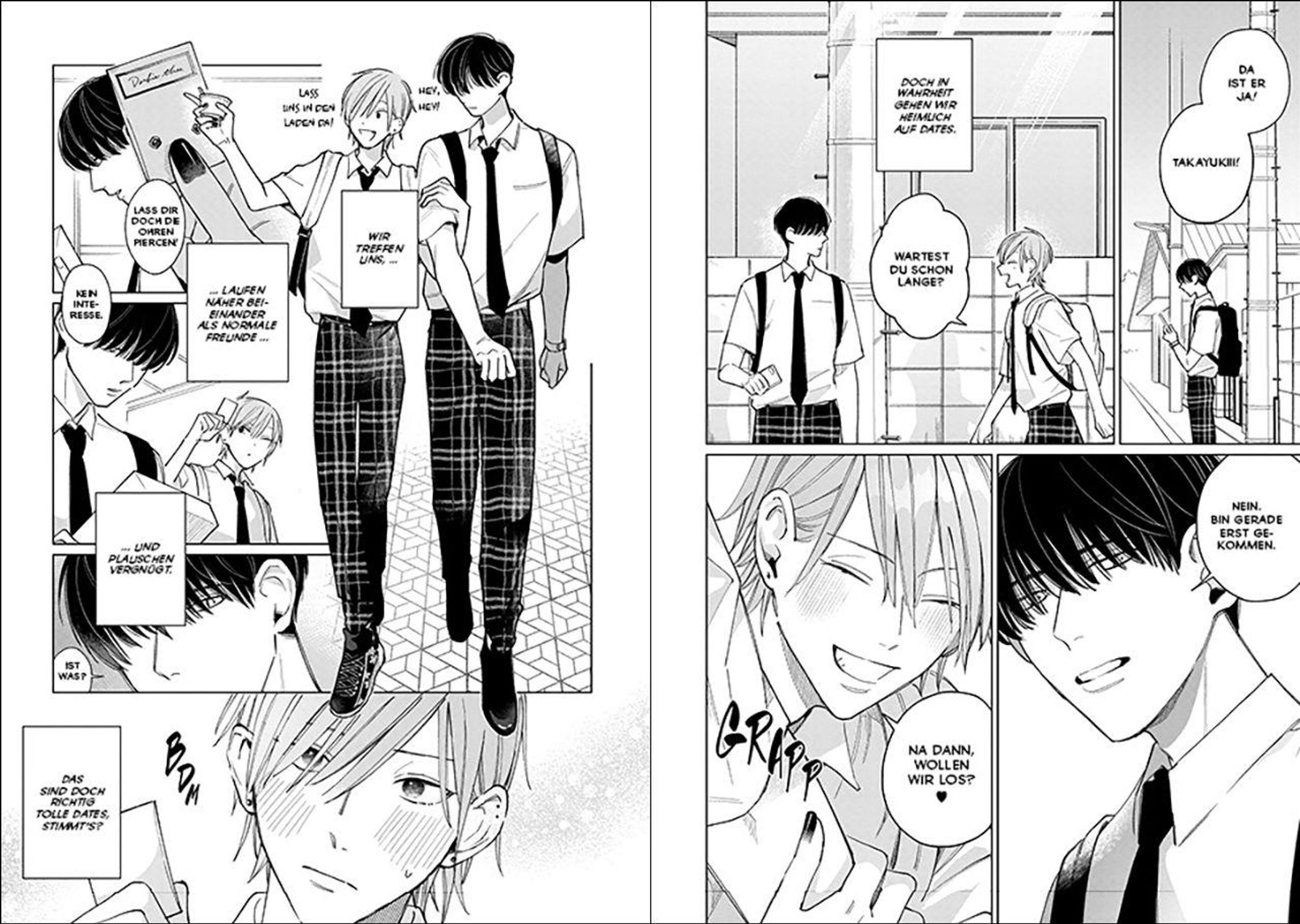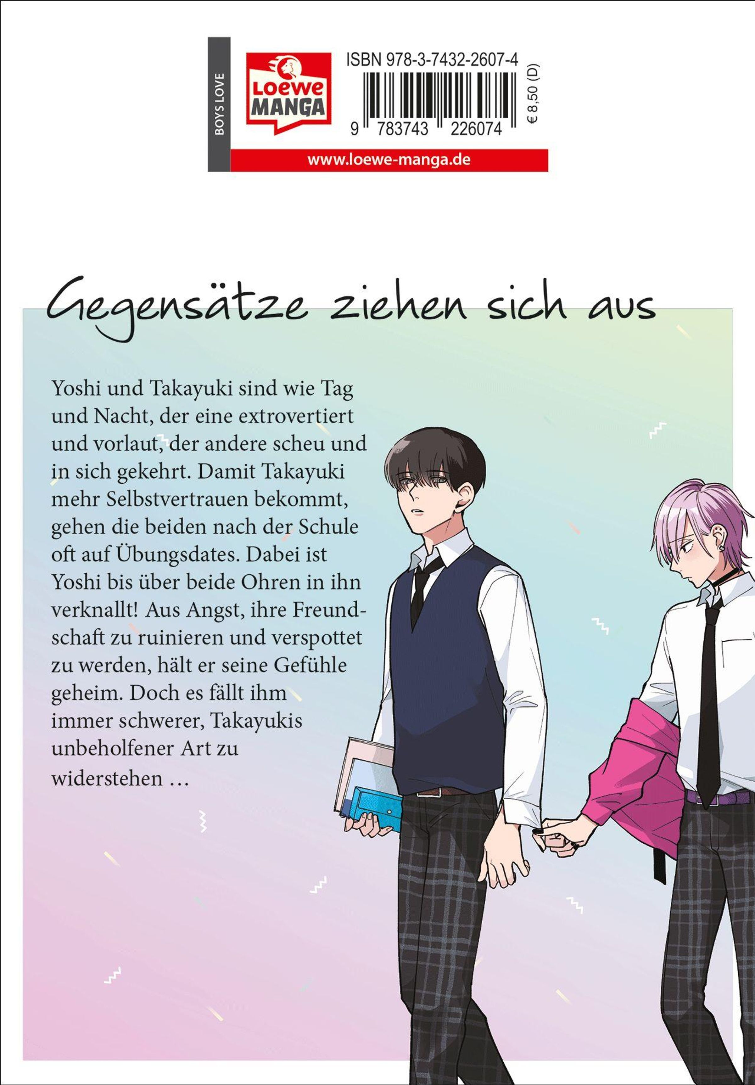 Gegensätze ziehen sich aus Yoshi und Takayuki sind wie Tag und Nacht, der eine extrovertiert und vorlaut, der andere scheu und in sich gekehrt. Damit Takayuki mehr Selbstvertrauen bekommt, gehen die beiden nach der Schule oft auf Übungsdates. Dabei ist Yoshi bis über beide Ohren in ihn verknallt! Aus Angst, ihre Freundschaft zu ruinieren und verspottet zu werden, hält er seine Gefühle geheim. Doch es fällt ihm immer schwerer, Takayukis unbeholfener Art zu widerstehen ...