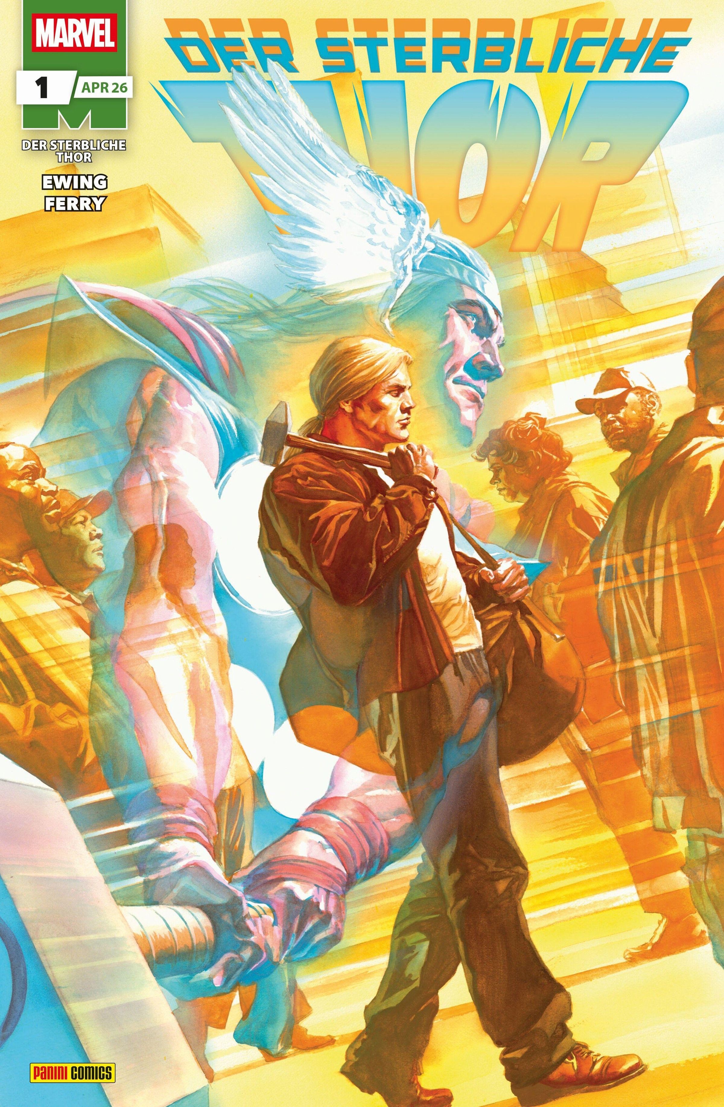 Titel: "Der Sterbliche Thor". Illustration von Thor in Alltagskleidung mit Hammer über die Schulter, umgeben von Menschen., Buch
