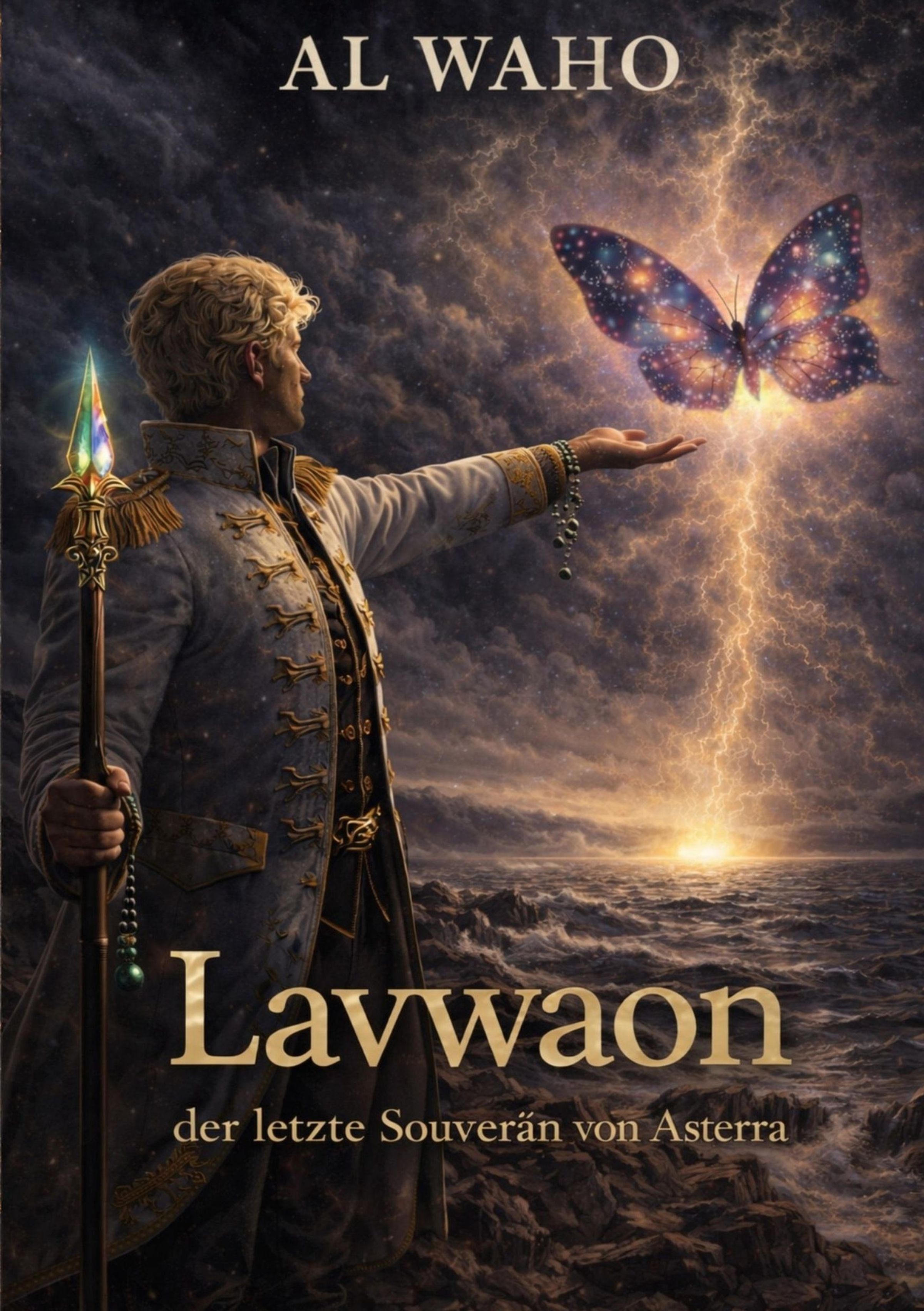 „AL WAHO“, „Lavwaon der letzte Souverän von Asterra“. Eine Illustration: Ein Mann in prächtiger Kleidung hält einen Stab, blickt auf einen leuchtenden Schmetterling über einem stürmischen Meer mit Blitz., Buch