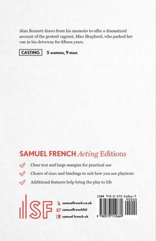 Genre: Comedy Characters: 9 males, 5 females Scenery: Various sets Alan Bennett draws from his memoirs to offer a dramatized account of the genteel vagrant, Miss Shepard, who parked her van in his driveway for fifteen years. Maggie Smith starred in London's West End. "A wonderfully bittersweet comic diary of the years in which a lethally dotty and very smelly old bat parked her unroadworthy vehicle in Bennett's Camden garden, thereby providing him with roughly equal amounts of good journalistic copy and guilty landlord irritation." -Spectator "Hilarious...A consistently enjoyable entertainment." -The New York Times "Without doubt, the best new play of the year." -Daily Telegraph "Bennett's writing is nimble, ironical, cruel and humane...Gives the West End one of its saddest, funniest, and most distinguished offerings for years." -London Times