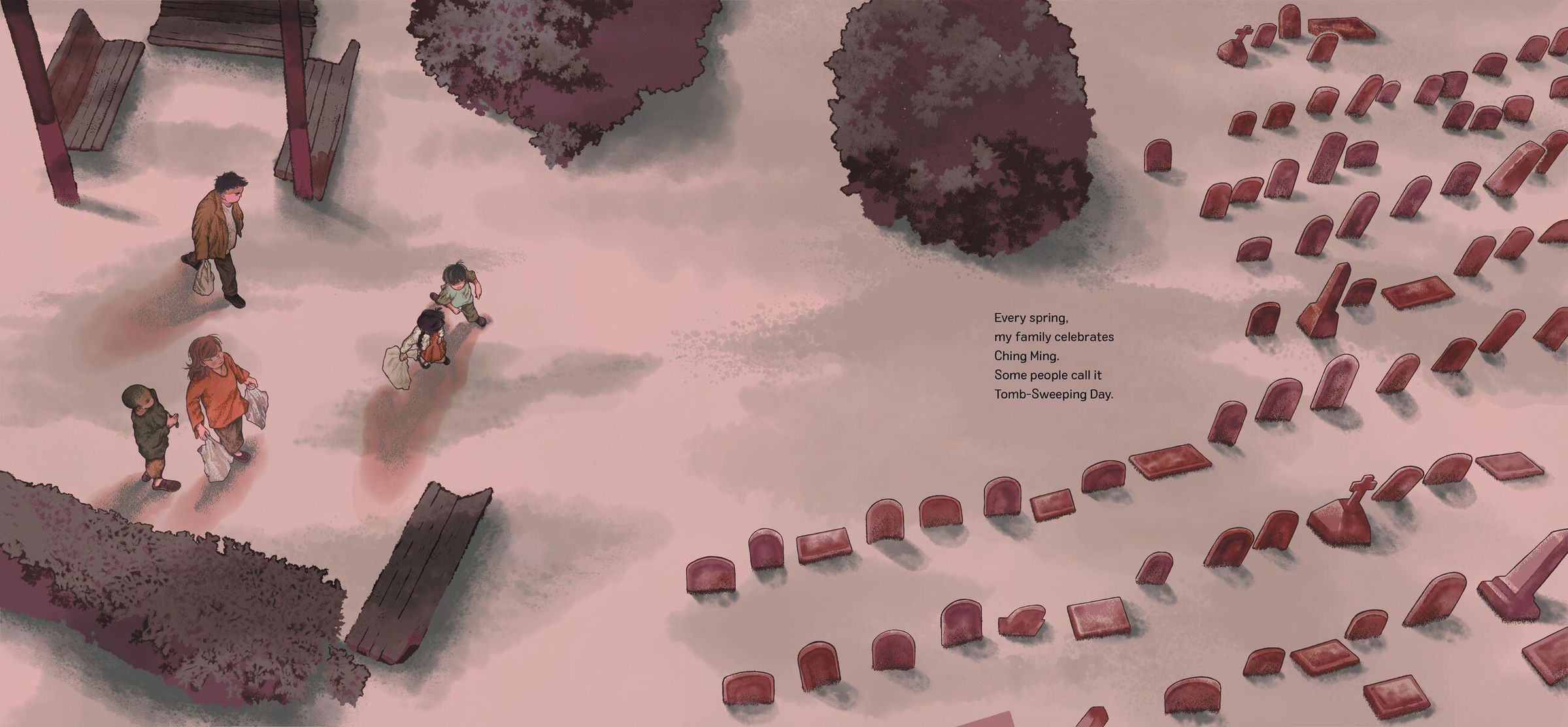 A young boy and his family arrive at the cemetery to celebrate Ching Ming, the day they and many other families remember and honor their ancestors. For the boy, the rituals of the day feel like a game - the Cemetery Game. The family members bring flowers and special foods to the gravesites of their relatives. They light incense, burn play money and bow together. The boy and his sister even find time for a laugh, imagining themselves at a tea party for ghosts! But as their older brother reminds them, this day is important and they need to pay attention. After all, one day this will all be their responsibility.