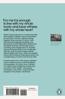'It was the discovery of the essays celebrating his childhood and youth that altered my perception of Camus, from a thinker to a writer whose intellectual lucidity was a product of the wealth - the sensual immediacy and clarity - that had been heaped on his senses' Geoff Dyer Albert Camus was born in a 'world of poverty and sunshine' in Algeria, which would infuse all of his work. This new collection brings together three volumes of Camus' most intimate autobiographical writings for the first time. The Wrong Side and the Right Side, his first book, describes his family and his early years in a working-class neighbourhood. Nuptials rejoices in the sensuality of sun, landscape and sea, while Summer ranges over the cities of Algiers and Oran, nature and identity. Lyrical and emotional, these pieces enrich our understanding of Camus and his love of life.