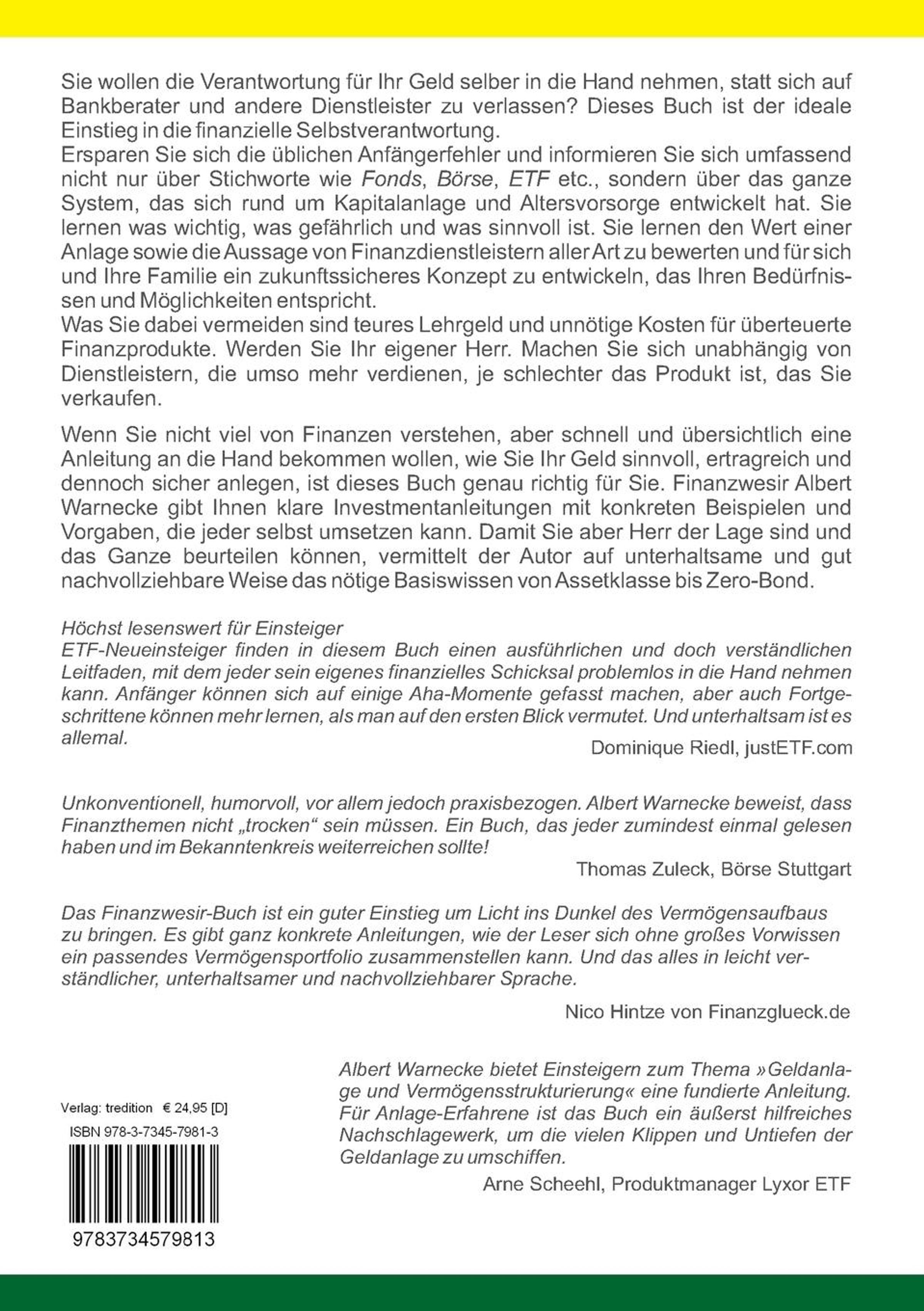 Der Bestseller komplett überarbeitet. Nach knapp 15.000 verkauften Exemplaren der Finanzwesir 2.0. Sie wollen wissen, wie Sie Ihr Geld anlegen sollen, um sich eine sichere und rentable Altersvorsorge aufzubauen, mit der Sie Ihren Lebensstandard halten können? Sie wollen einen >>Leitfaden<<, der Ihnen erklärt, wie Sie als Aktien-Anfänger in 10 bis 20 Jahren ein (kleines) Vermögen aufbauen? In diesem Buch präsentiert Ihnen Albert Warnecke 20 Jahre Geld- und Börsenerfahrung in 9 Kapiteln auf rund 440 Seiten. Das Buch ist eine Mischung aus philosophisch-psychologischen Grundlagen und knallharten Excel-Kalkulationen. Geschrieben aus der Opfer-Perspektive, denn der Autor hat sich beim Lehrgeldzahlen für die Premiumvariante entschieden. Sie müssen nicht jede Erfahrung selbst machen. Lassen Sie den Autor Ihr Sherpa durch die fünf Ebenen der Geldanlage sein.
