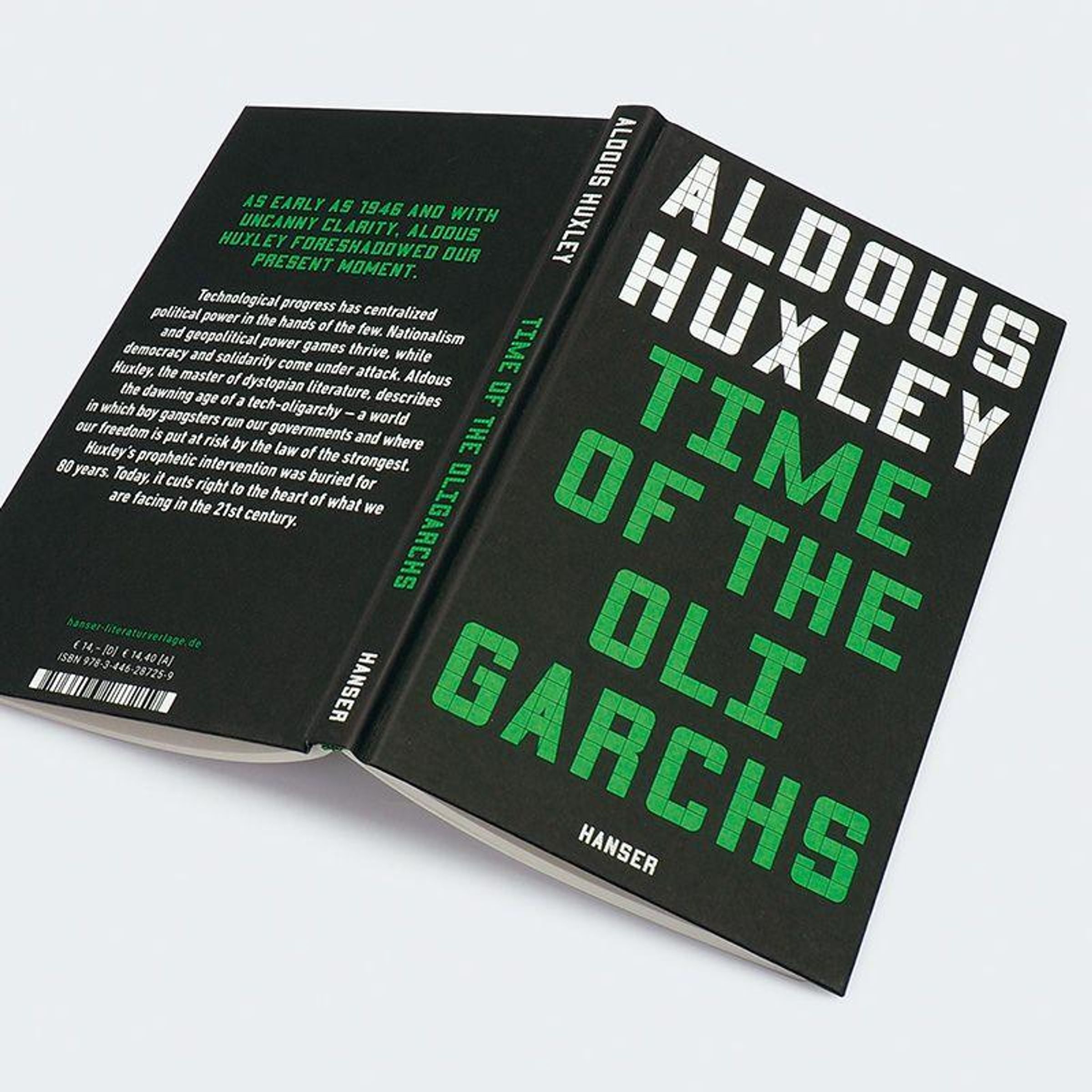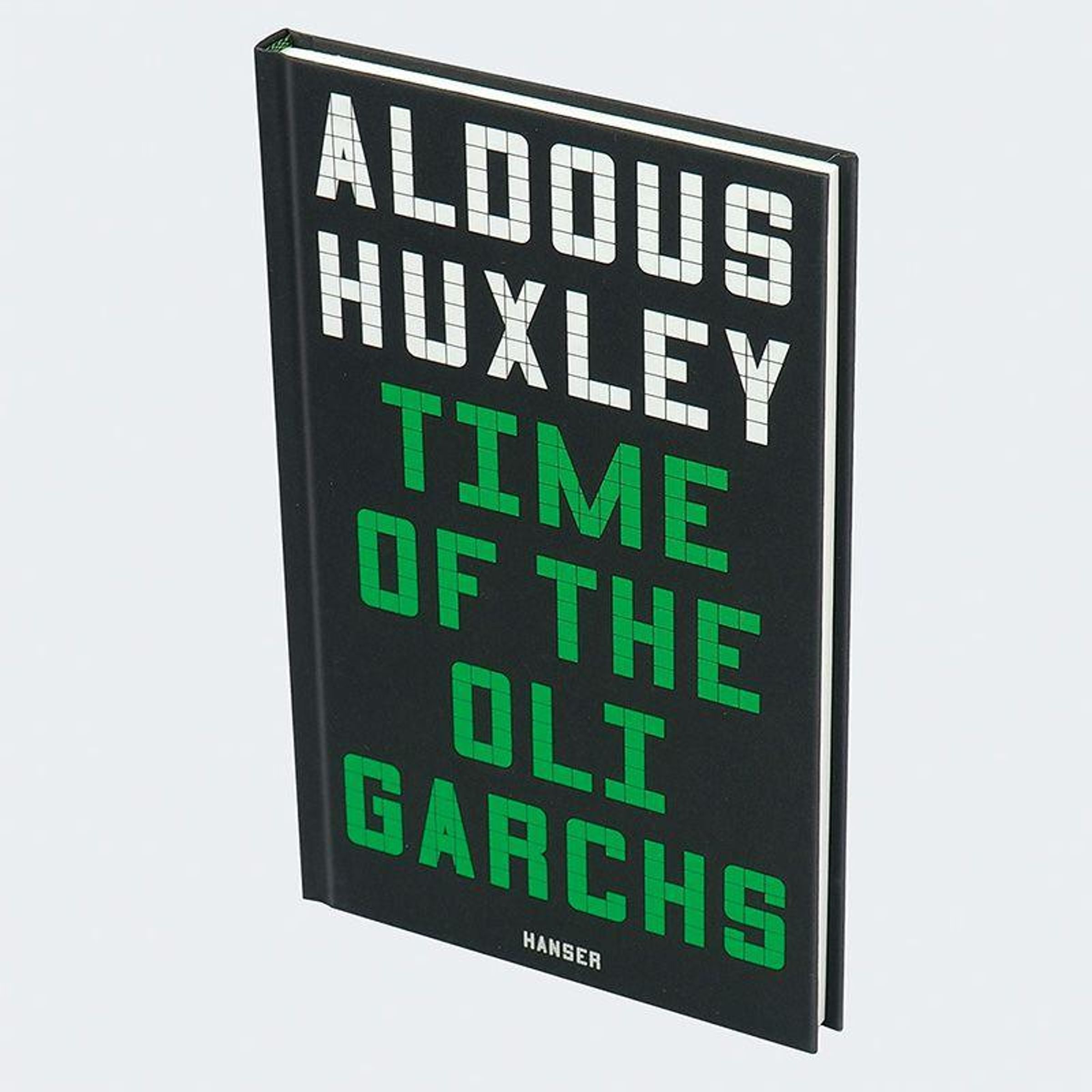 Große quadratische Buchstaben auf schwarzem Hintergrund: "ALDOUS HUXLEY TIME OF THE OLIGARCHS", unten "HANSER"., Buch