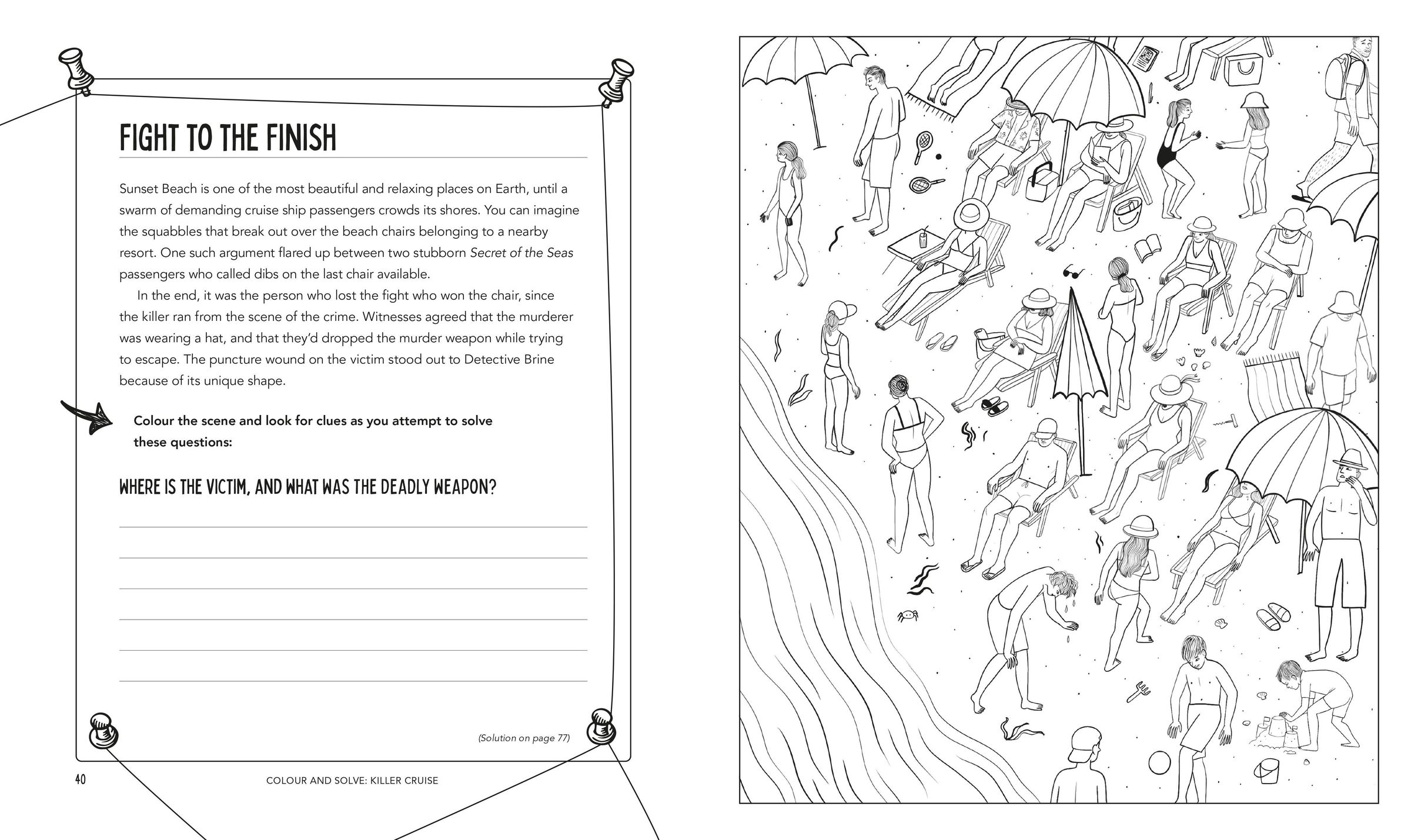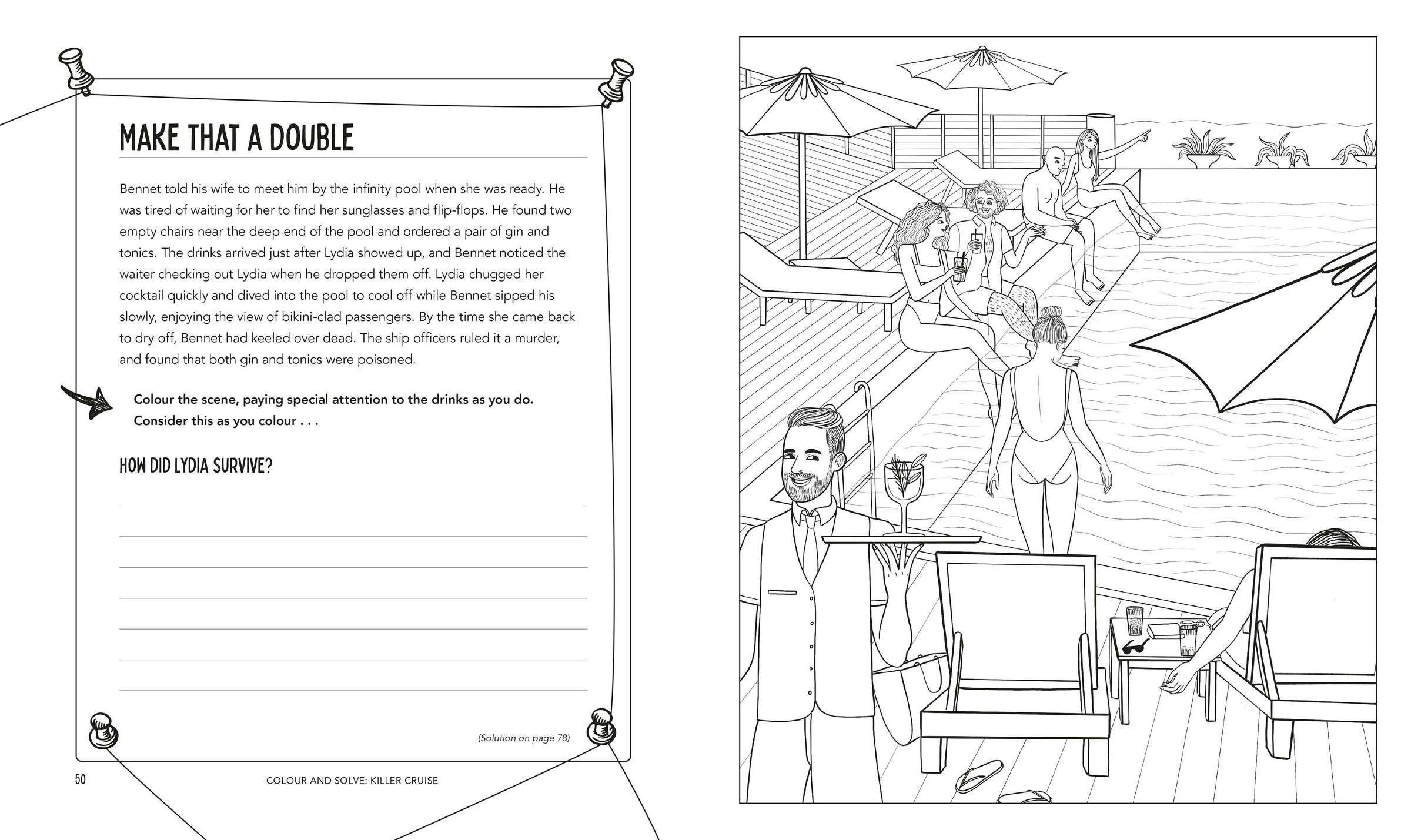 Test your detective skills with this wonderfully immersive colouring book. Each page offers a brand-new story of murder and mayhem along with a colour-in crime scene full of clues. From poolside poisonings, to murder on the main deck, no one expected such a choppy ride when they set sail. It's up to you to solve the crime: read the case file, colour the crime scene, dodge the red herrings, and catch the villain . . . if you can.