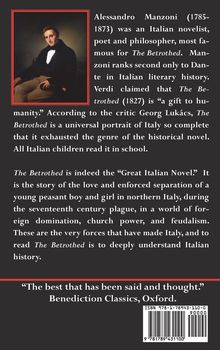 Manzoni's The Betrothed is indeed "The Great Italian Novel." It is the story of the love and enforced separation of a young peasant boy and girl in northern Italy, during the seventeenth century plague, in a world of foreign domination, church power, and feudalism. These are the very forces that have made Italy, and to read The Betrothed is to deeply understand Italian history. Beyond history, Manzoni creates a wide range of vivid characters. Lucia, the heroine, Padre Cristoforo, a Capuchin friar, and Cardinal Federico Borromeo (a historical figure, and cousin of Saint Charles Borromeo) are varied examples of wholehearted goodness. In addition, there are sympathetic portraits of a wide range of other characters who fall short, perhaps well short, of Christian ideals. The novel is famous for its extraordinary description of the Italian Plague of 1629--1631 which ravaged northern and central Italy, throwing society into confusion and killing perhaps a million people. The Betrothed is a historical romance par excellence--probing the human condition and thoroughly examining Italian history. It was initially published in three volumes from 1825 to 1827. Manzoni feared it would have only twenty-five readers. However, it soon became the most read Italian novel, and by 1839 it had gone through numerous official printings, and in addition there were no less than 59 unauthorised editions in Italian and fourteen in foreign languages. Today almost all Italians have read it, at least once, and many enjoy quoting from it. Phrases from the novel have entered the Italian language. It is regarded as one of the masterpieces of world literature. The novel is a symbol of the Risorgimento, Italian Unification, because of its patriotic message and its fundamental role in the development of the modern unified Italian language. Alessandro Manzoni (1785-1873) was an Italian novelist, poet and philosopher, most famous for The Betrothed. Manzoni ranks second only to Dante in Italian literary history. Verdi claimed that The Betrothed (1827) is "a gift to humanity." According to the critic, Georg Lukács The Betrothed is a universal portrait of Italy so complete that it exhausted the genre of the historical novel. All Italian children read it in school About this edition: The Betrothed was originally published in three volumes. This edition is complete, containing all three volumes. The text is set in a generous eleven point font.