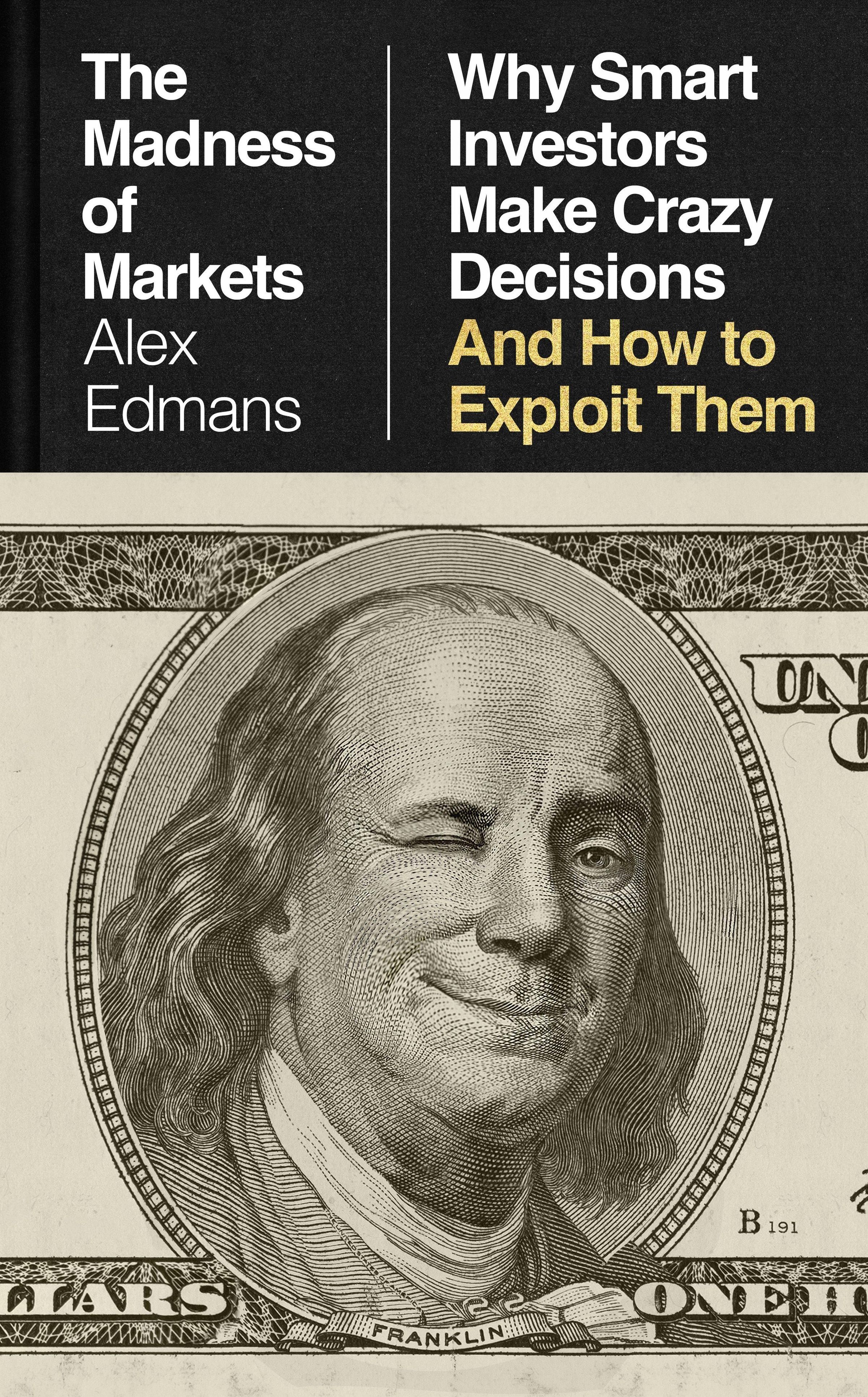 Text links: "The Madness of Markets, Alex Edmans". Rechts: "Why Smart Investors Make Crazy Decisions And How to Exploit Them". Darunter ein lächelnder Benjamin Franklin auf einer Banknote, der zwinkert., Buch
